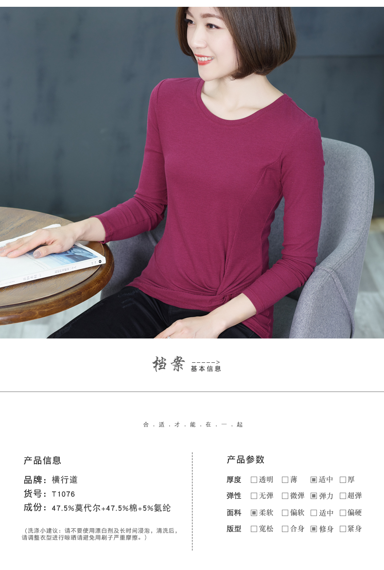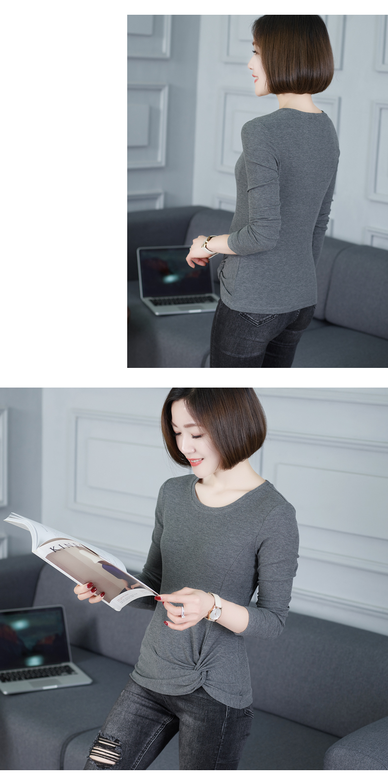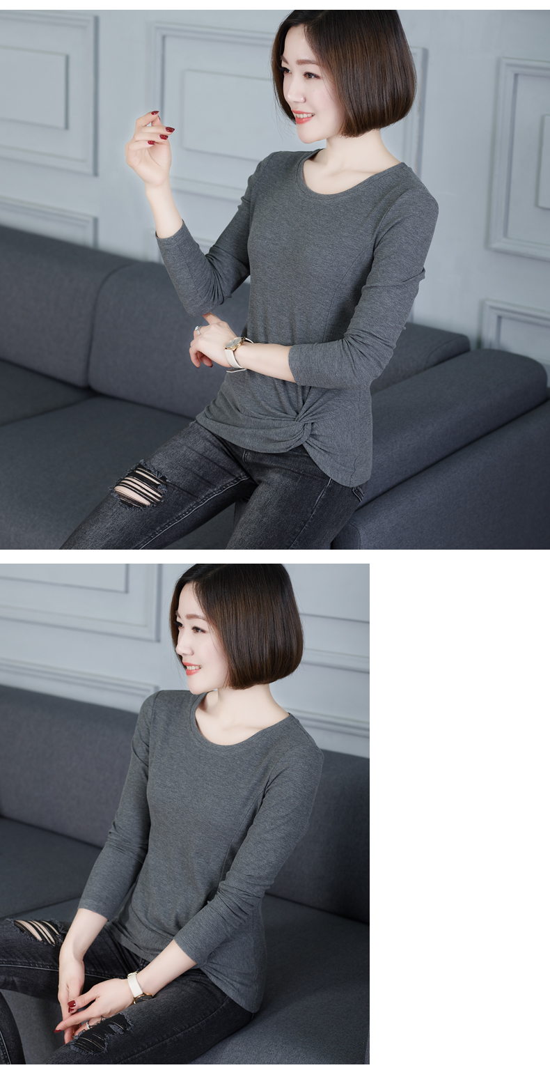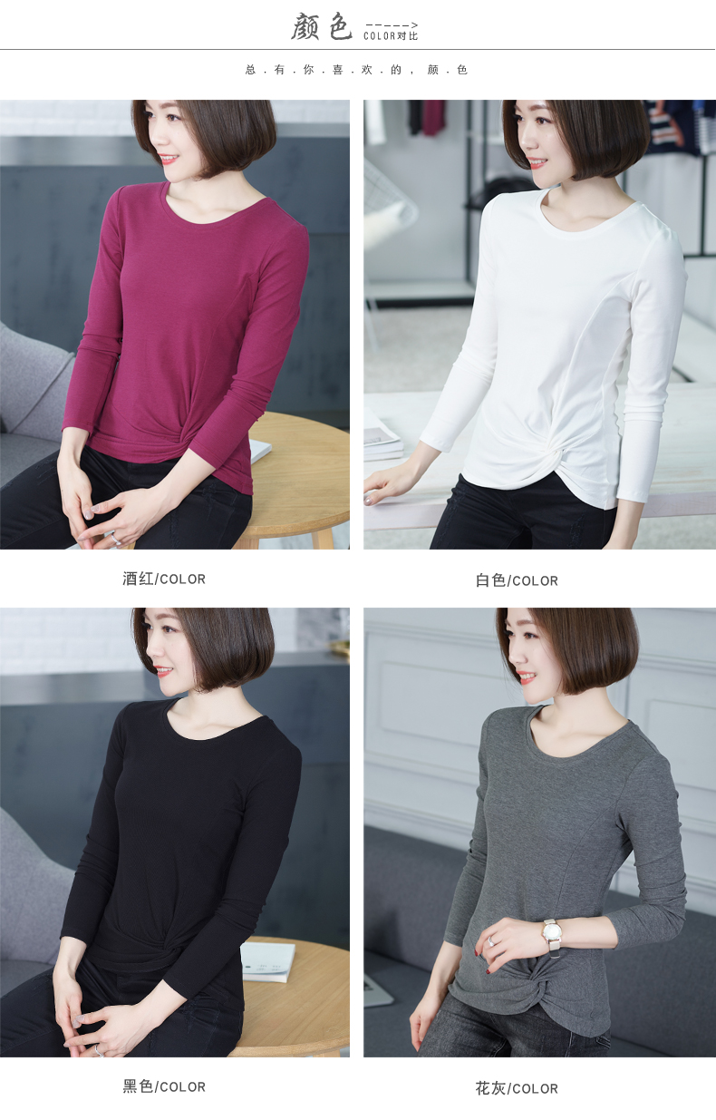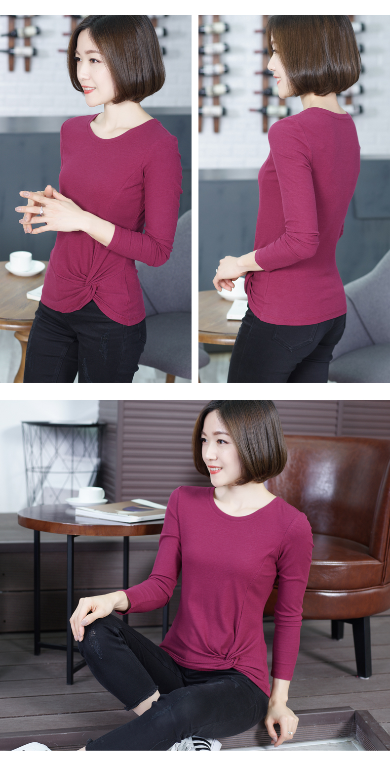 韓版女裝修身長袖圓領純色上衣服洋氣打底衫蝴蝶結莫代爾秋裝T恤1入