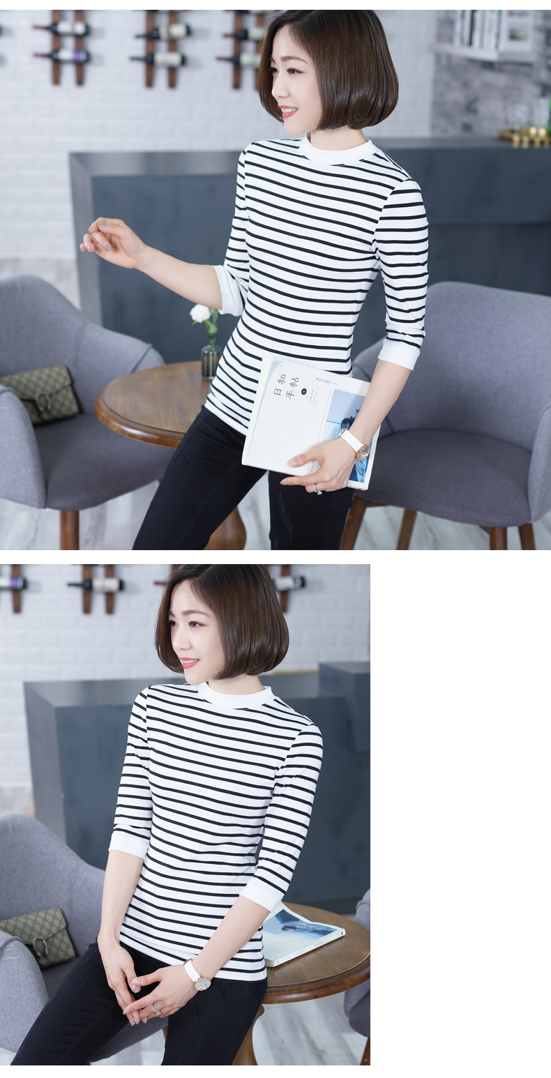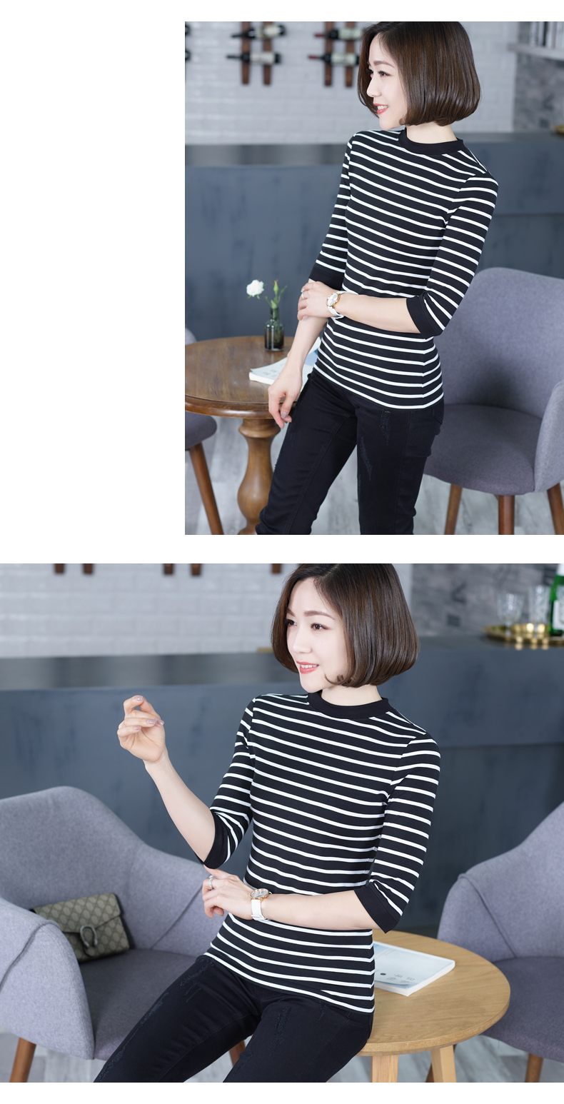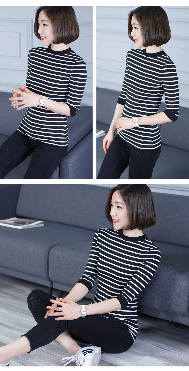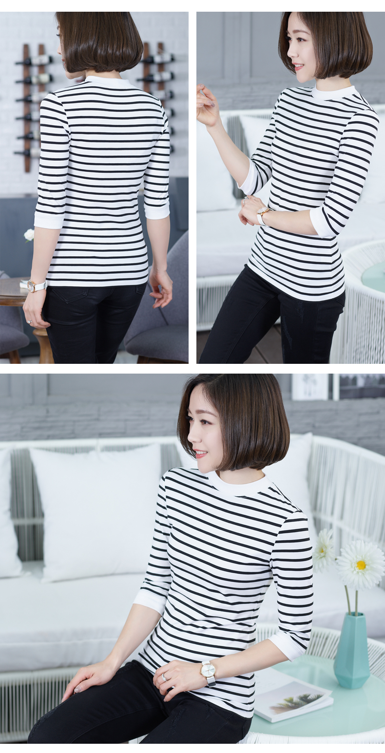 黑白條紋半高領秋裝打底衫女中長袖韓版修身半截袖t恤七分袖上衣1入