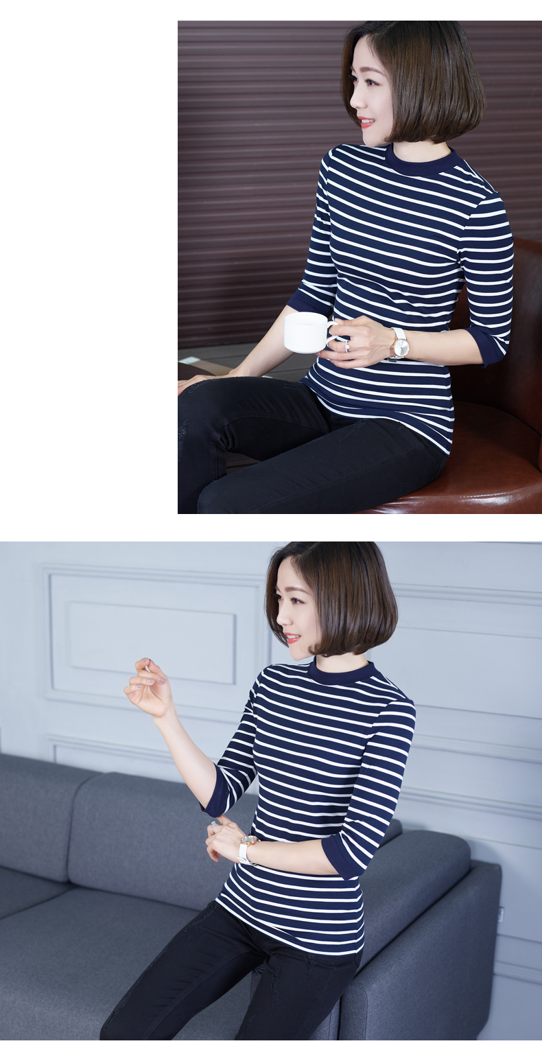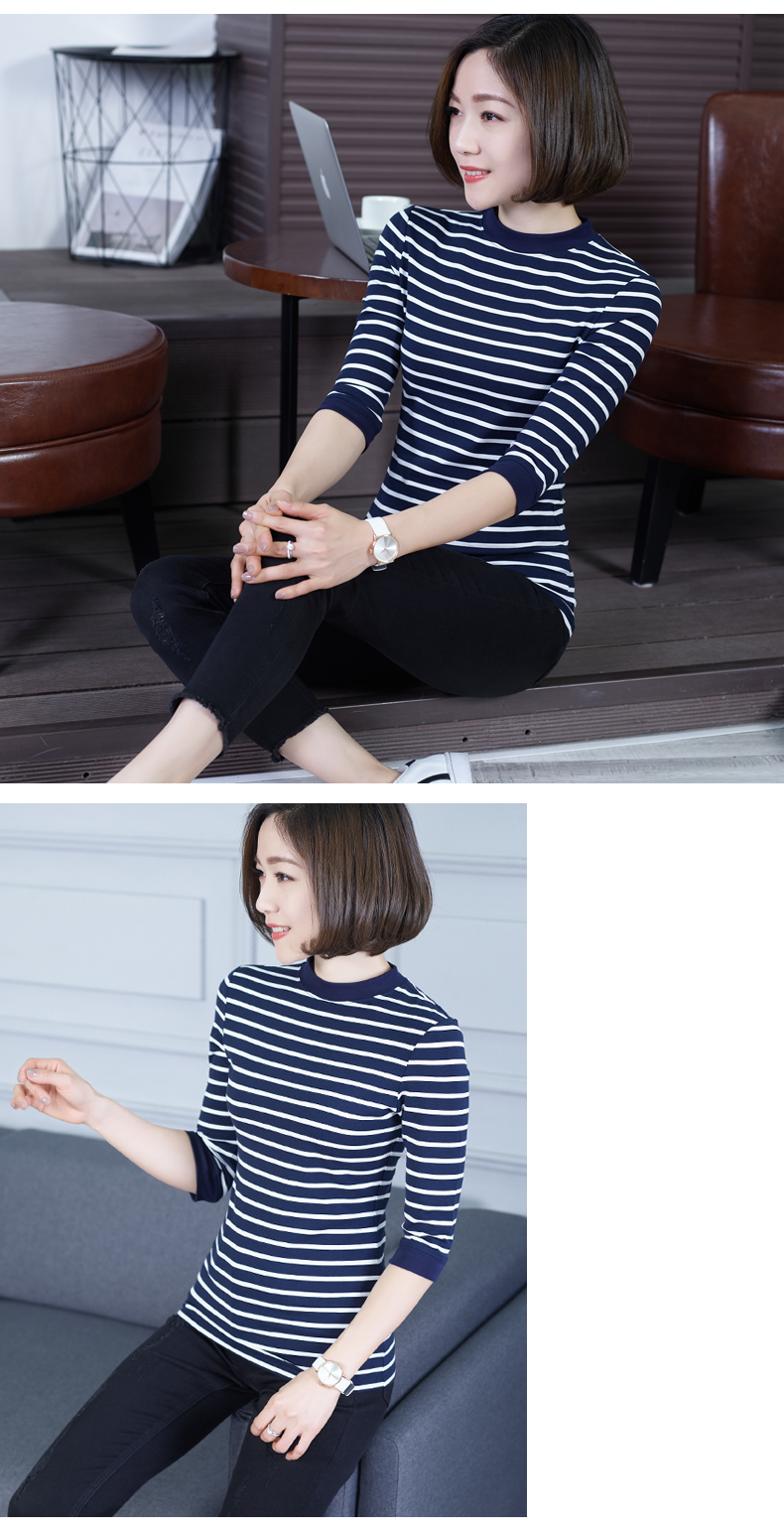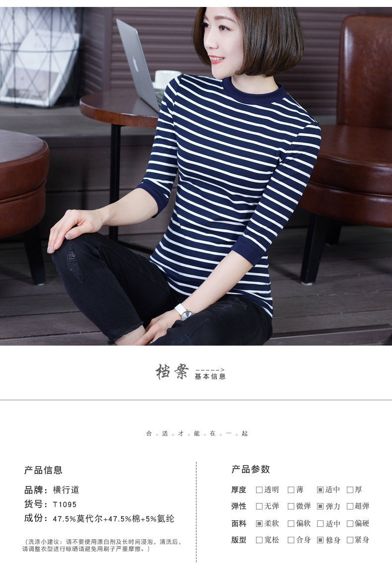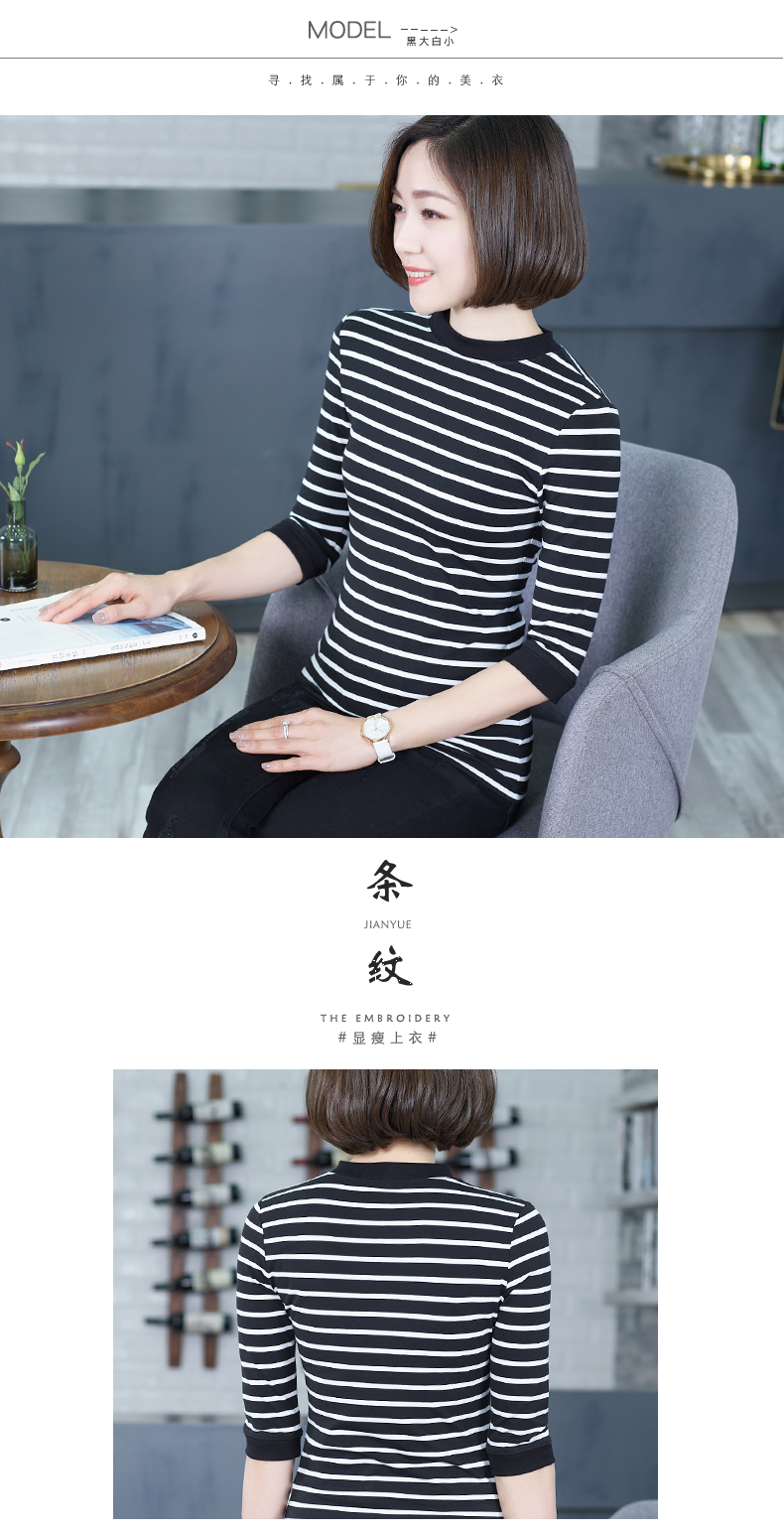 黑白條紋半高領秋裝打底衫女中長袖韓版修身半截袖t恤七分袖上衣1入