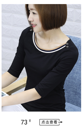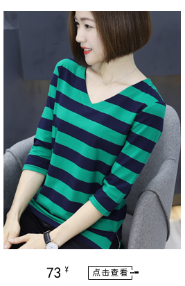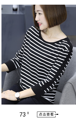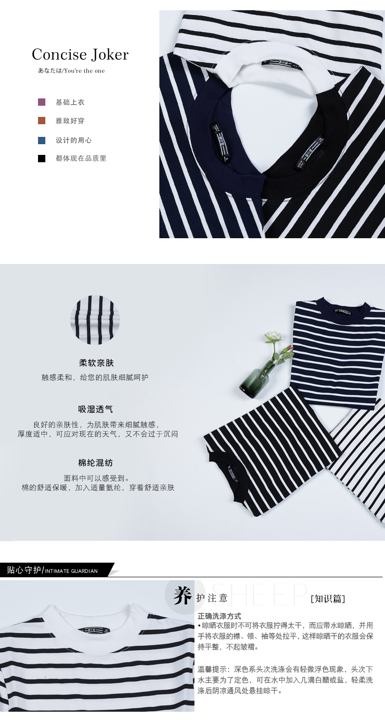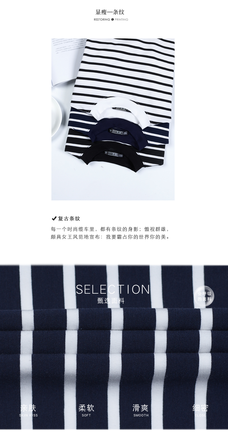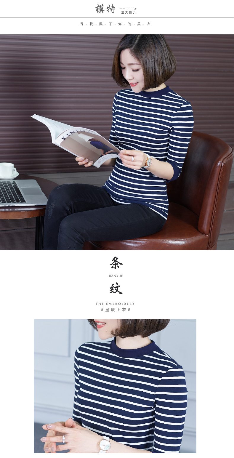 黑白條紋半高領秋裝打底衫女中長袖韓版修身半截袖t恤七分袖上衣1入