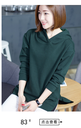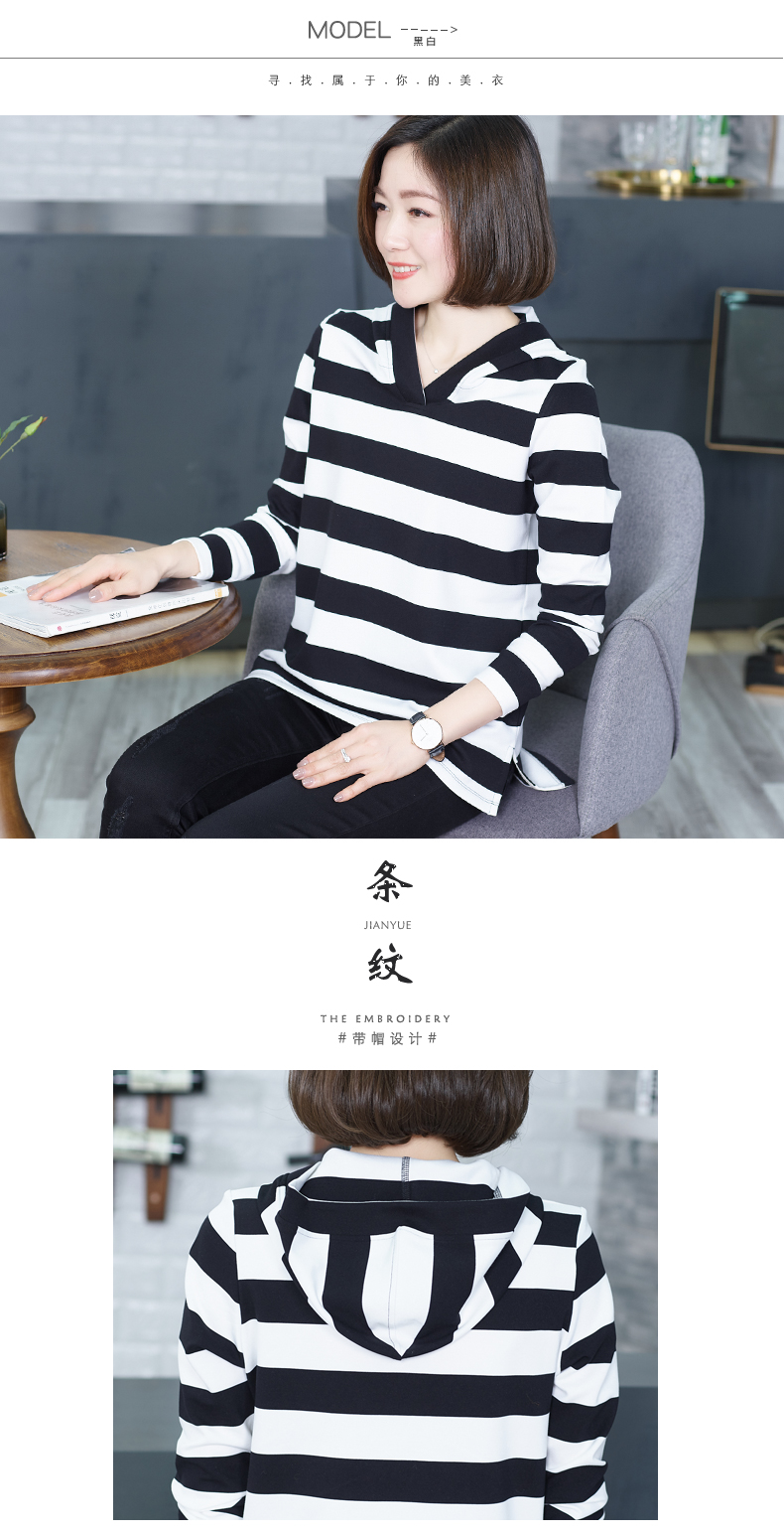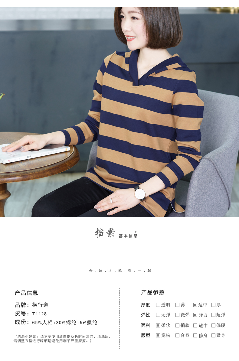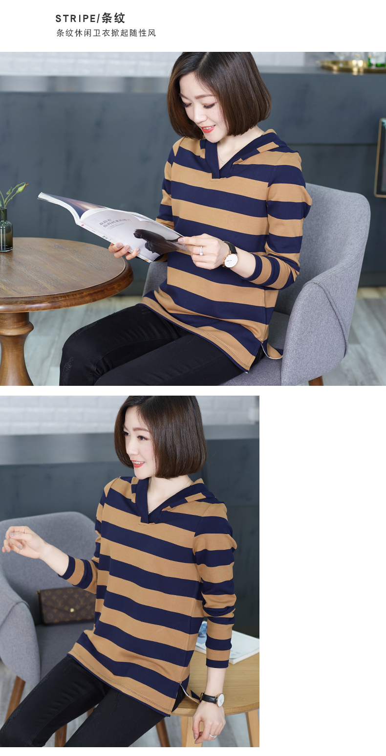 韓版大碼秋季v領打底衫連帽條紋中長款上衣寬松長袖帶帽衛衣t恤女1入