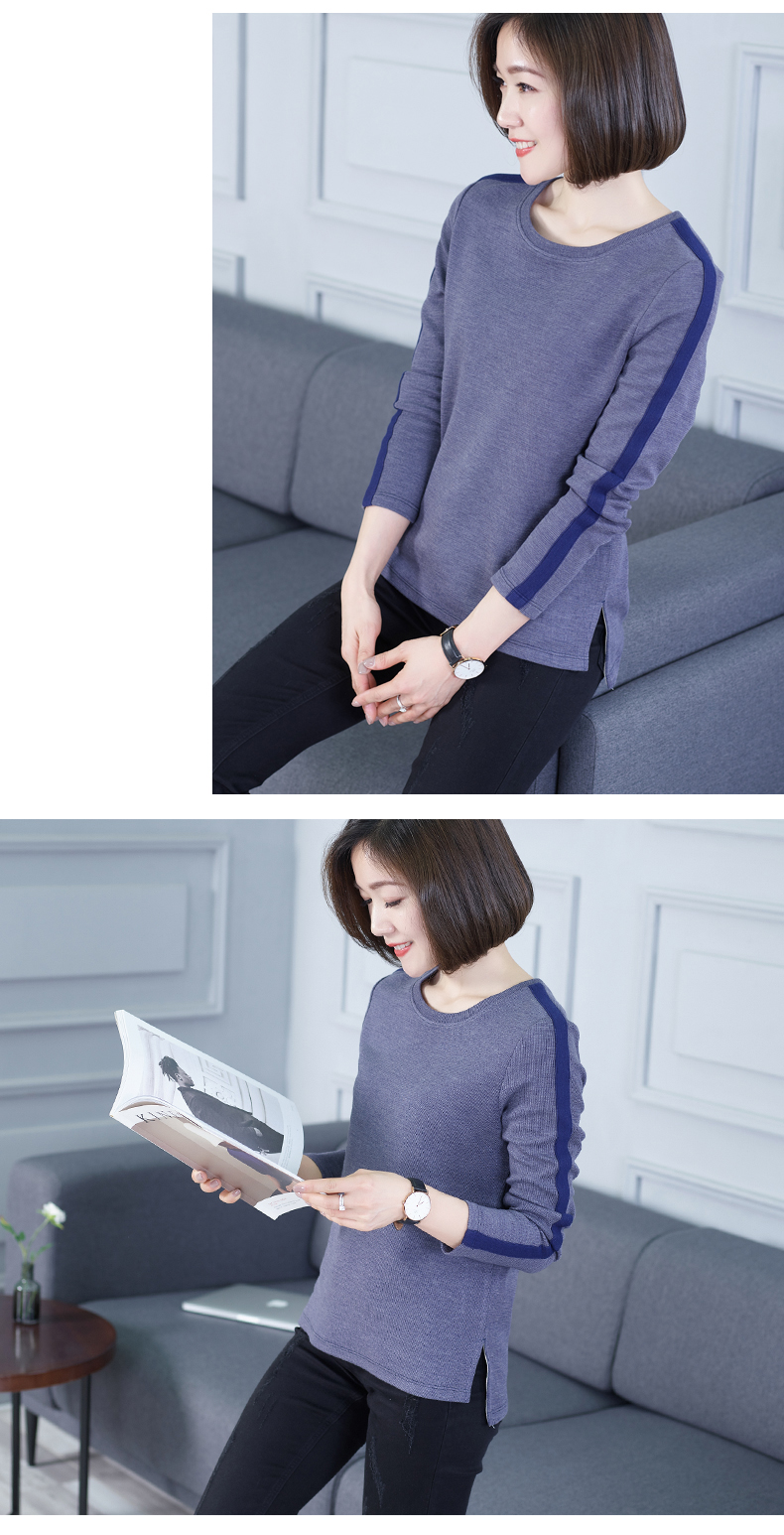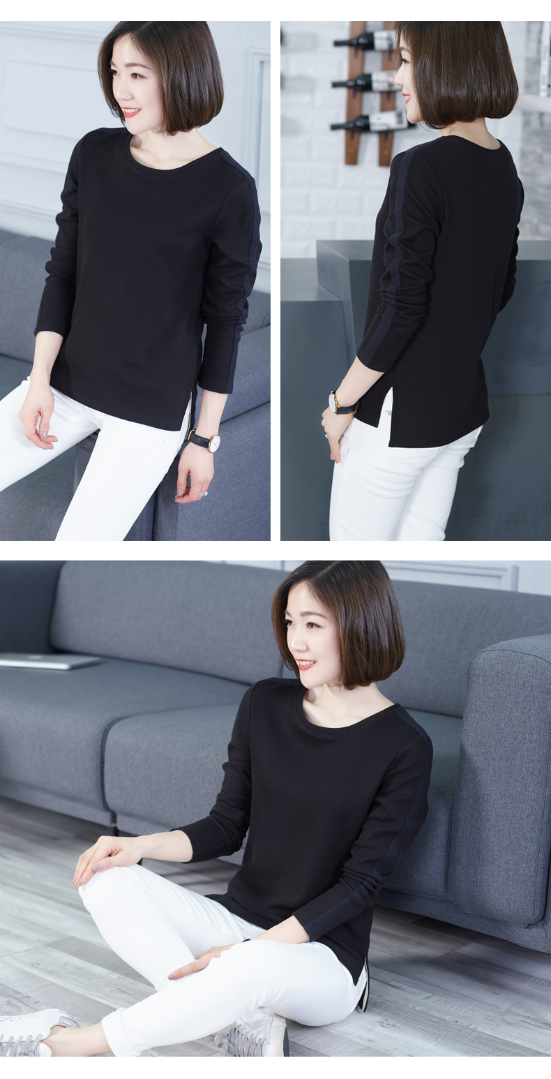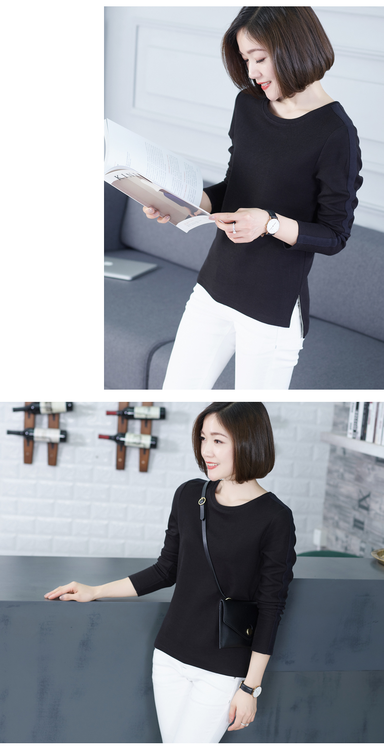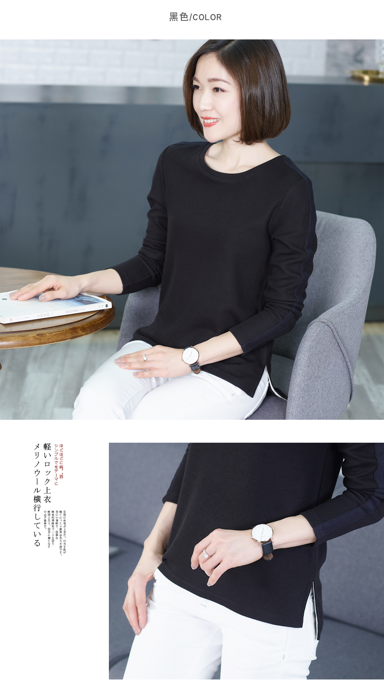 韓版大碼女裝圓領寬松長袖撞色拼接打底衫開叉上衣服純色T恤秋裝1入