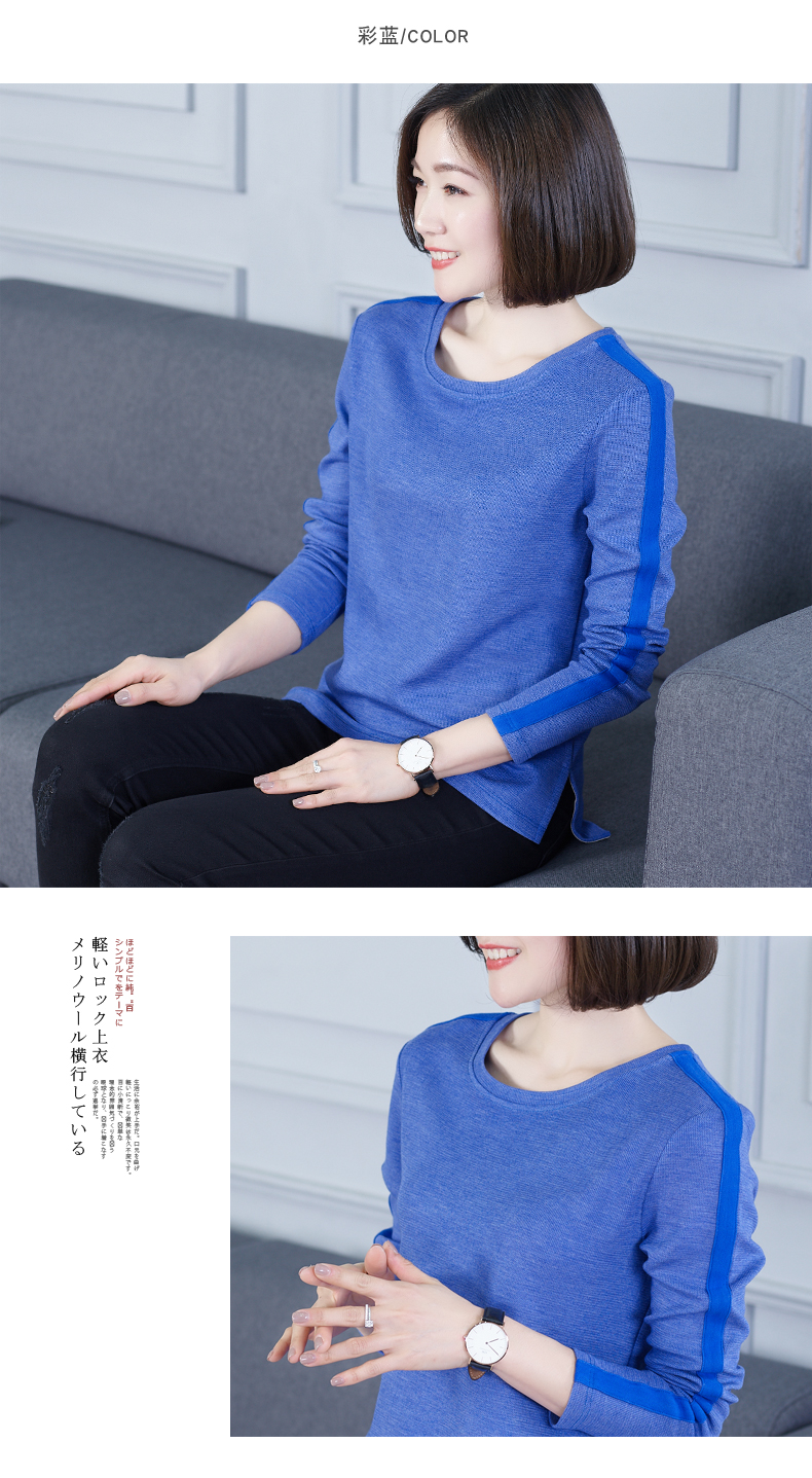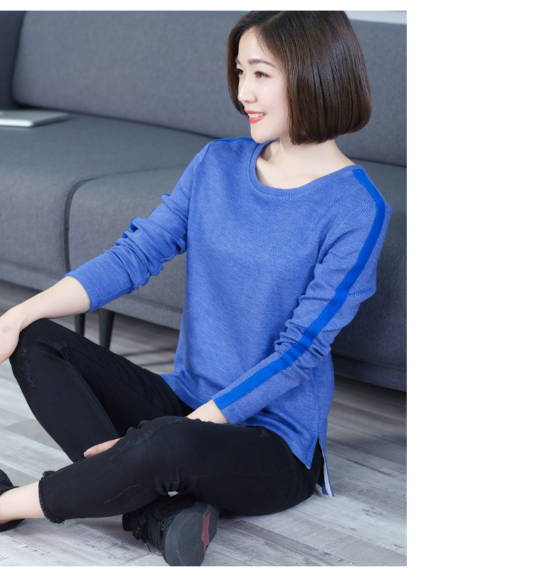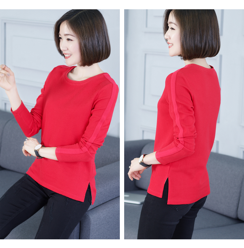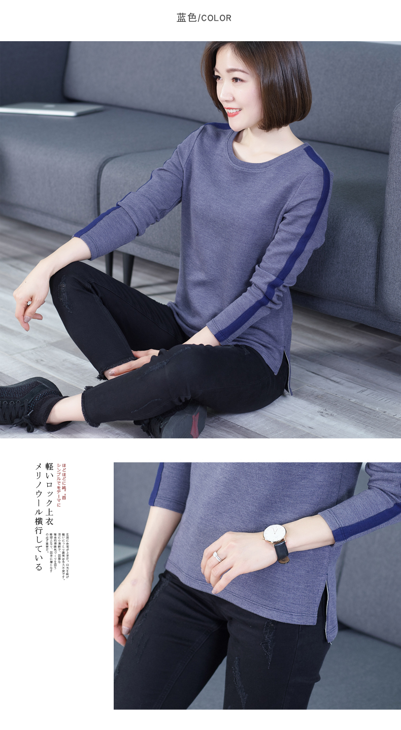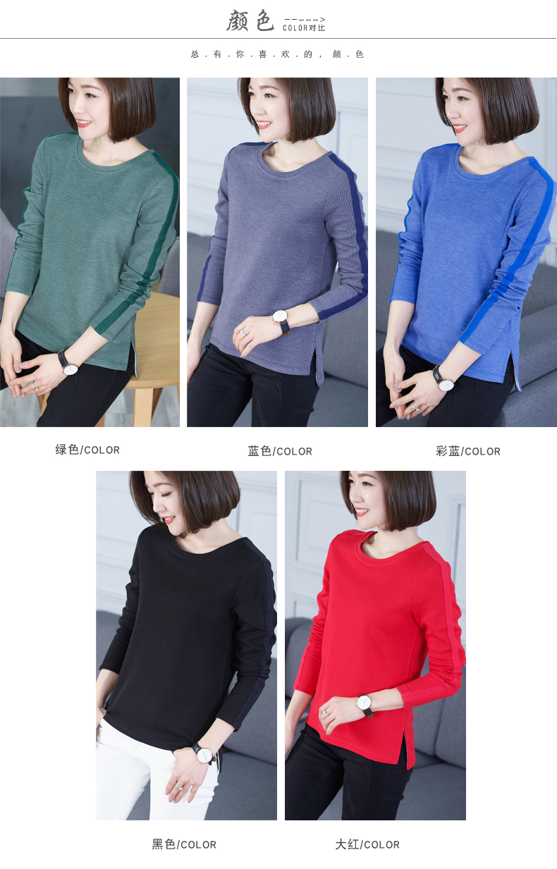 韓版大碼女裝圓領寬松長袖撞色拼接打底衫開叉上衣服純色T恤秋裝1入