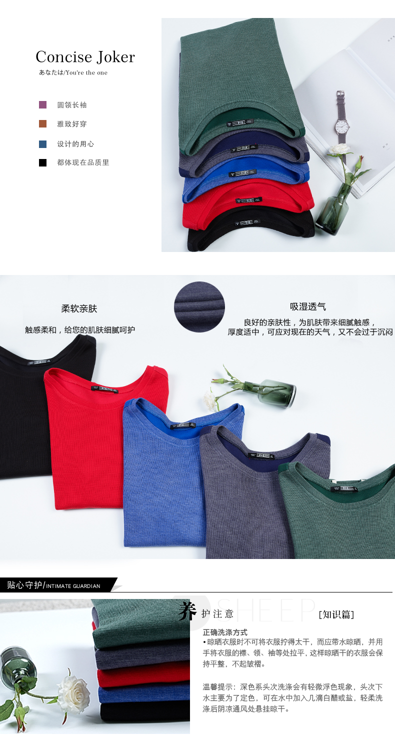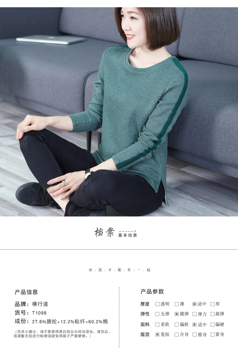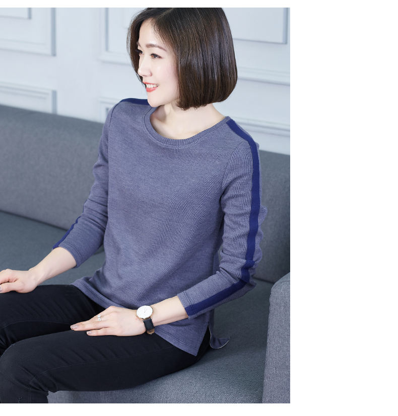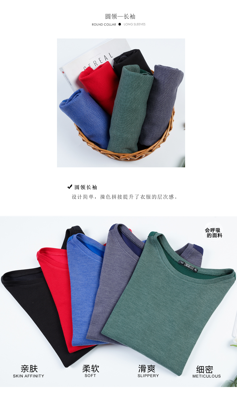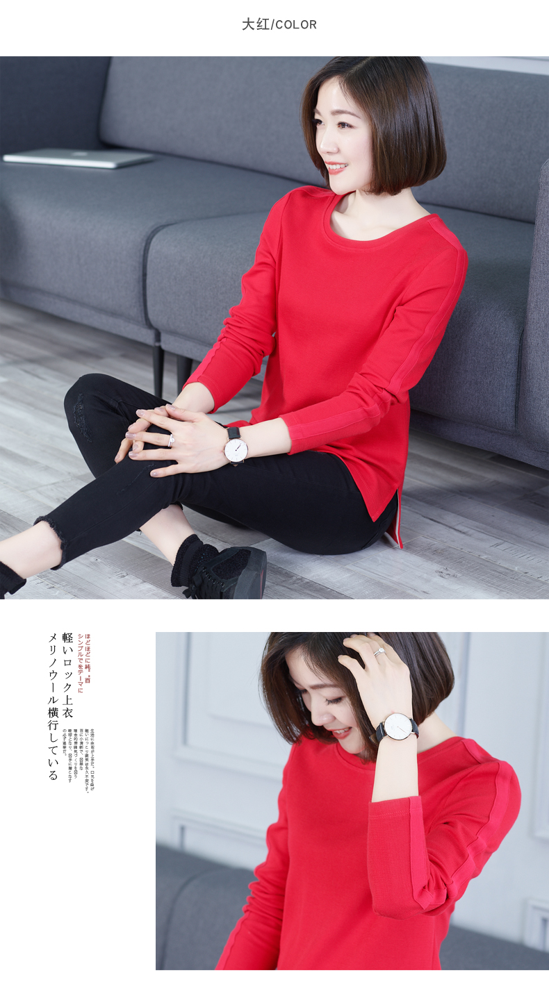 韓版大碼女裝圓領寬松長袖撞色拼接打底衫開叉上衣服純色T恤秋裝1入