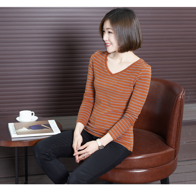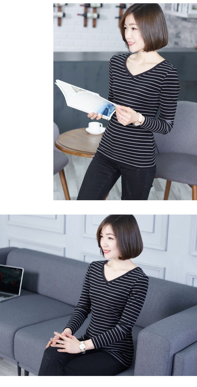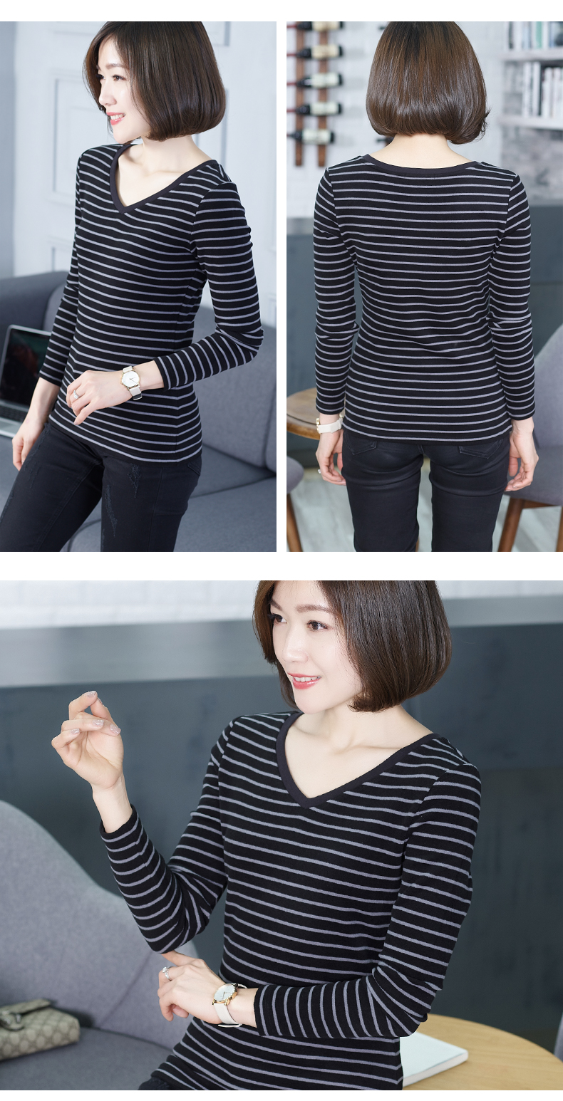 2019秋裝新款韓版女裝V領條紋打底衫加厚長袖t恤修身上衣內搭小衫1入