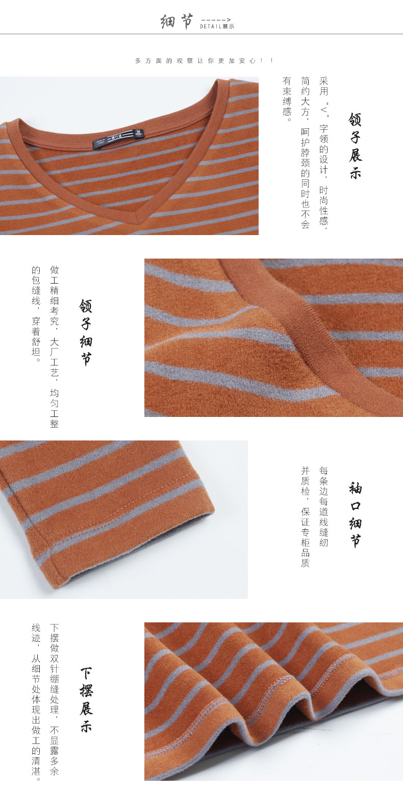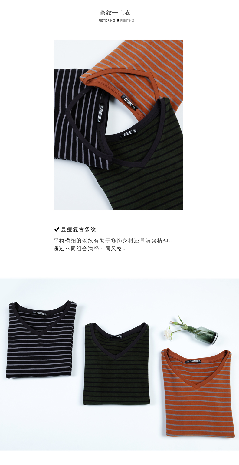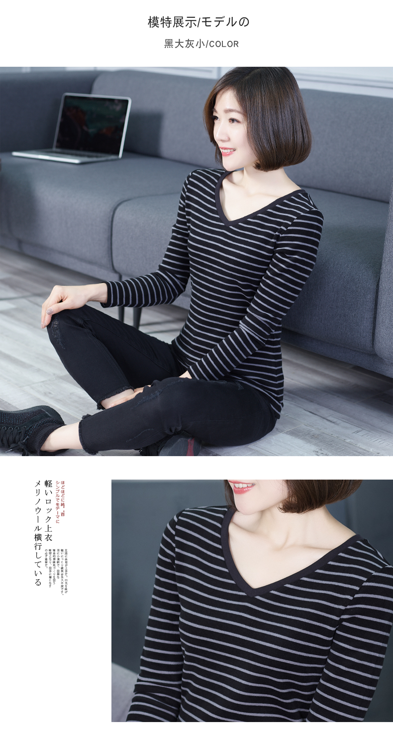2019秋裝新款韓版女裝V領條紋打底衫加厚長袖t恤修身上衣內搭小衫1入