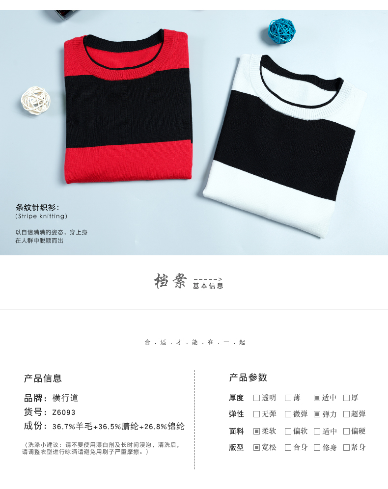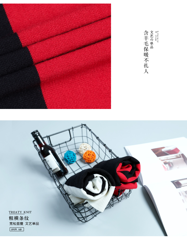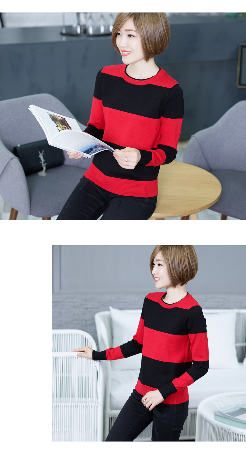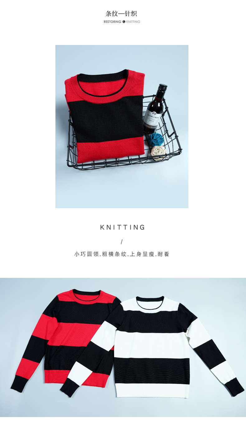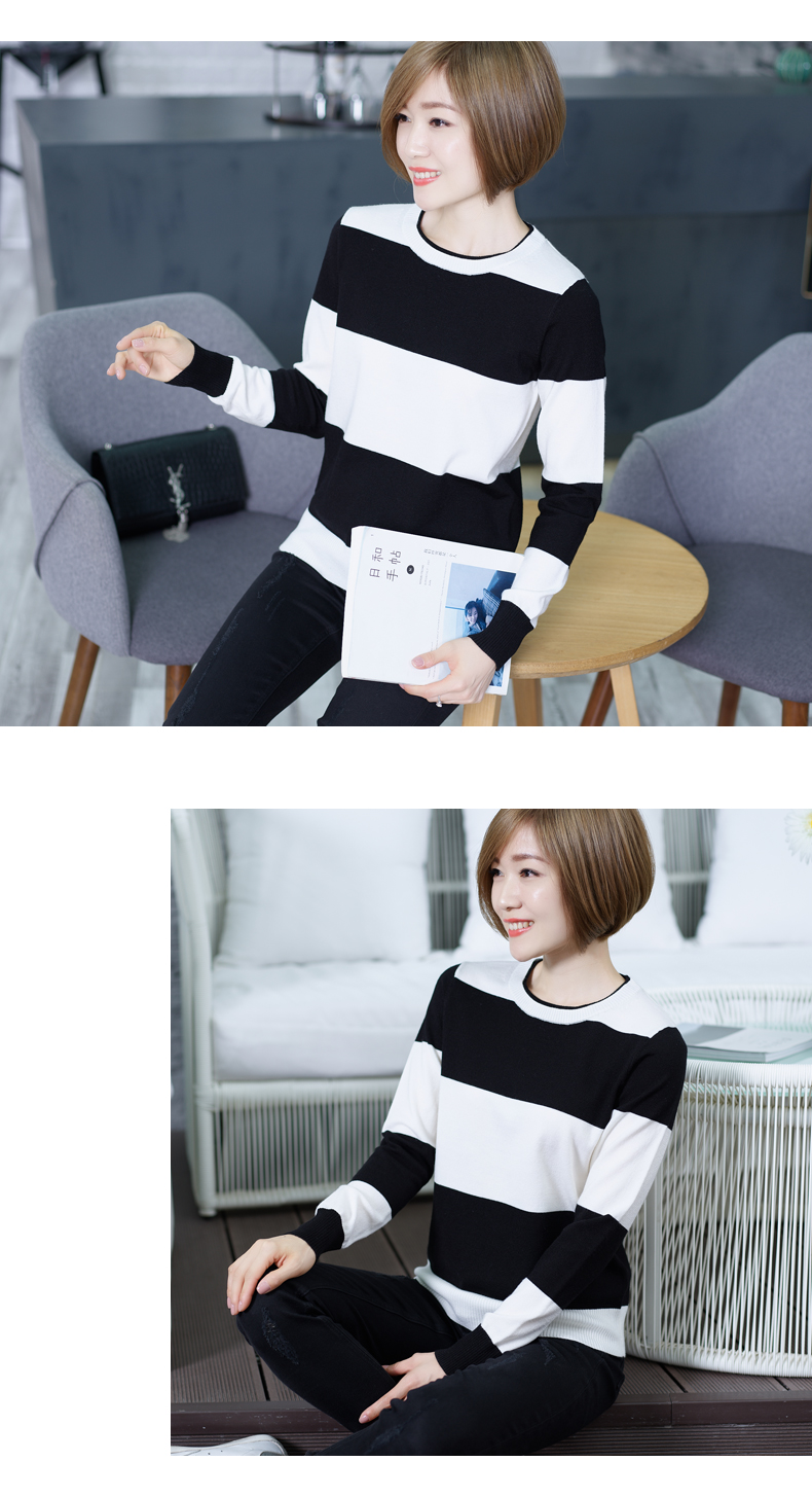 2019韓版秋裝新款女裝條紋套頭毛衣圓領上衣服寬松長袖針織打底衫1入
