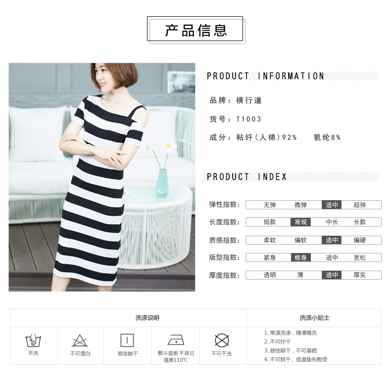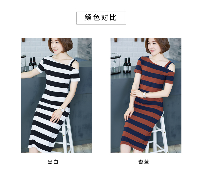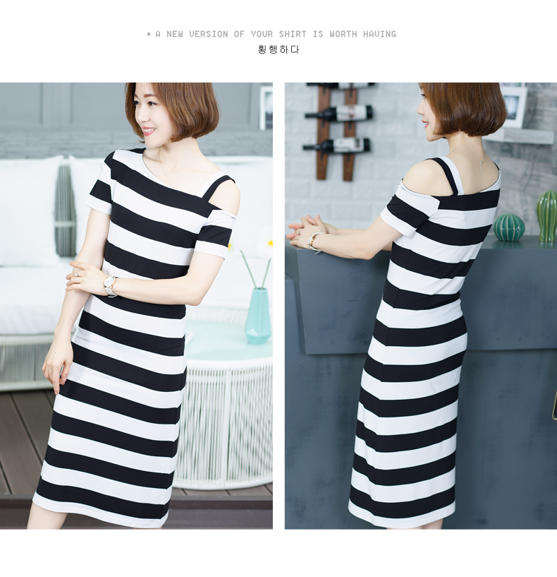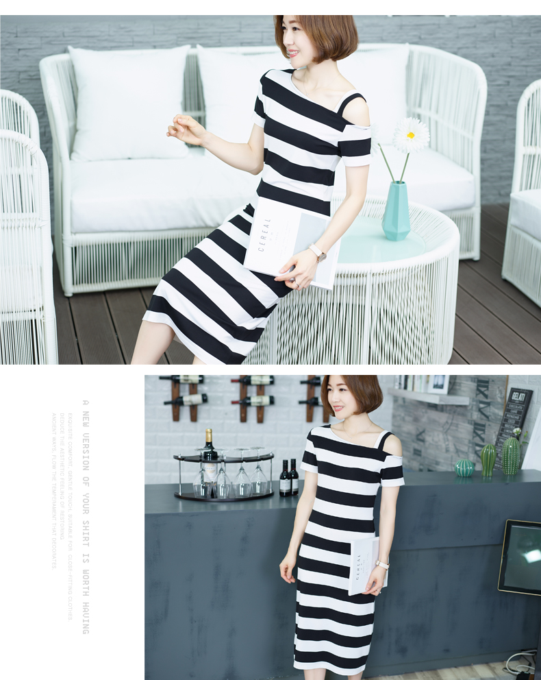 韓版女裝黑白條紋夏裝新款連衣裙露肩短袖中長款包臀裙斜肩裙子1入