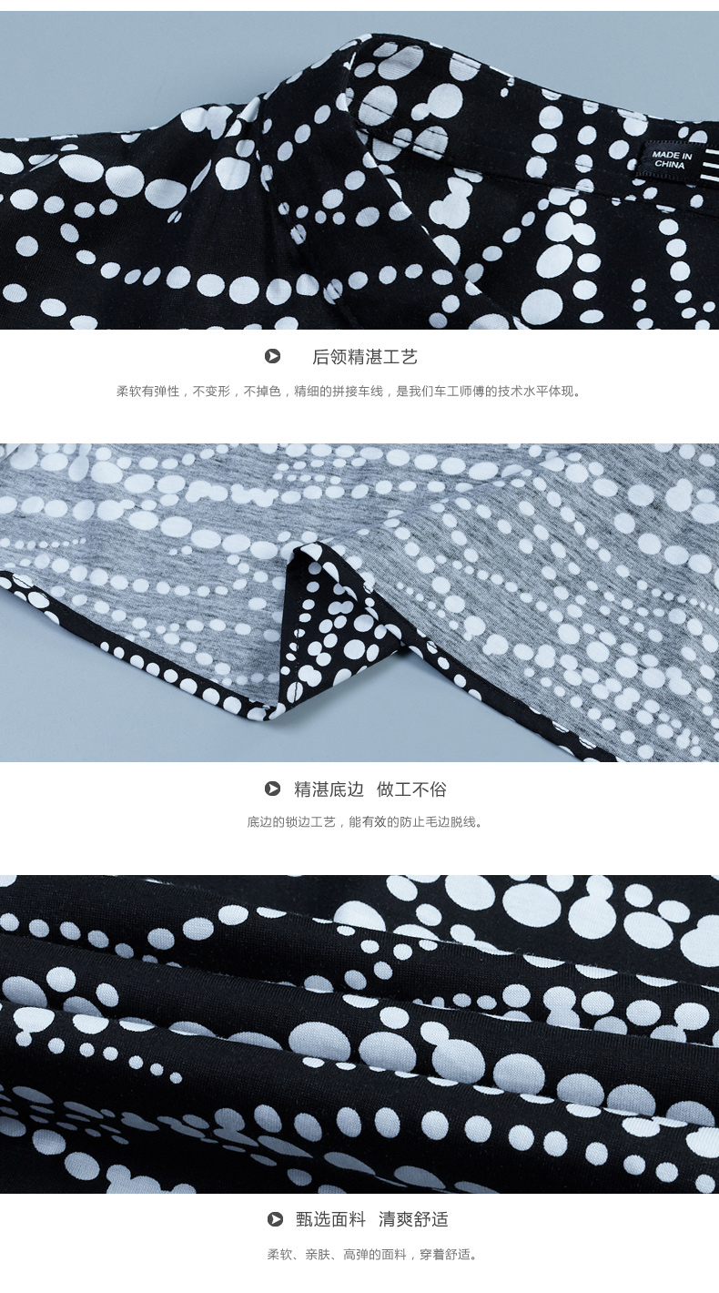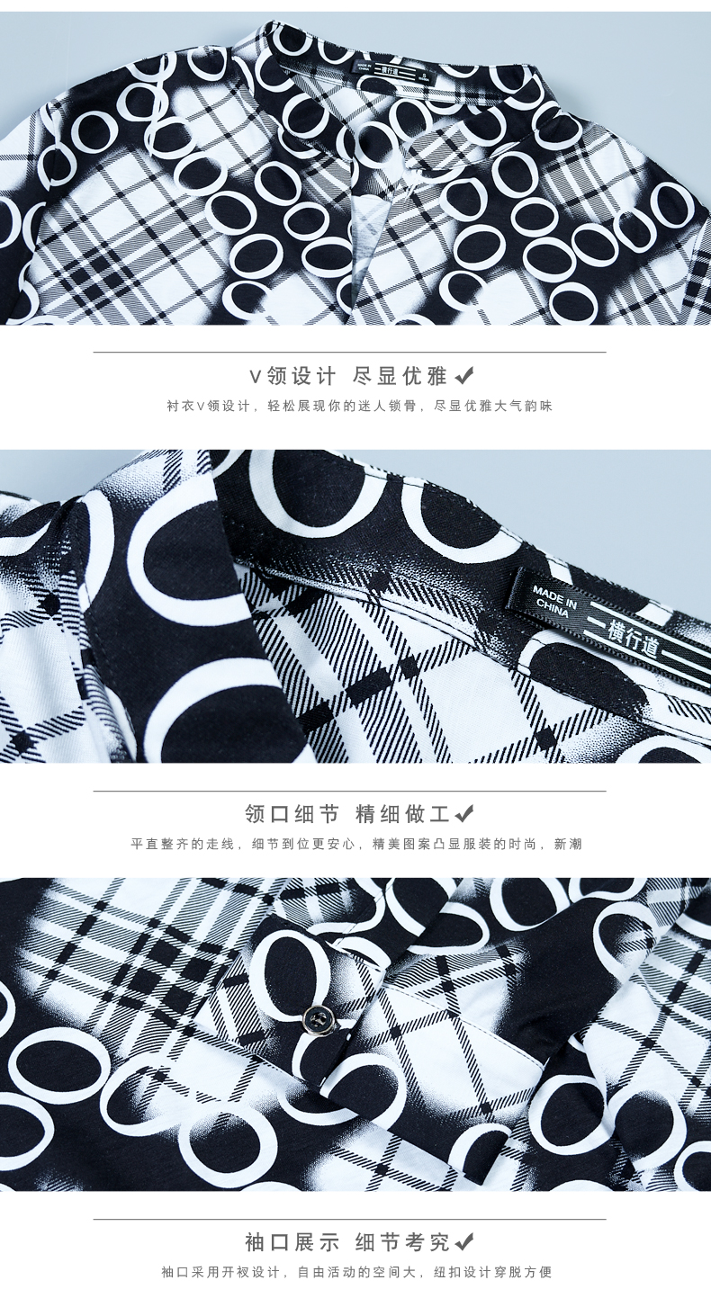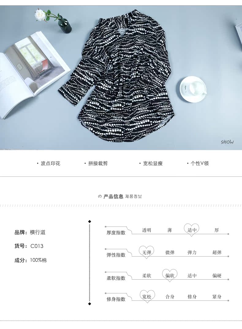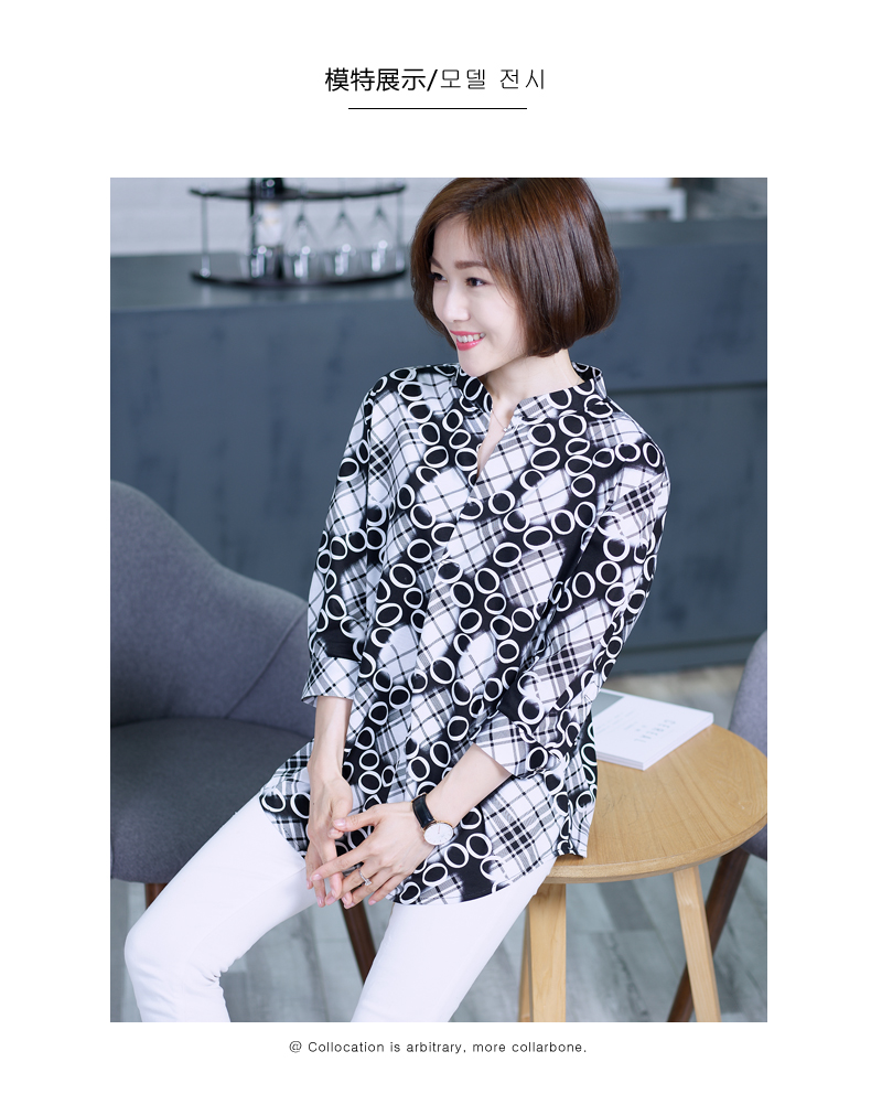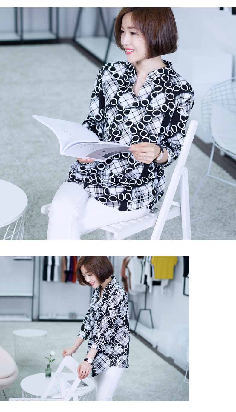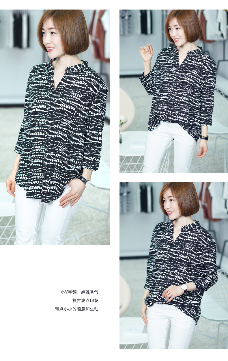 2019秋季印花t恤女襯衣襯衫設計感寬松中袖波點全棉上衣v領七分袖1入