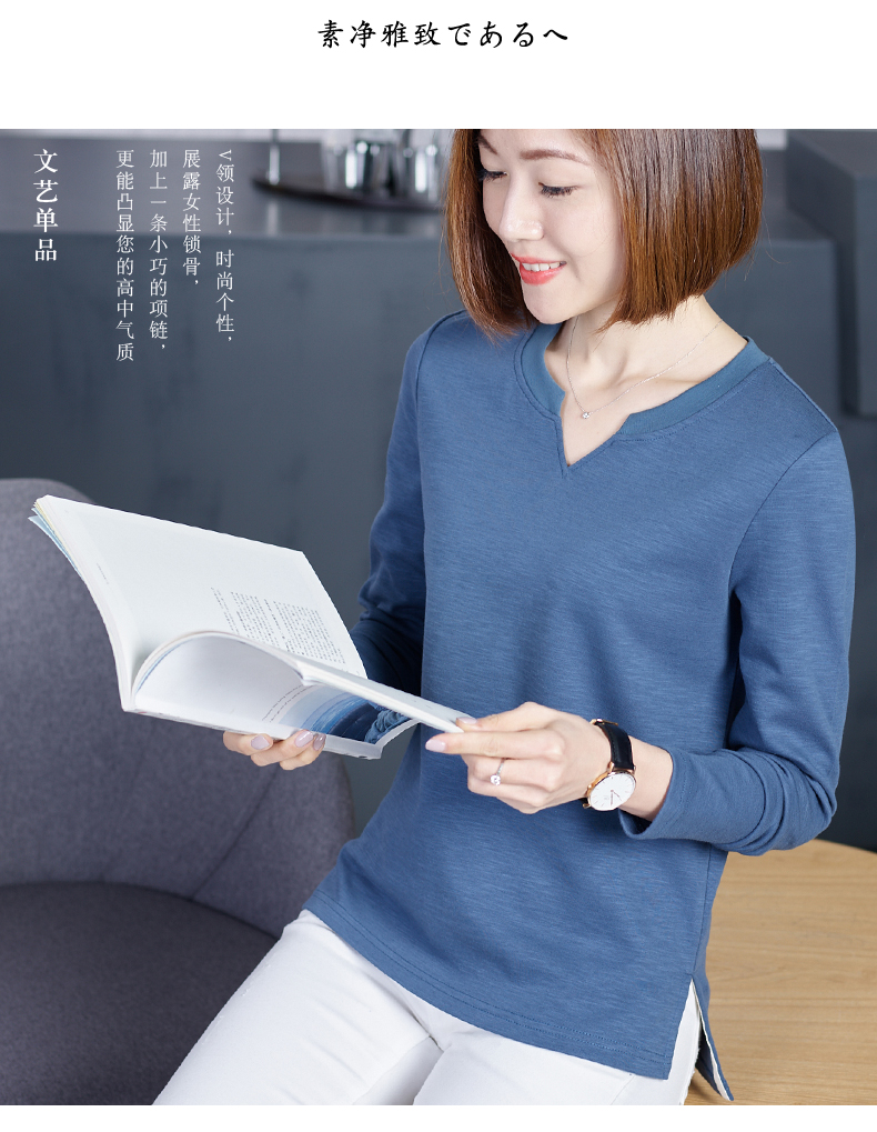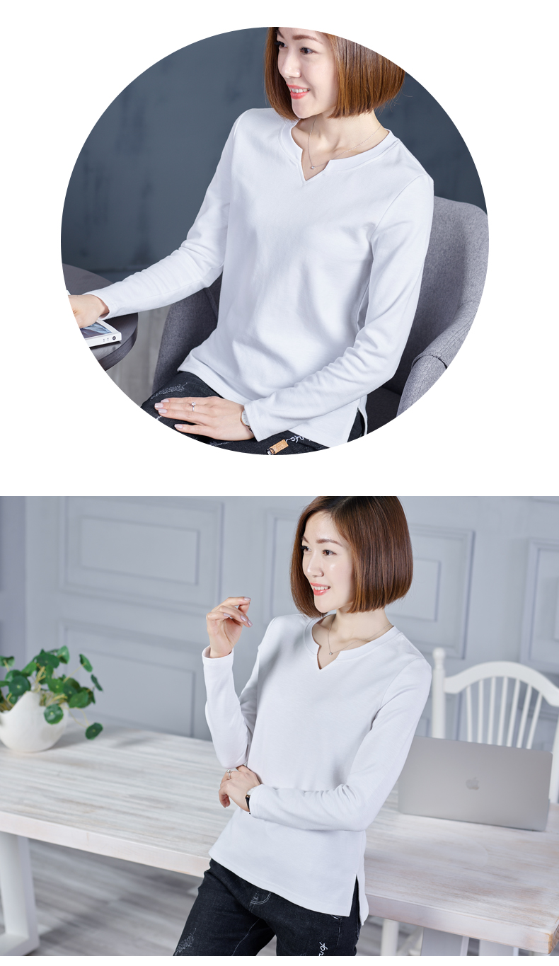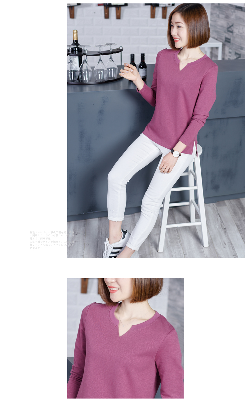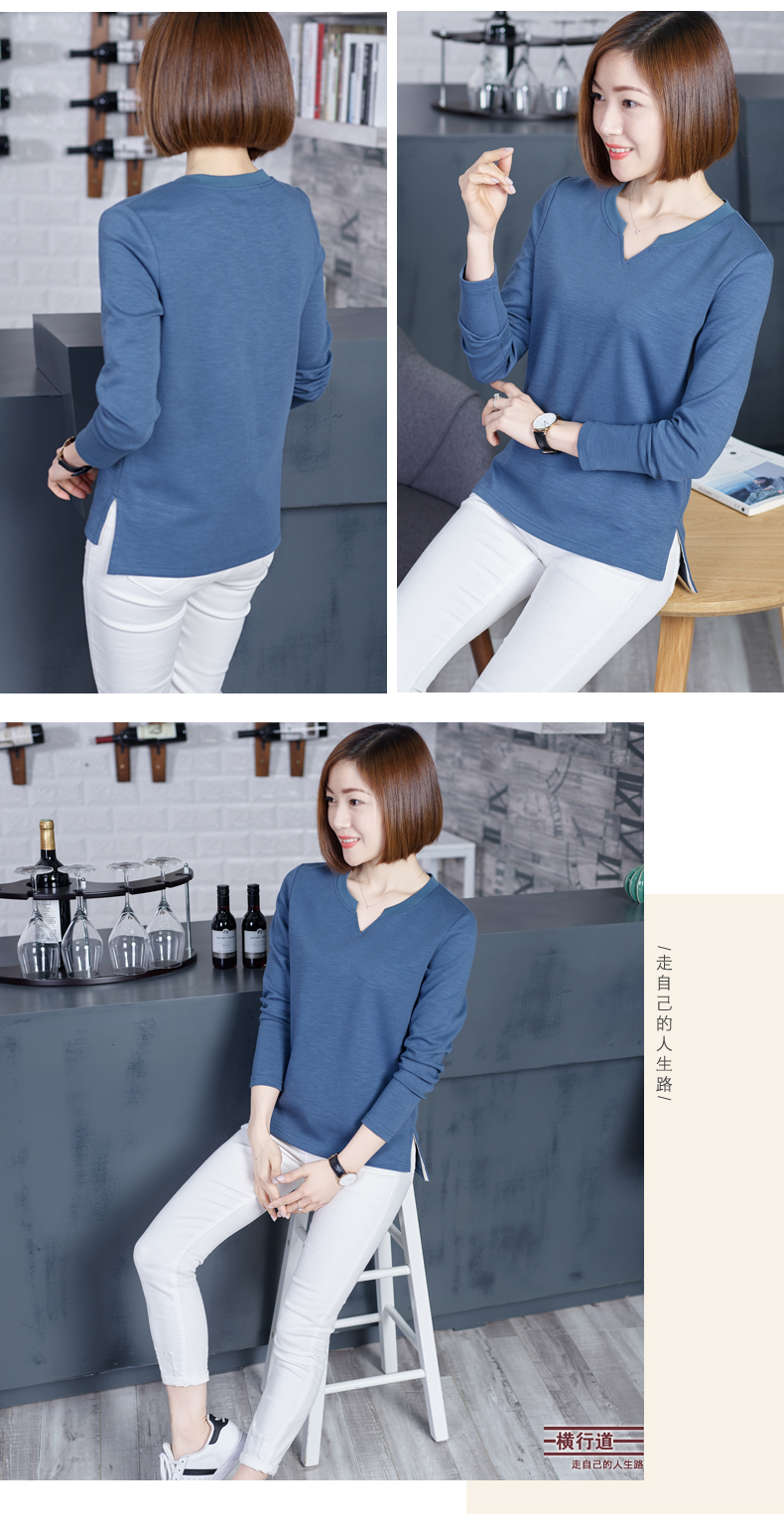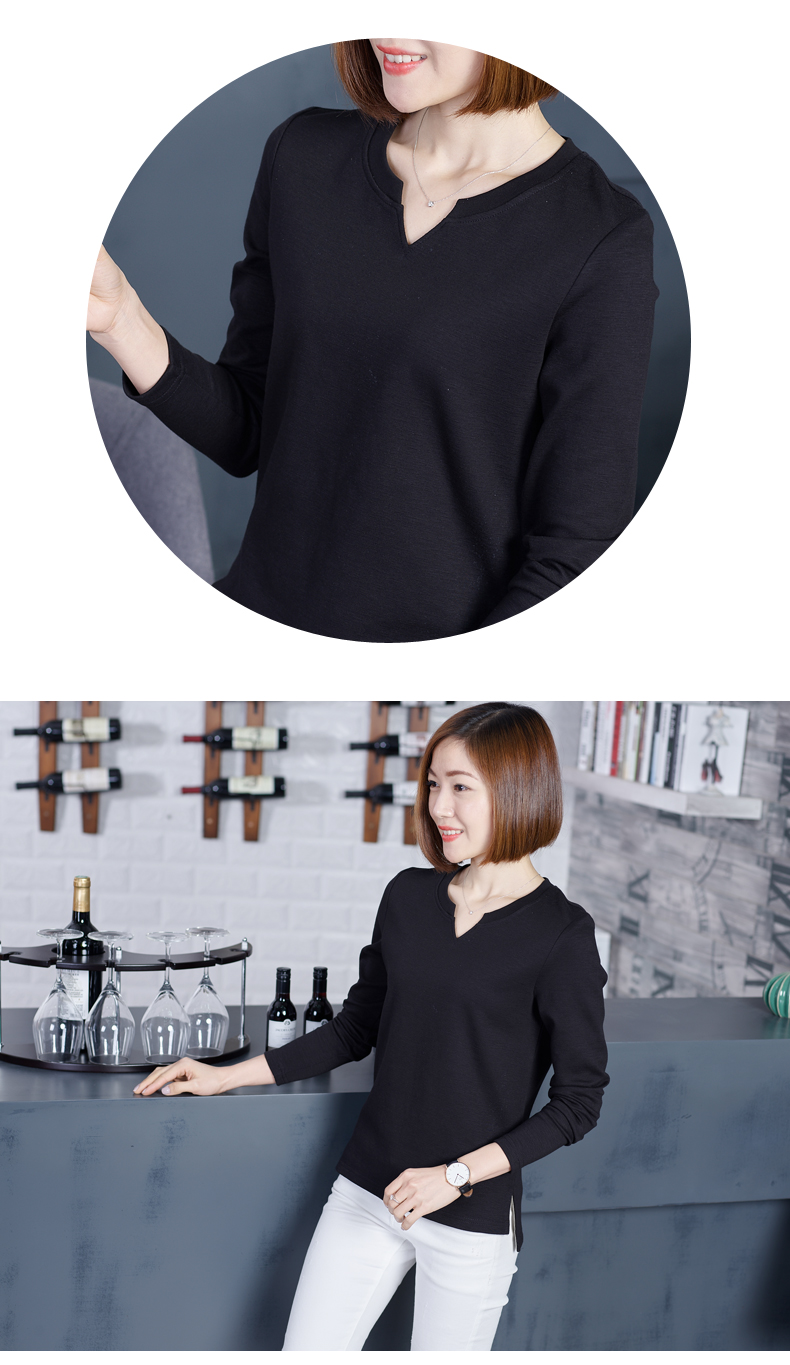 2019秋裝新款韓版上衣服寬松V領棉打底衫開叉秋款外穿長袖女T恤1入