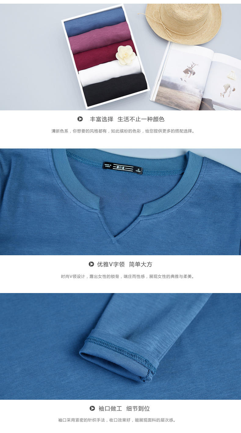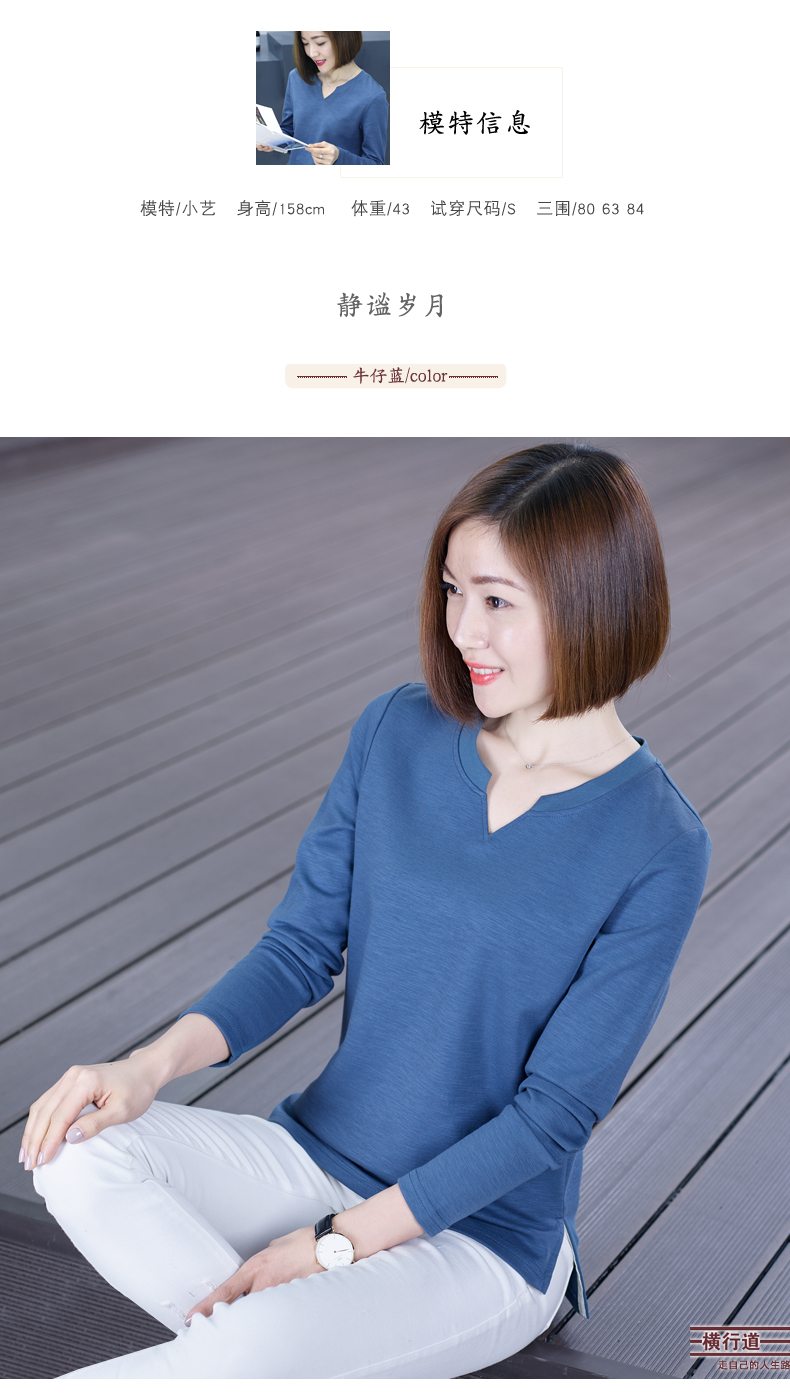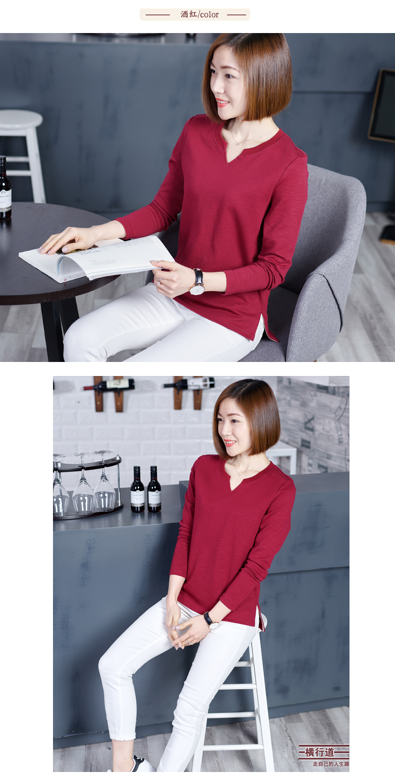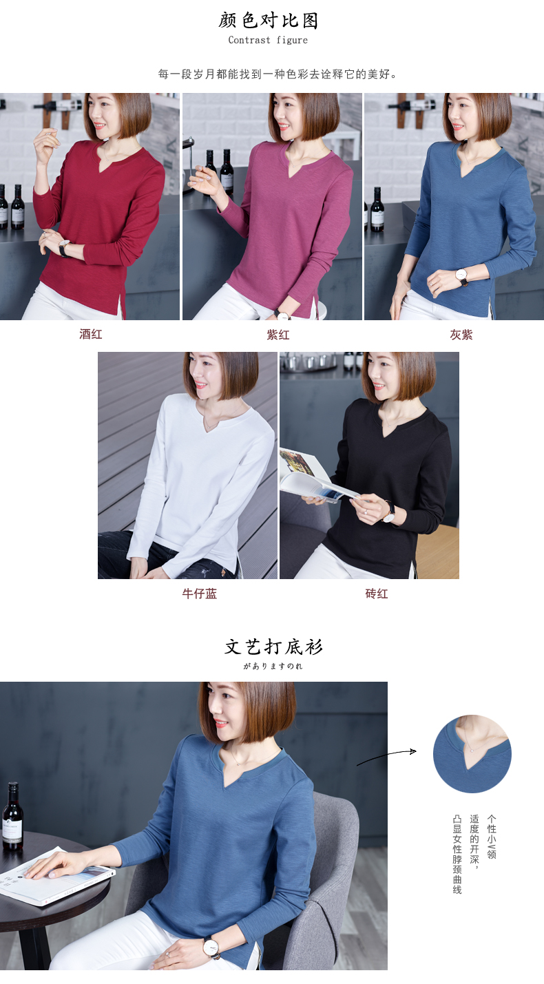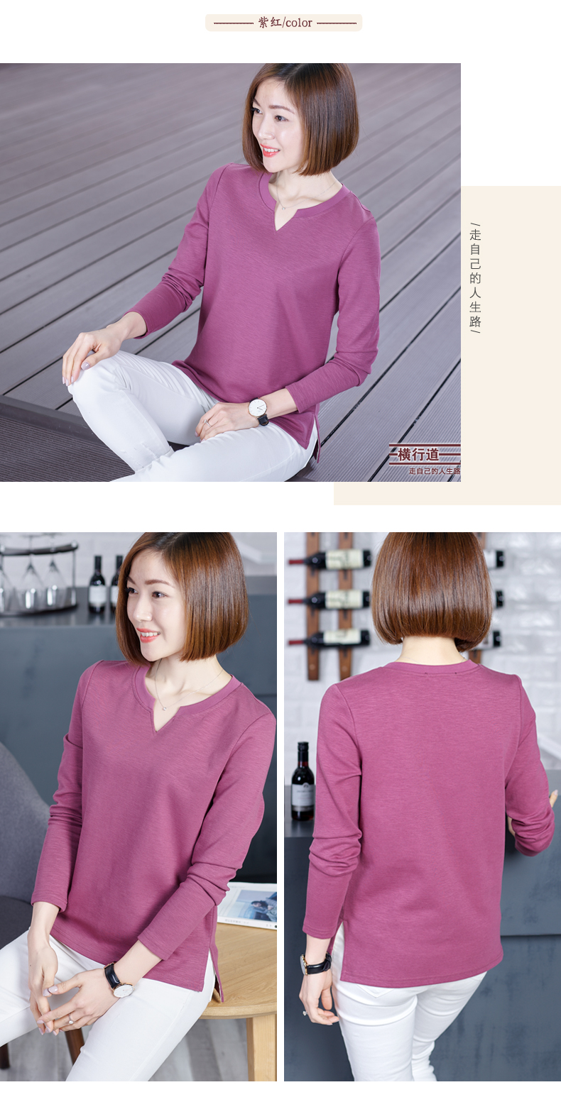2019秋裝新款韓版上衣服寬松V領棉打底衫開叉秋款外穿長袖女T恤1入