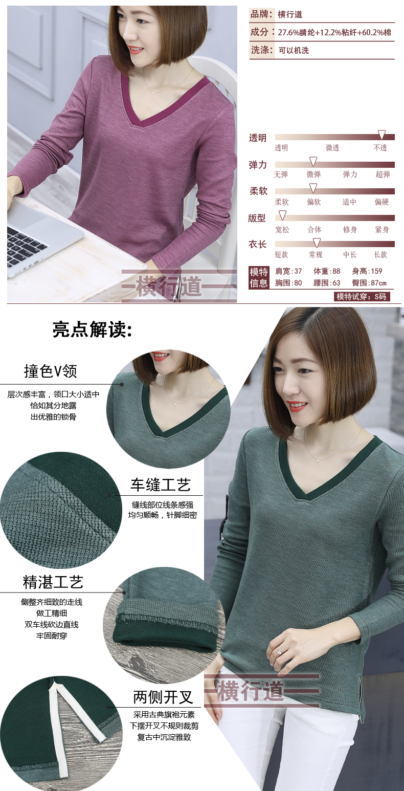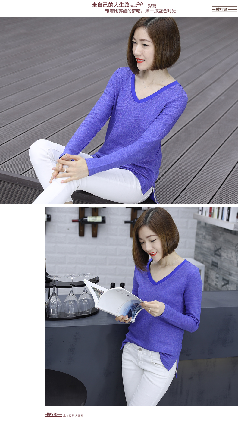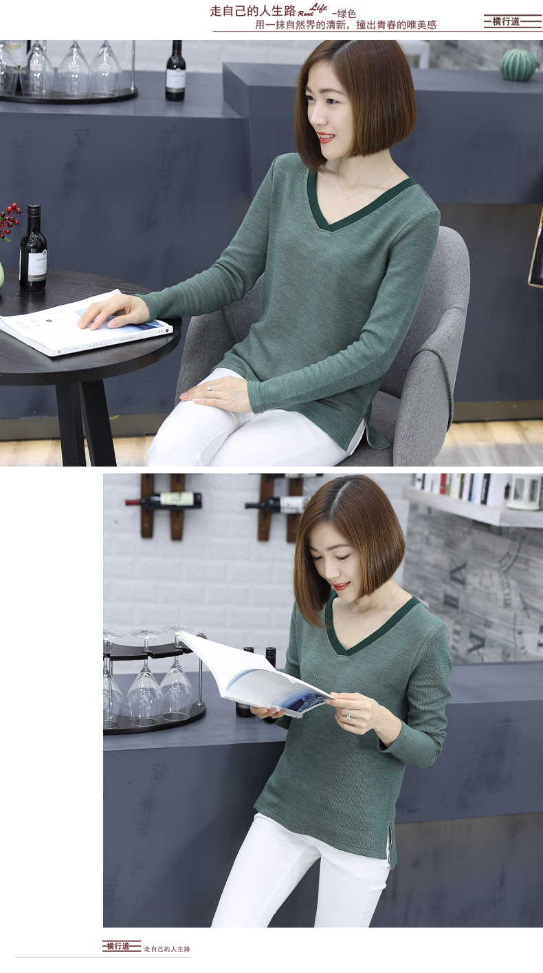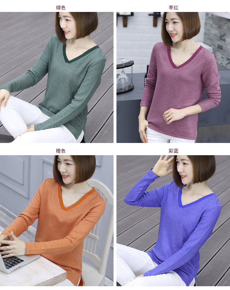 2019秋裝大碼女裝新款長袖t恤寬松外穿打底衫開叉撞色v領上衣服1入