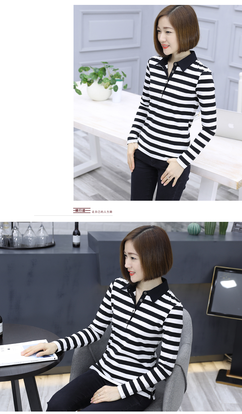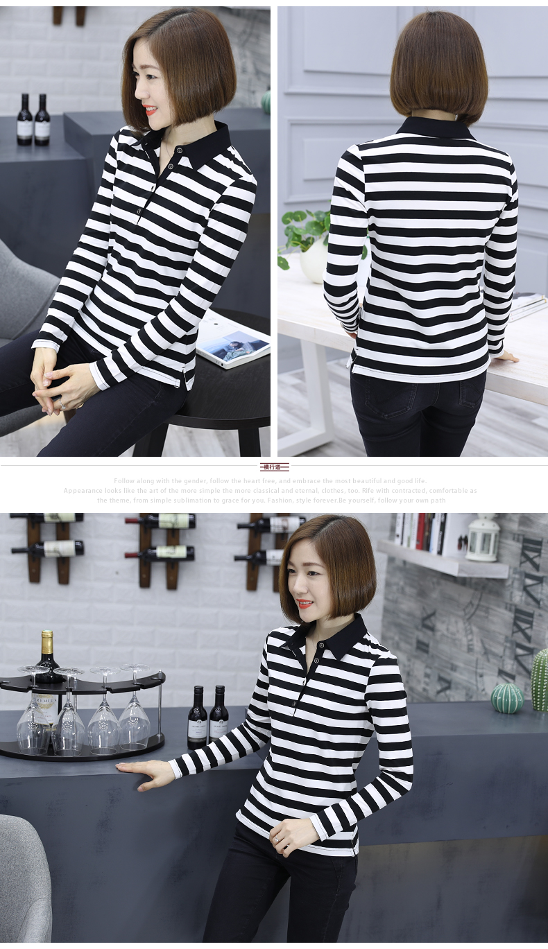 19秋季韓版秋裝新款女裝條紋長袖女打底衫有領翻領襯衫領t恤上衣1入