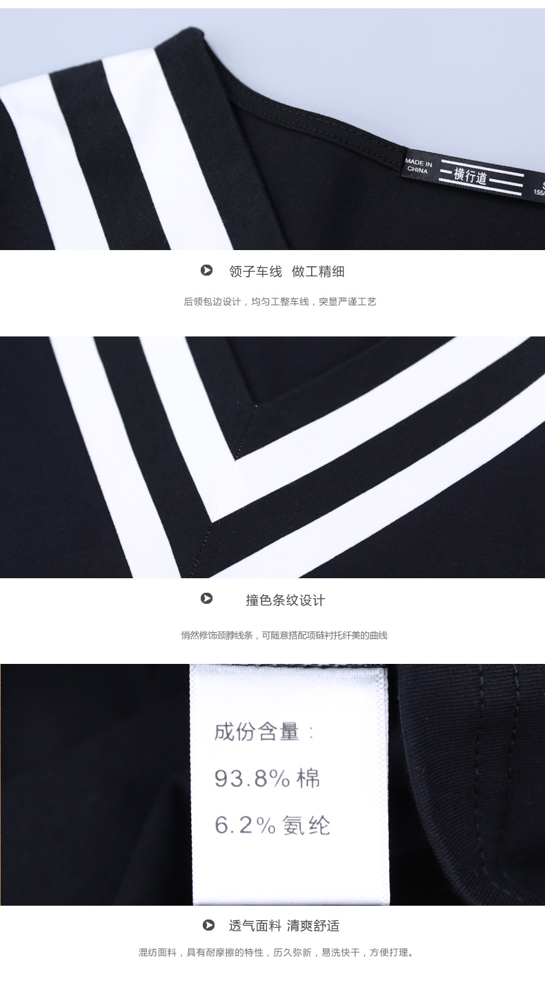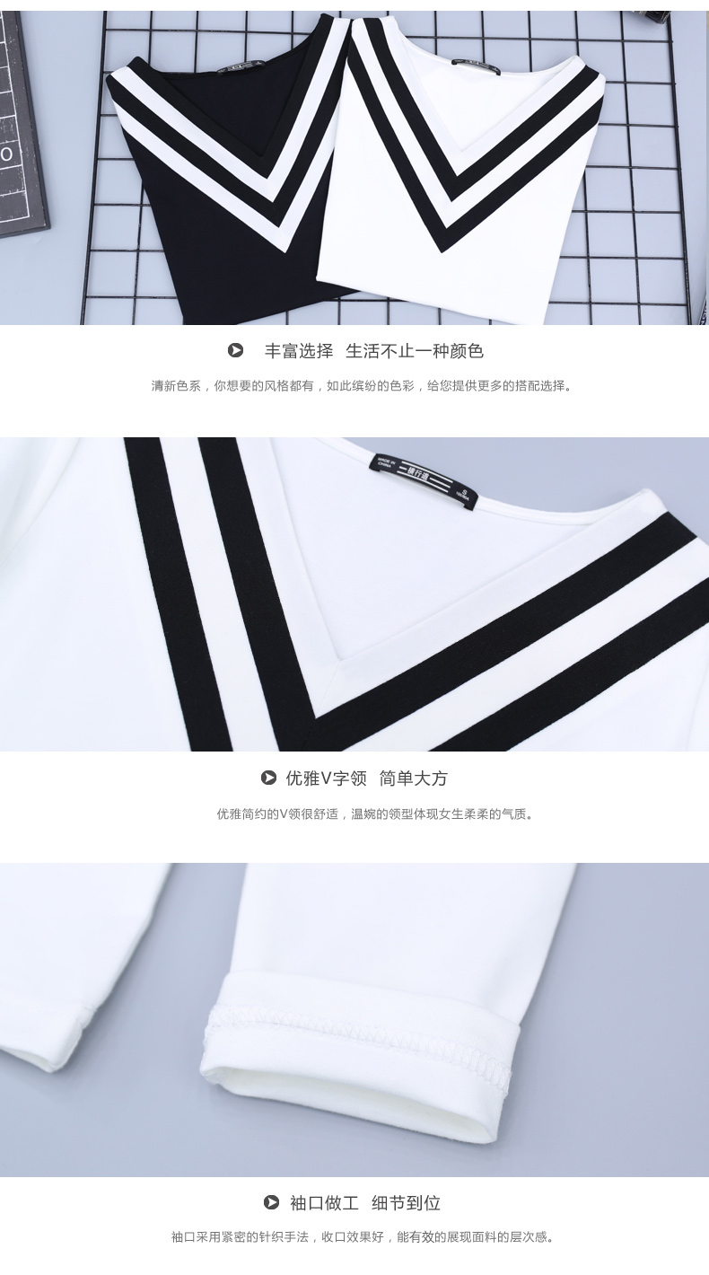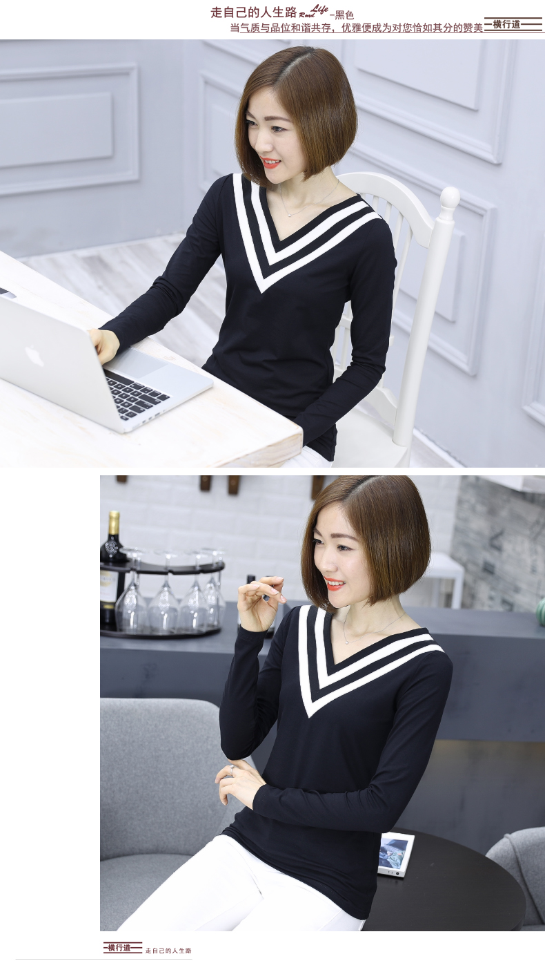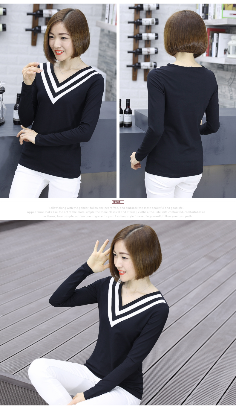 2019秋裝韓版女裝撞色大v領拼接打底衫大碼黑色長袖棉t恤純色上衣1入