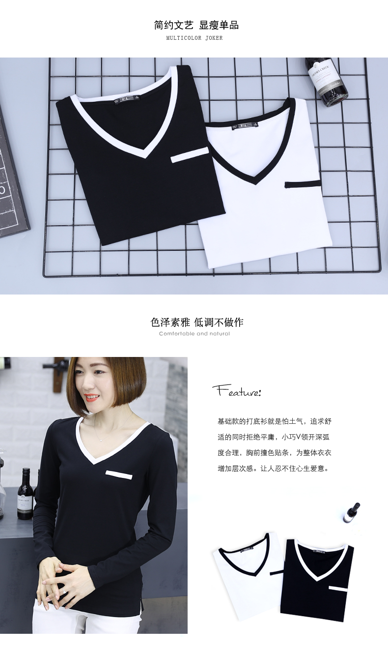 秋裝下擺開叉長袖女t恤棉質打底衫V領撞色拼接上衣服外穿大碼女裝1入