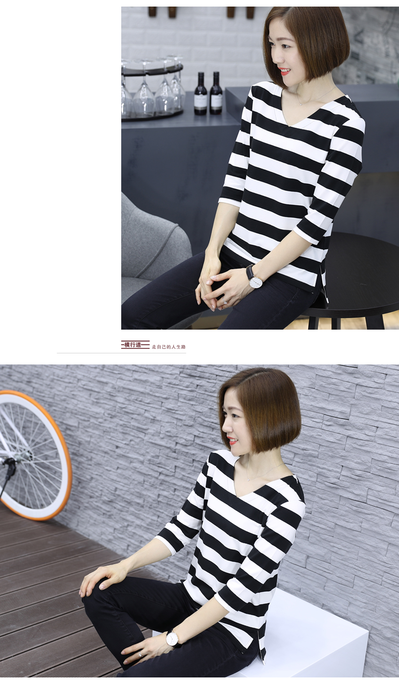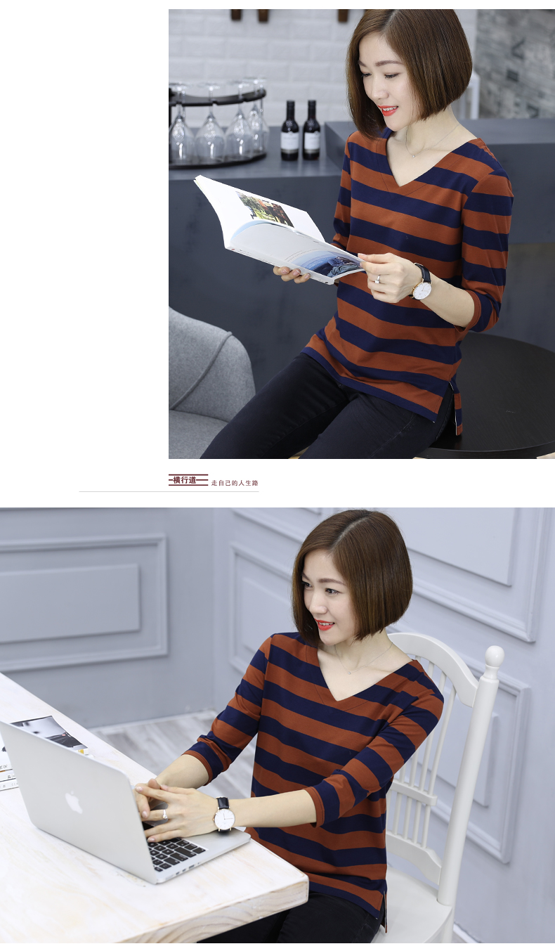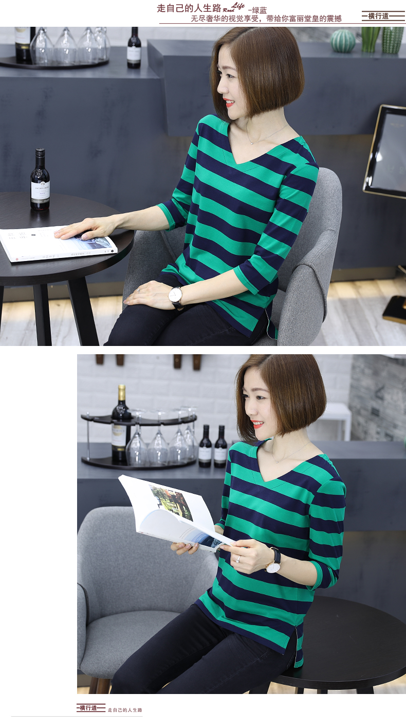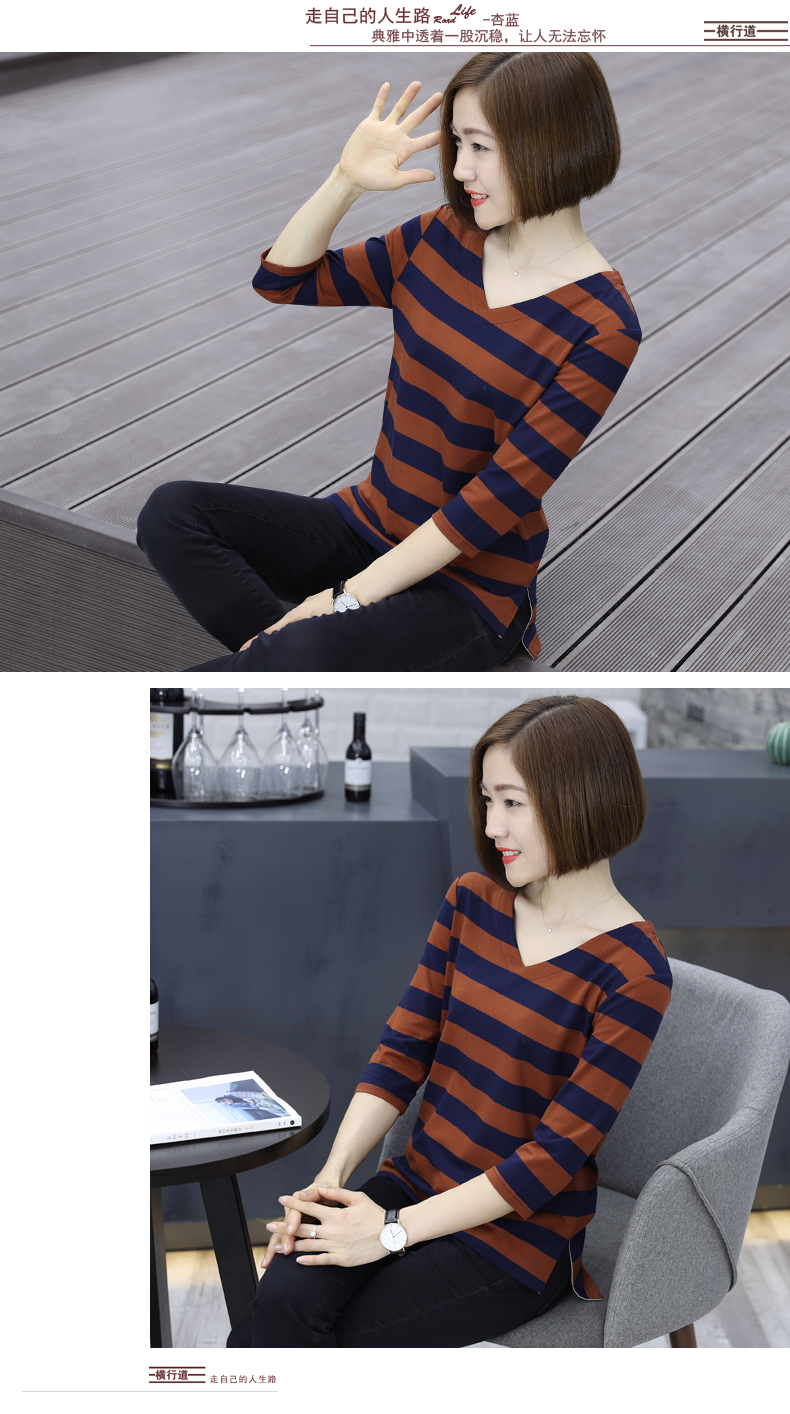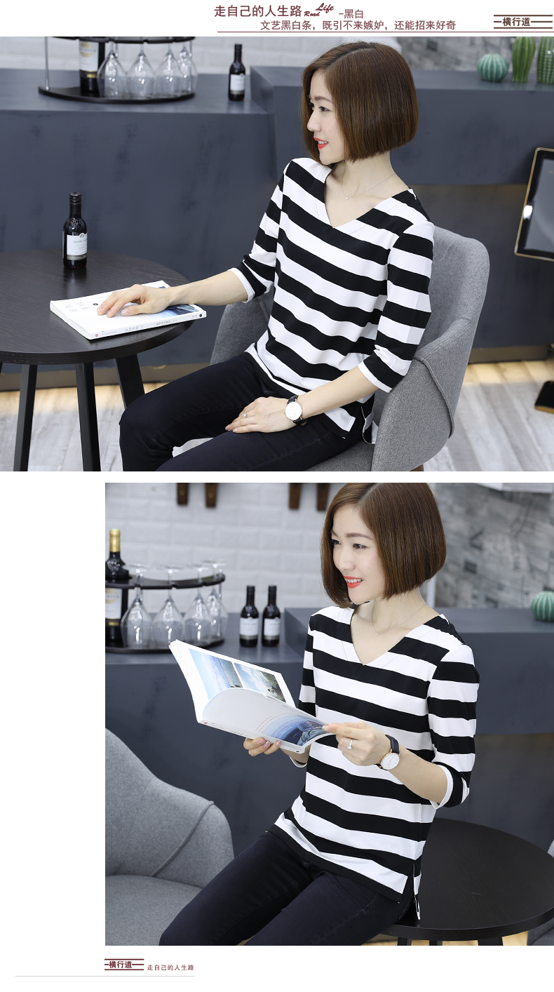 2019秋季女裝條紋t恤新款中袖七分袖上衣服v領寬松打底衫外穿秋裝1入