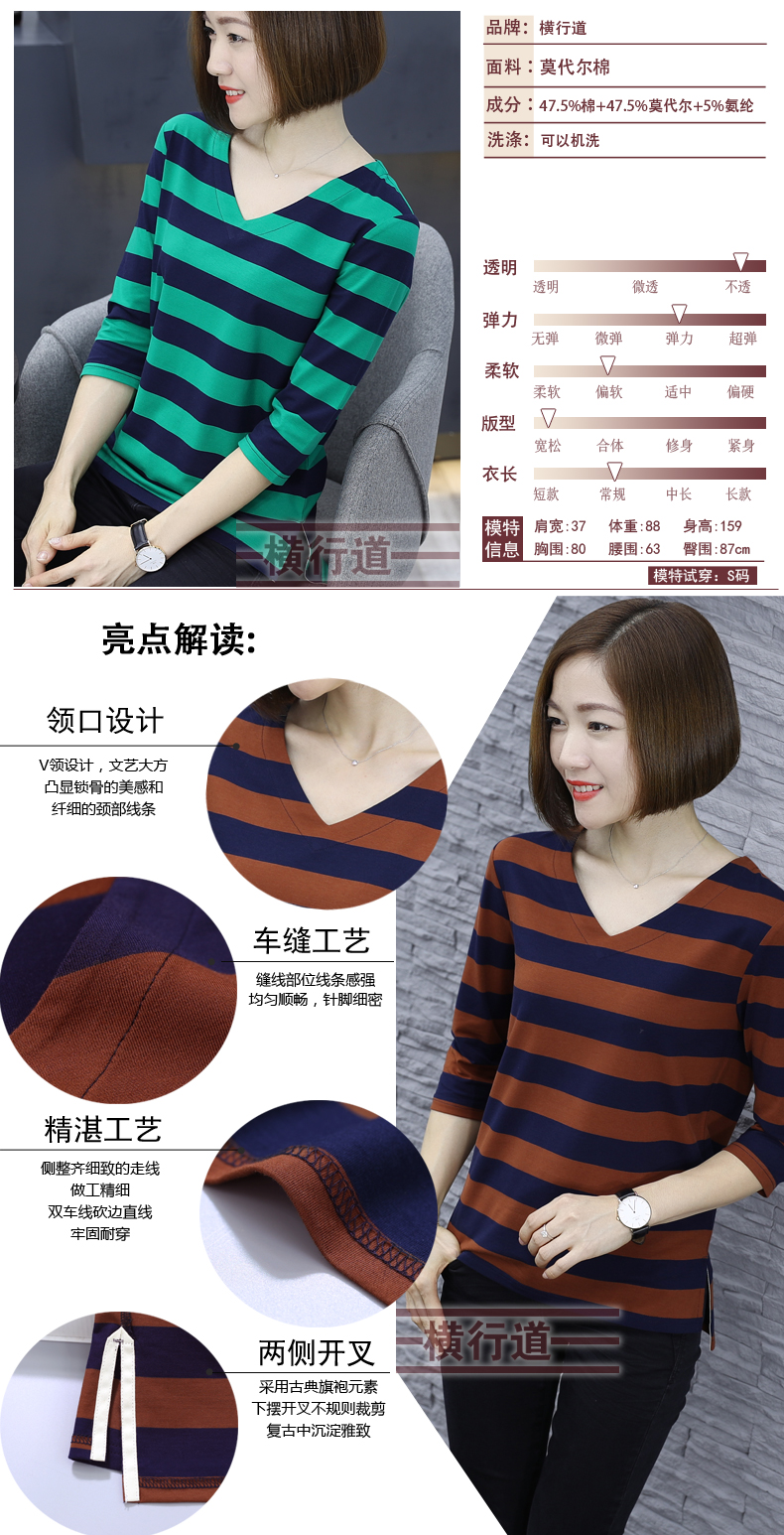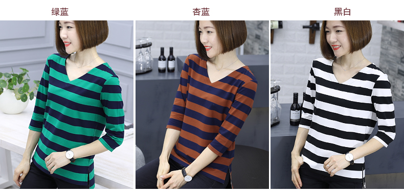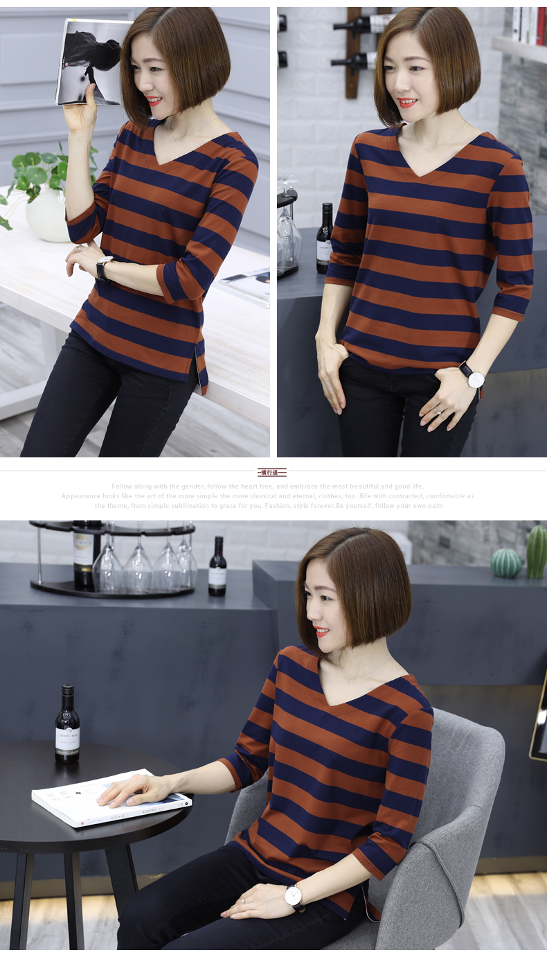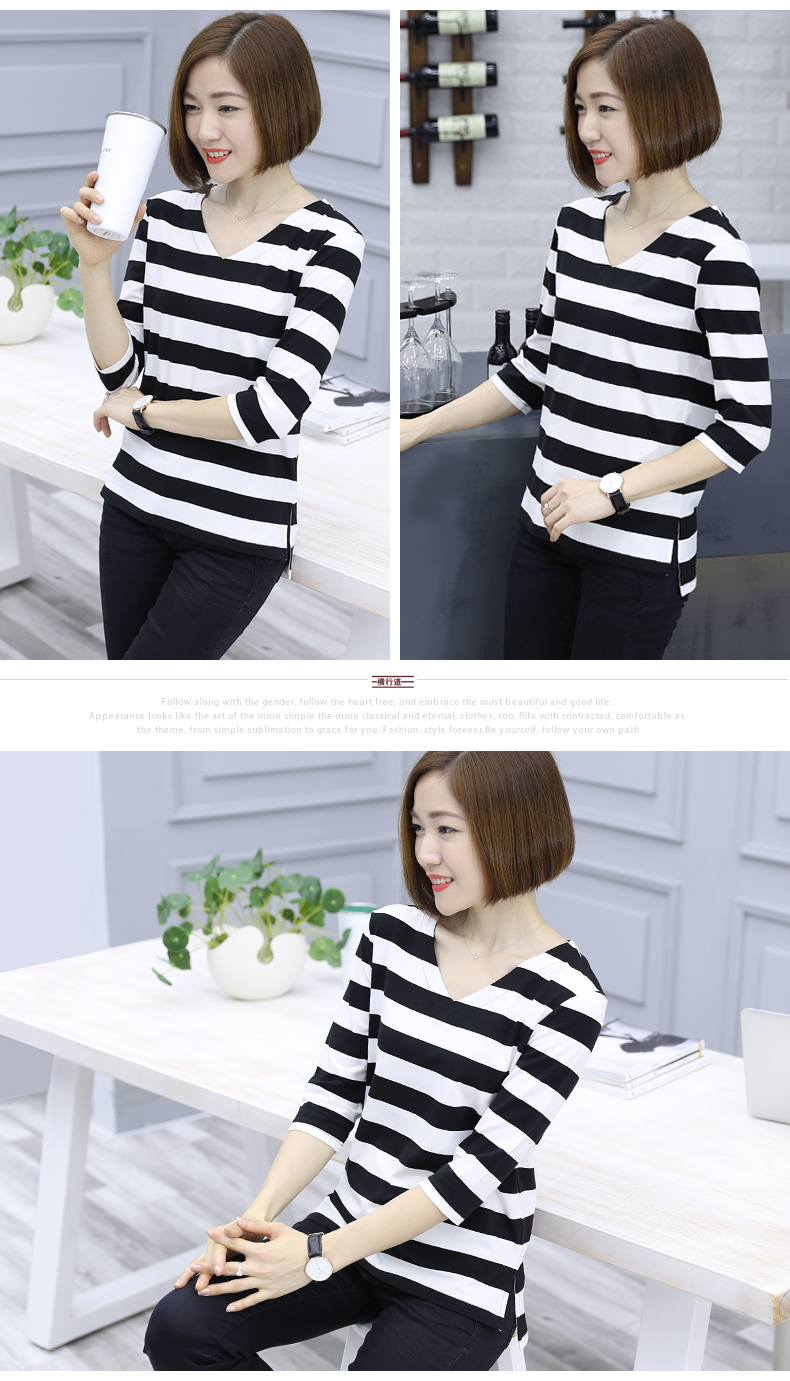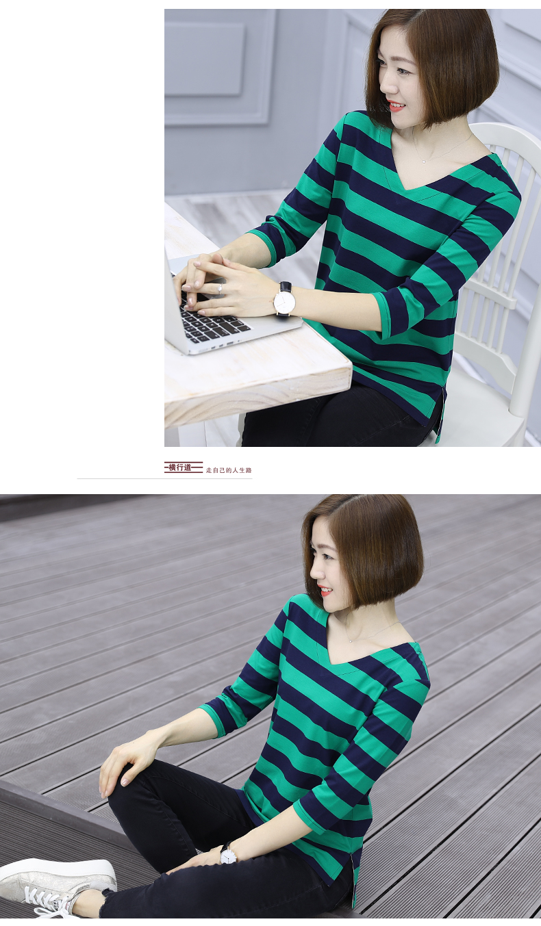 2019秋季女裝條紋t恤新款中袖七分袖上衣服v領寬松打底衫外穿秋裝1入