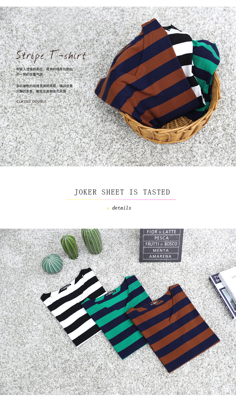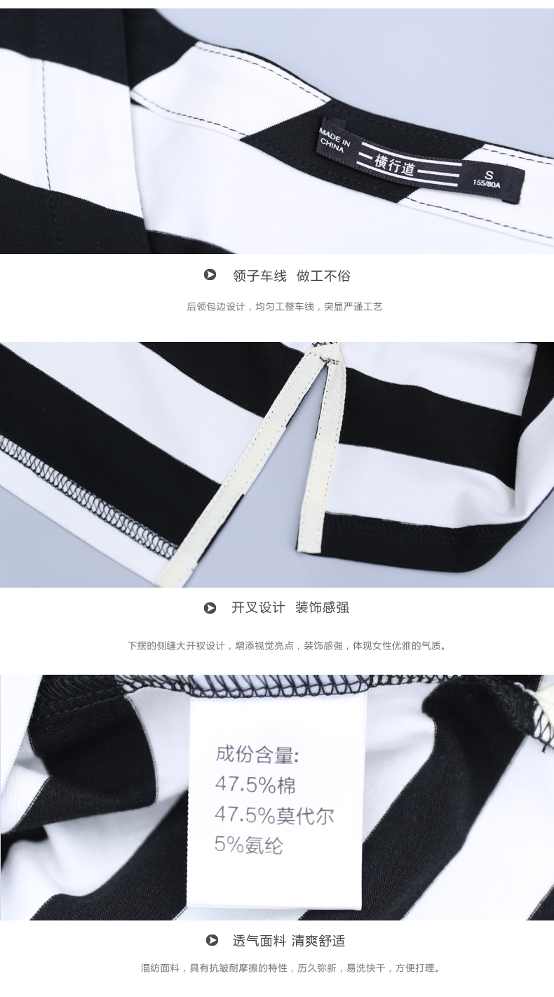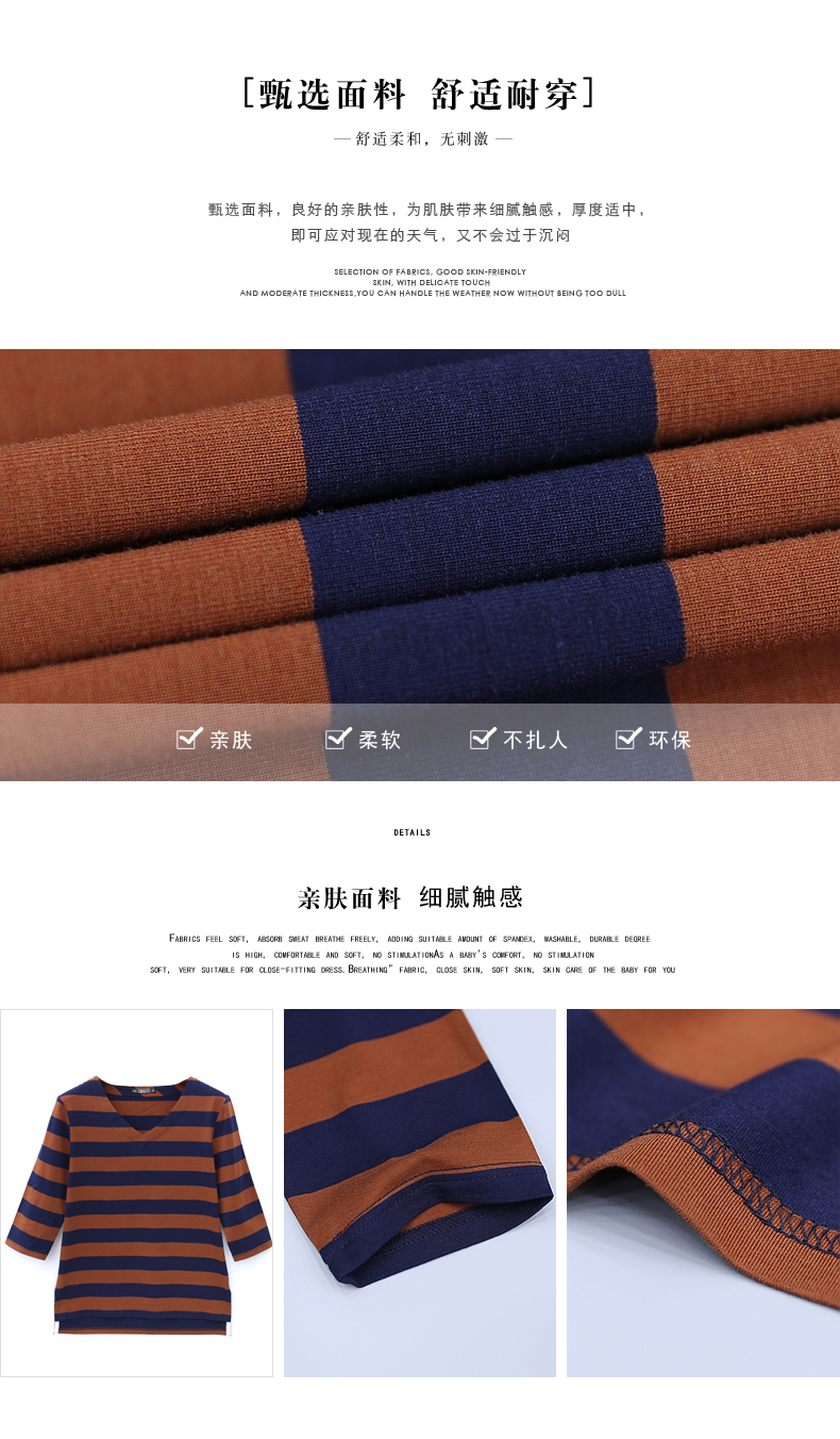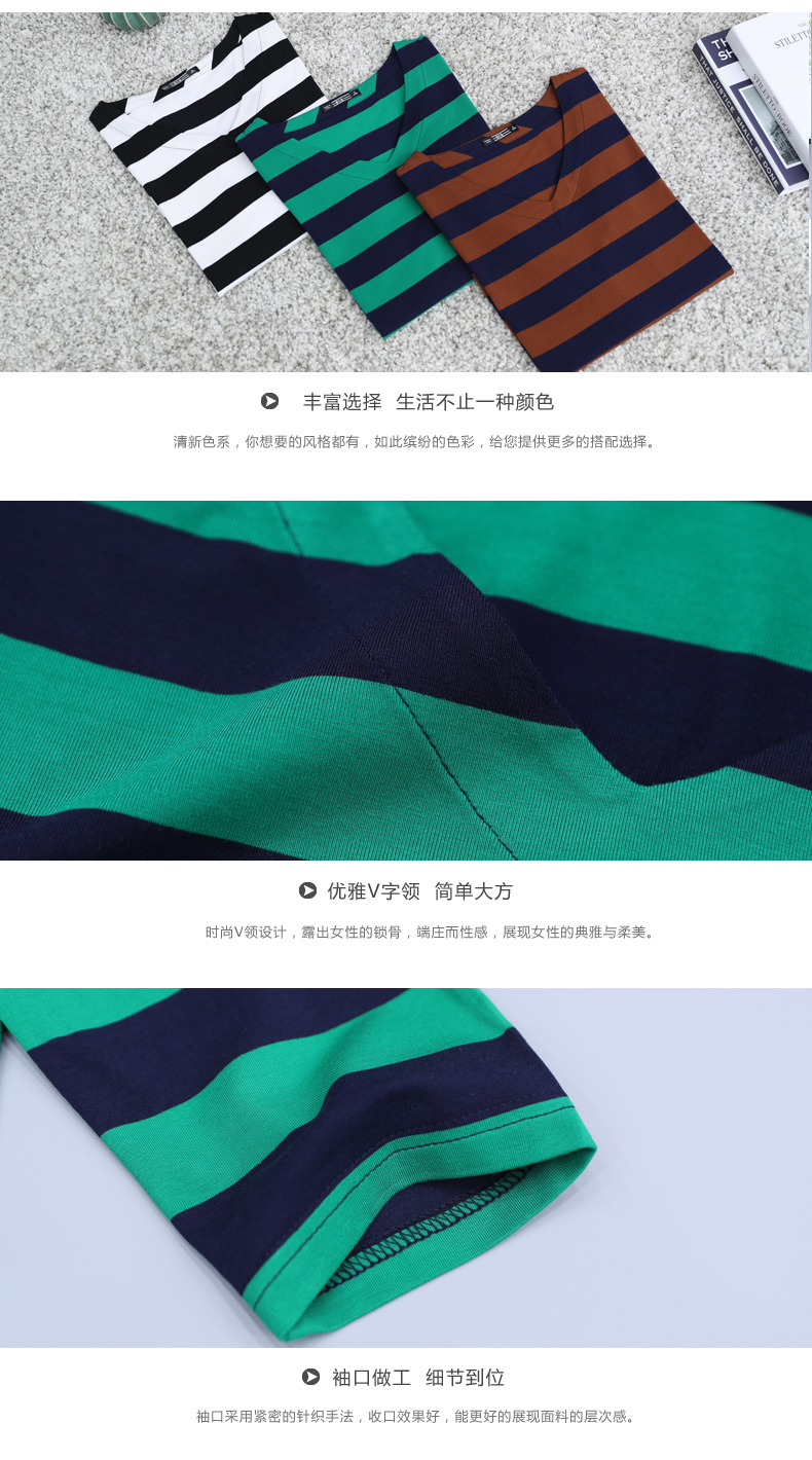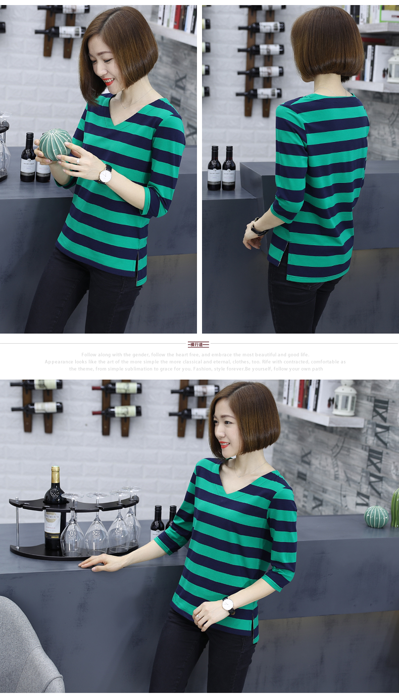 2019秋季女裝條紋t恤新款中袖七分袖上衣服v領寬松打底衫外穿秋裝1入