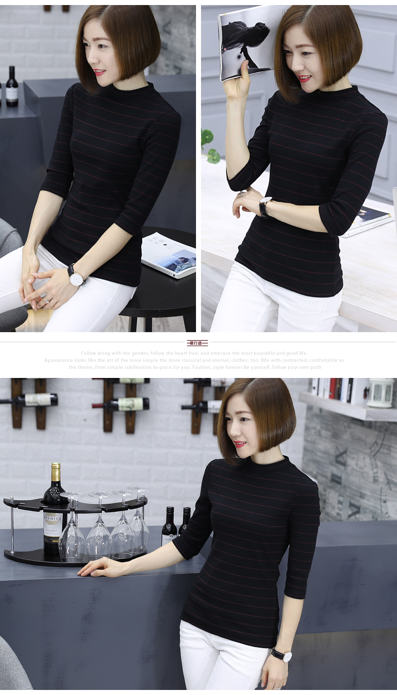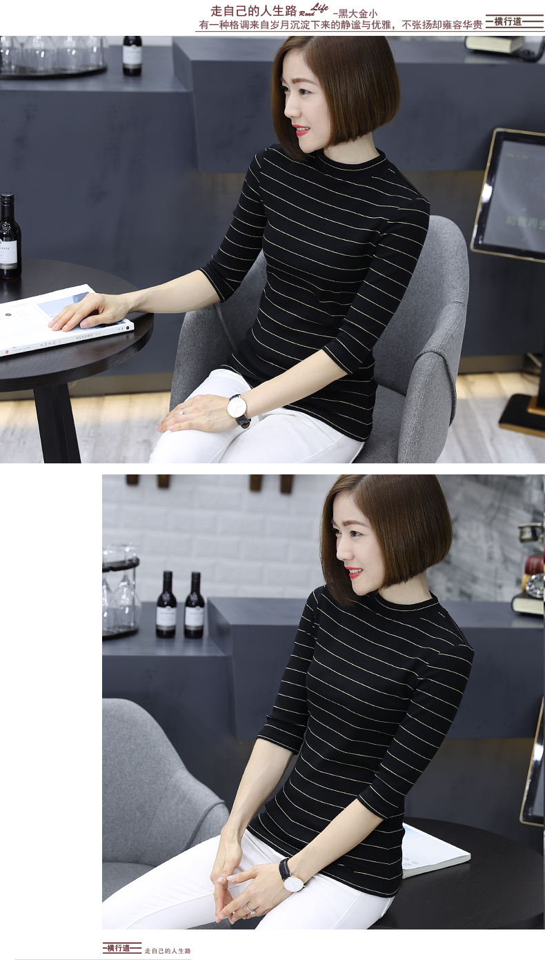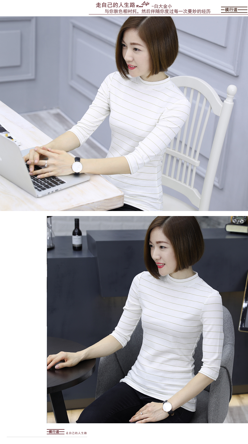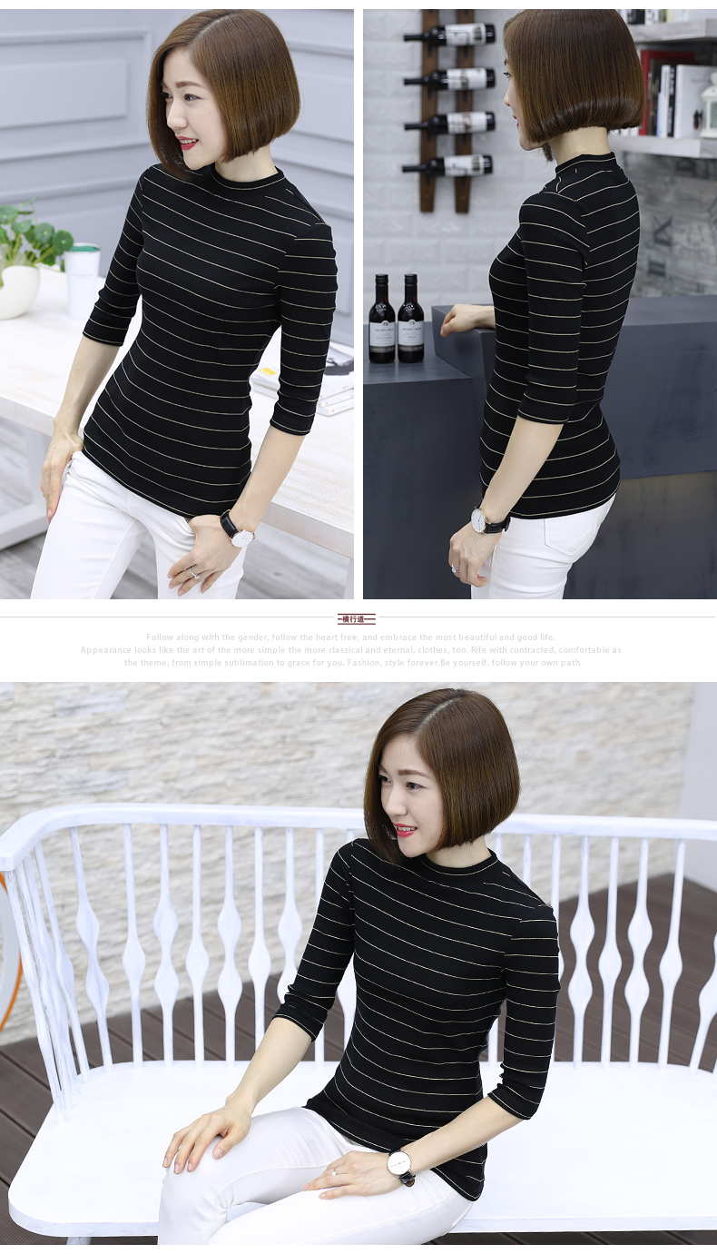 2019秋裝女裝七分袖半高領女士上衣服條紋秋季套頭打底衫中袖t恤1入
