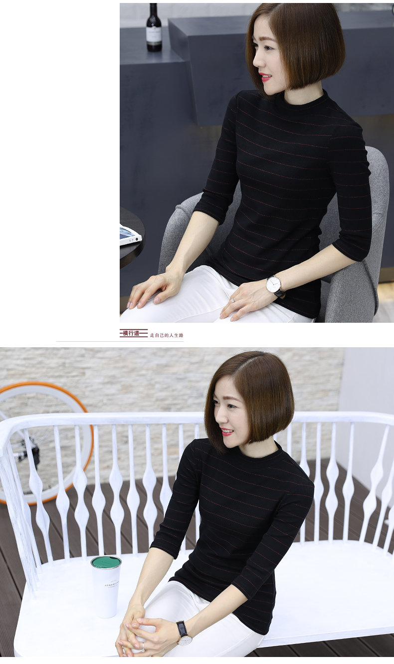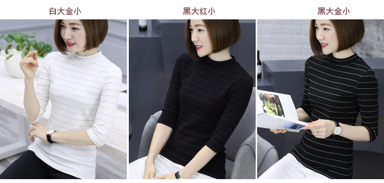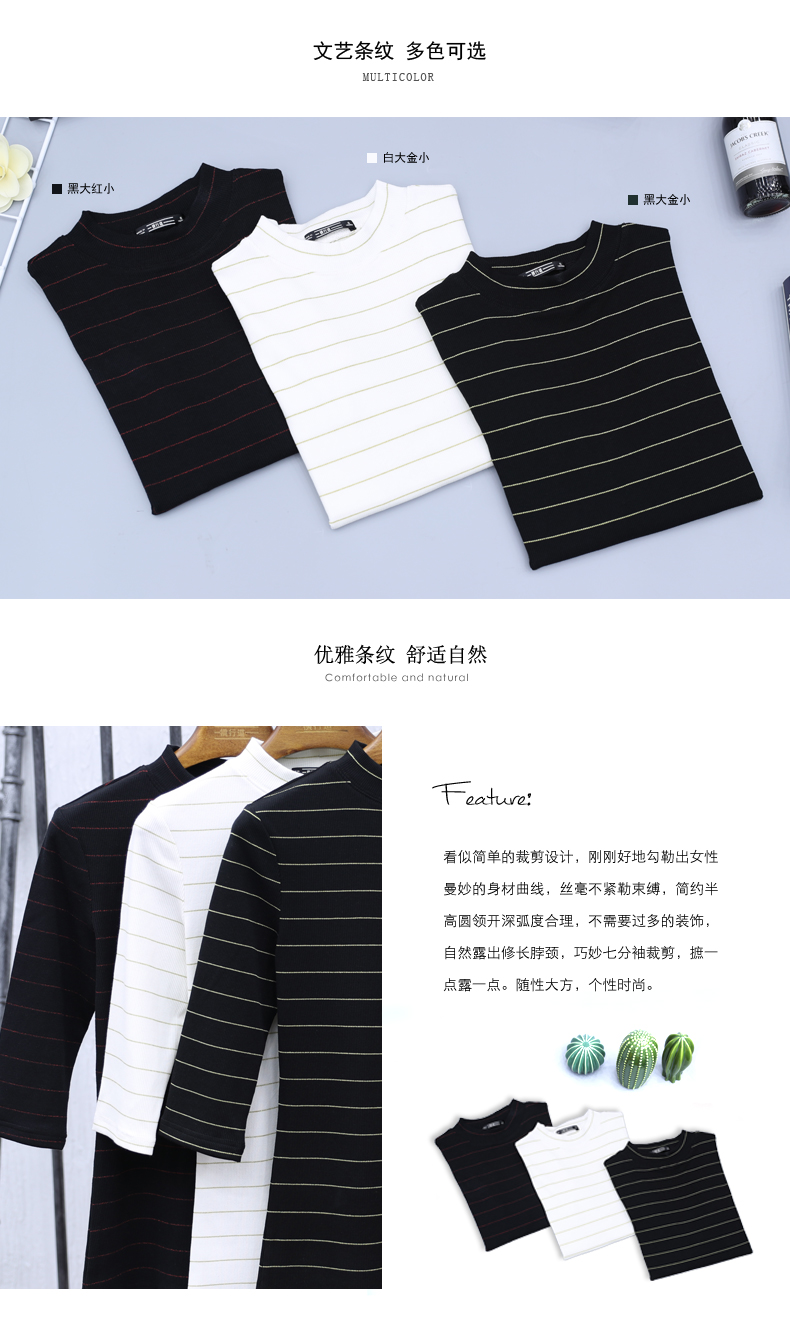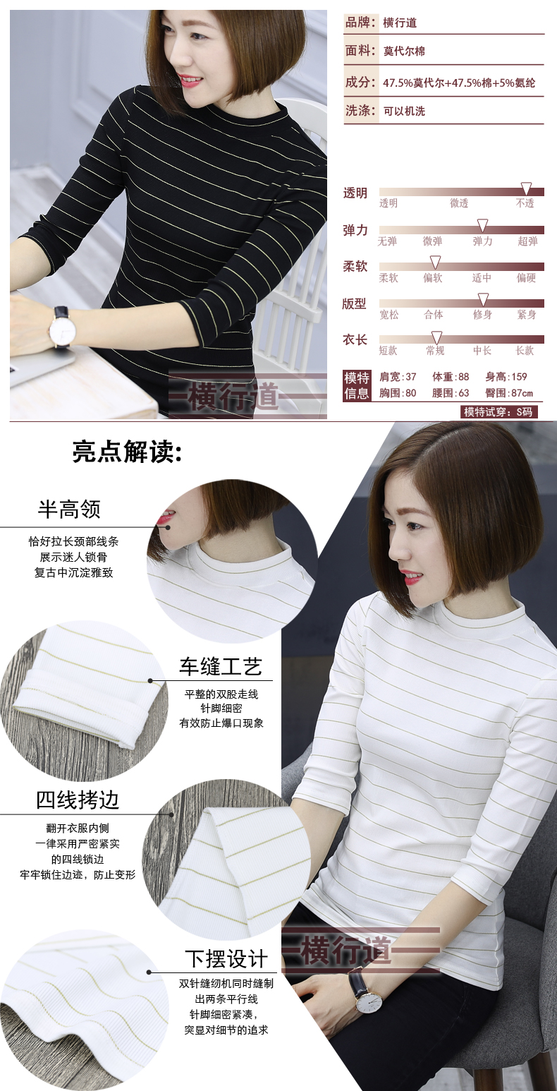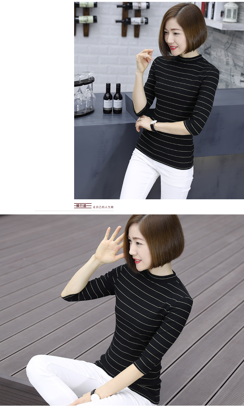 2019秋裝女裝七分袖半高領女士上衣服條紋秋季套頭打底衫中袖t恤1入