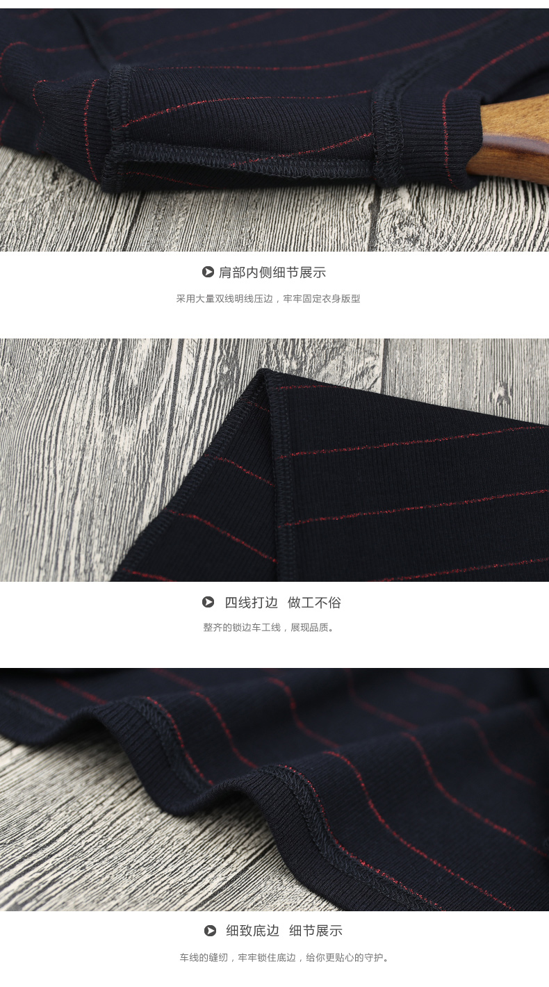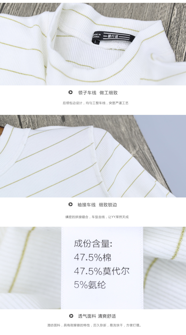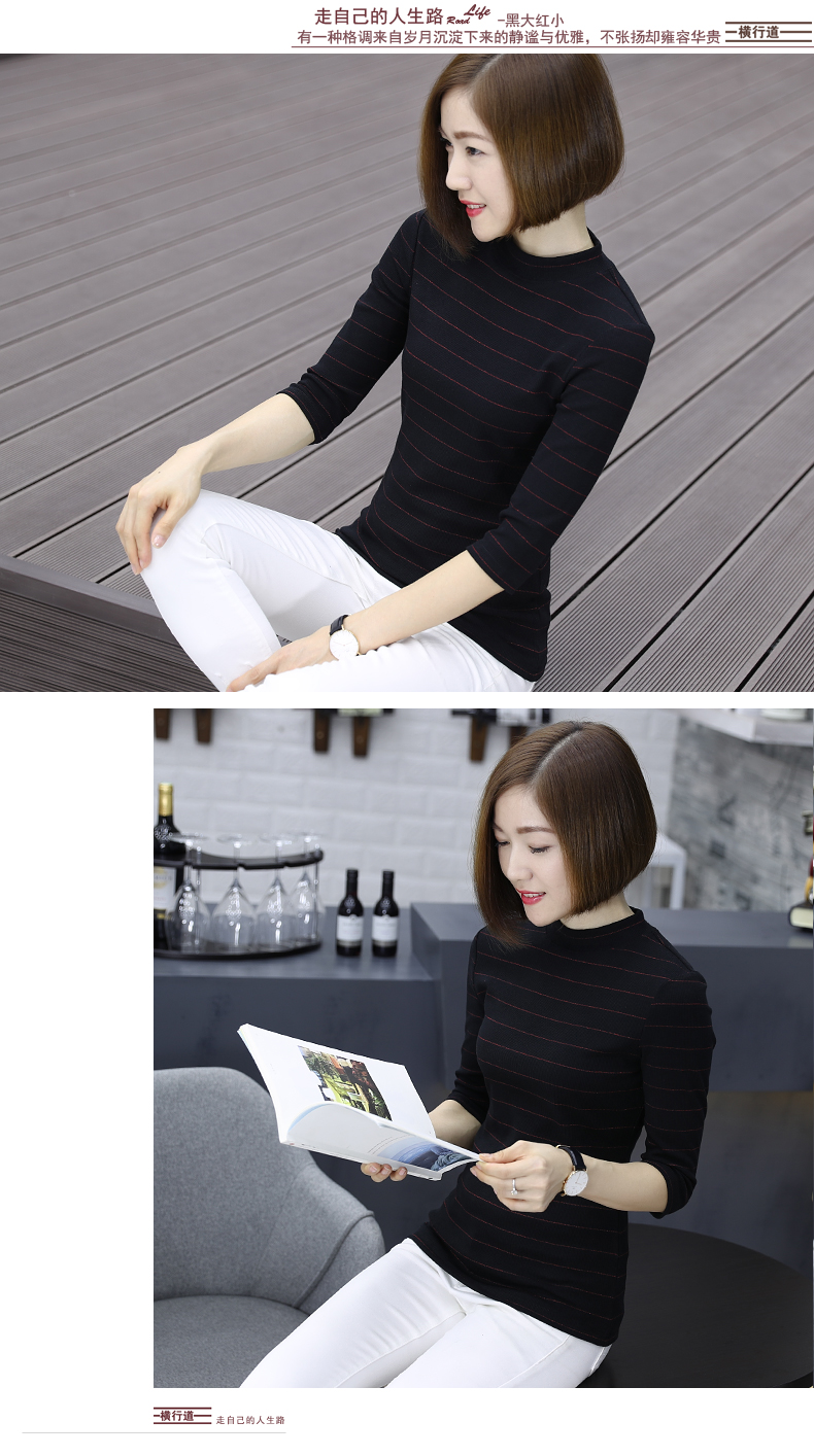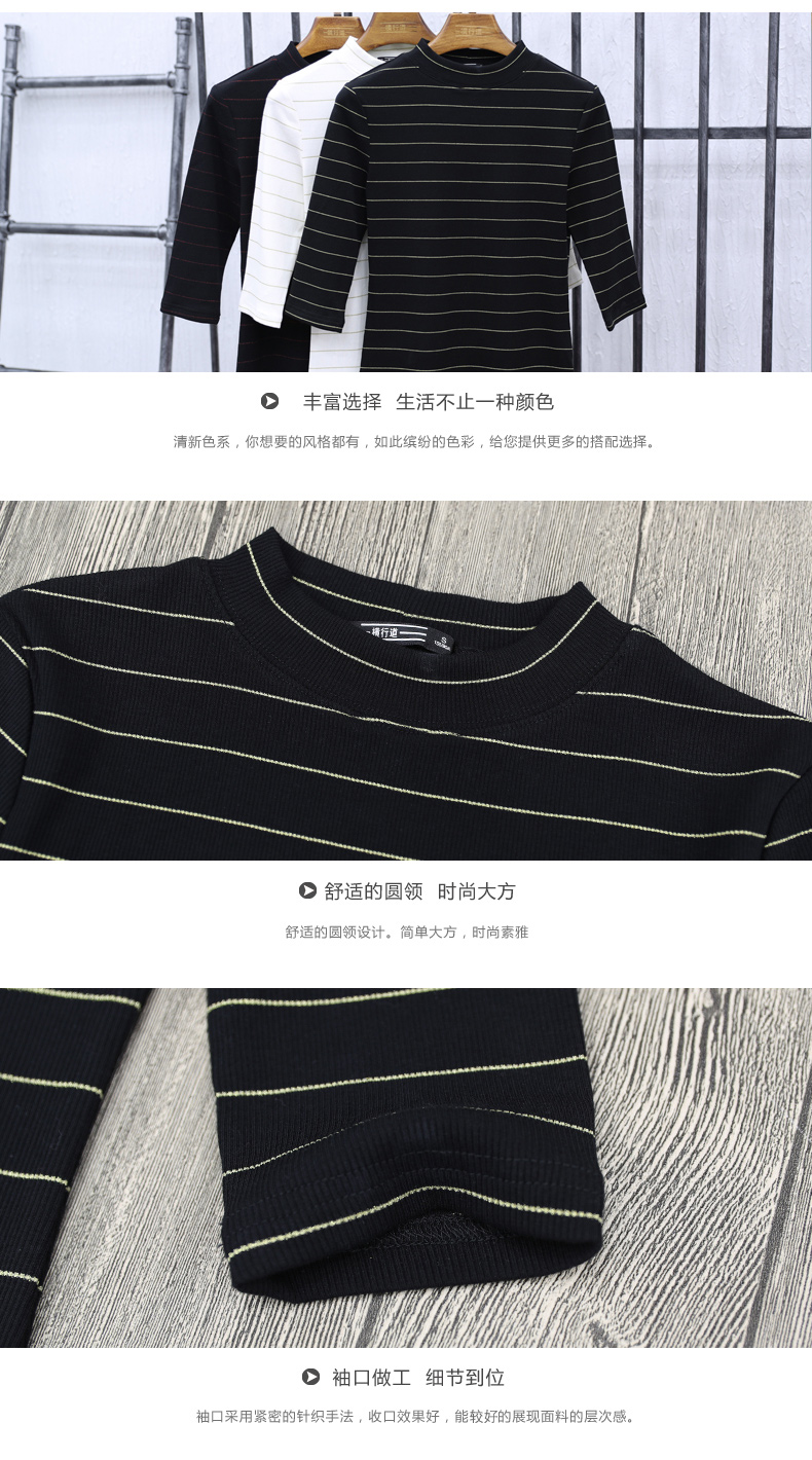 2019秋裝女裝七分袖半高領女士上衣服條紋秋季套頭打底衫中袖t恤1入