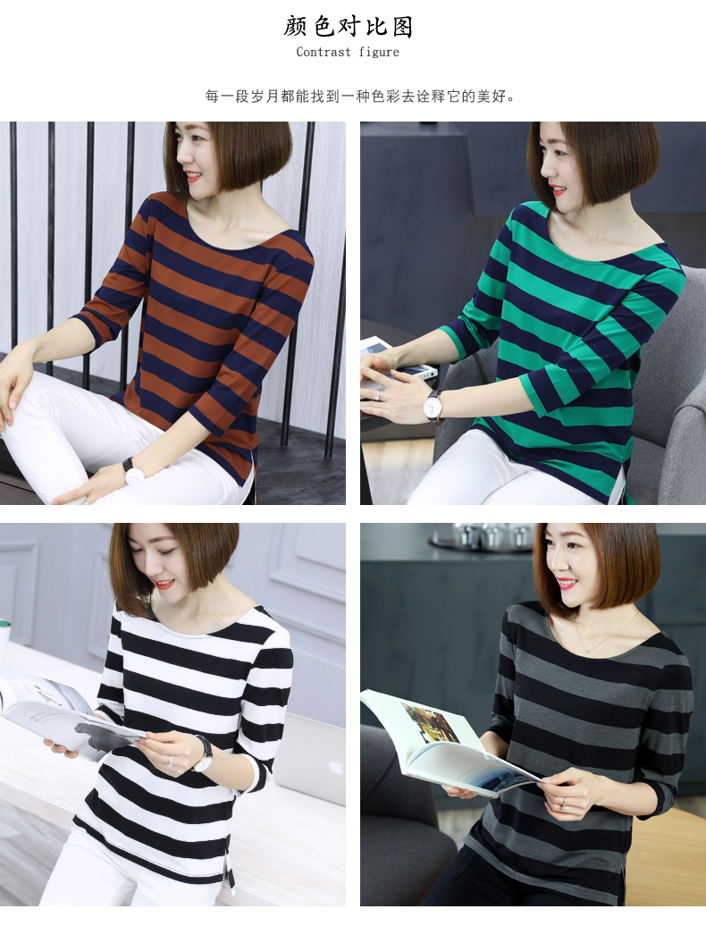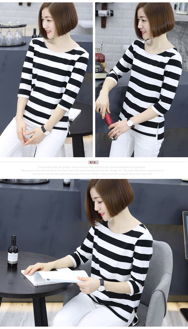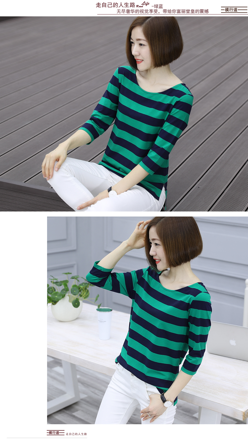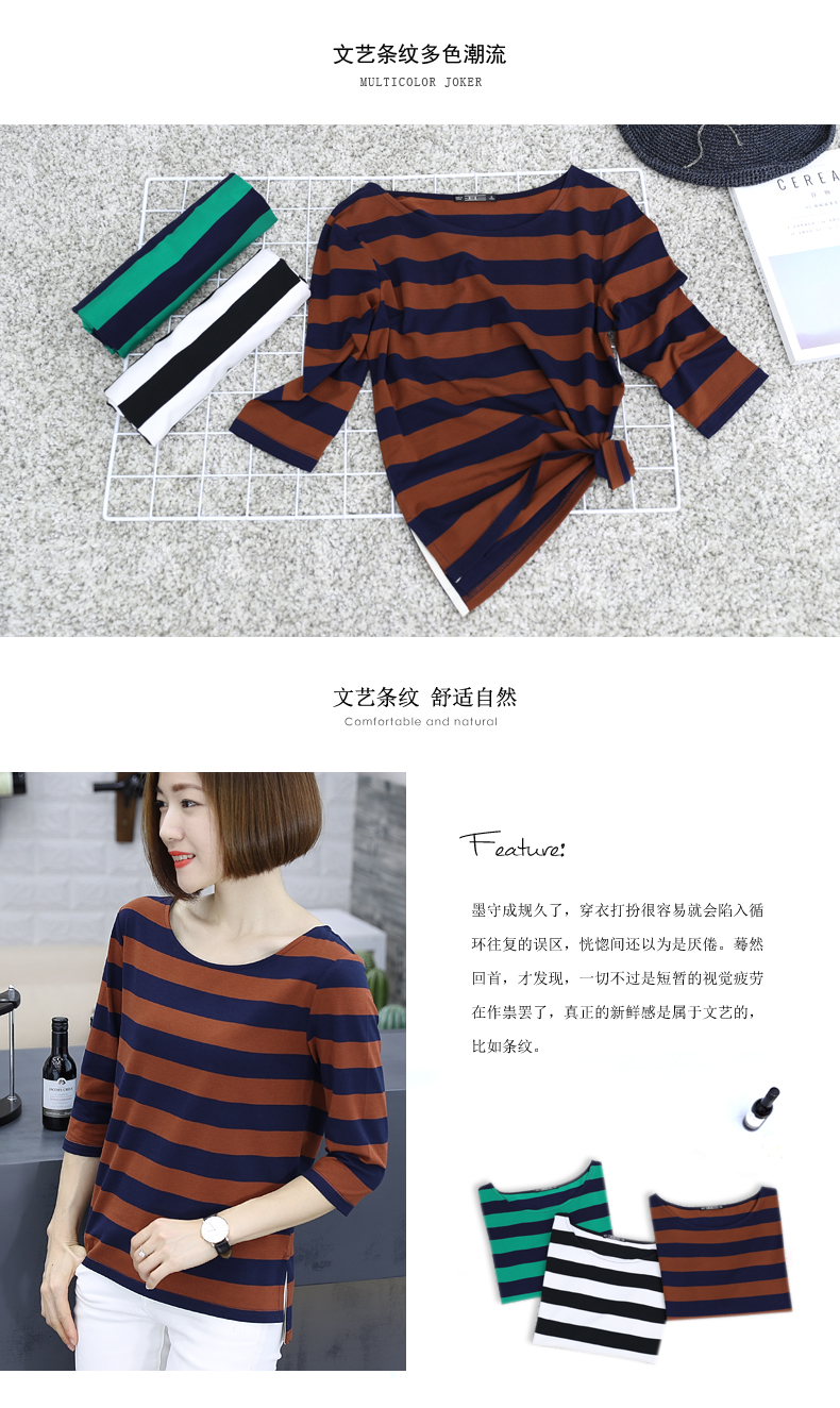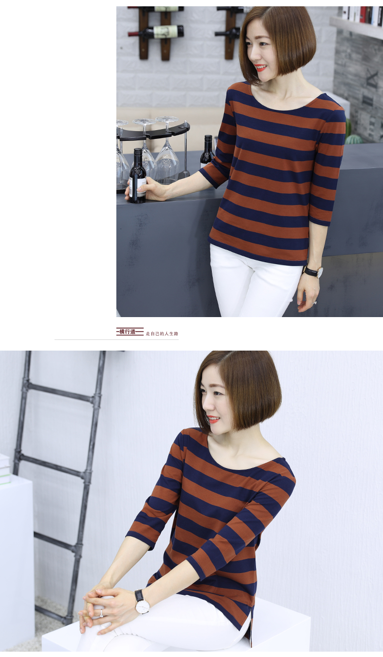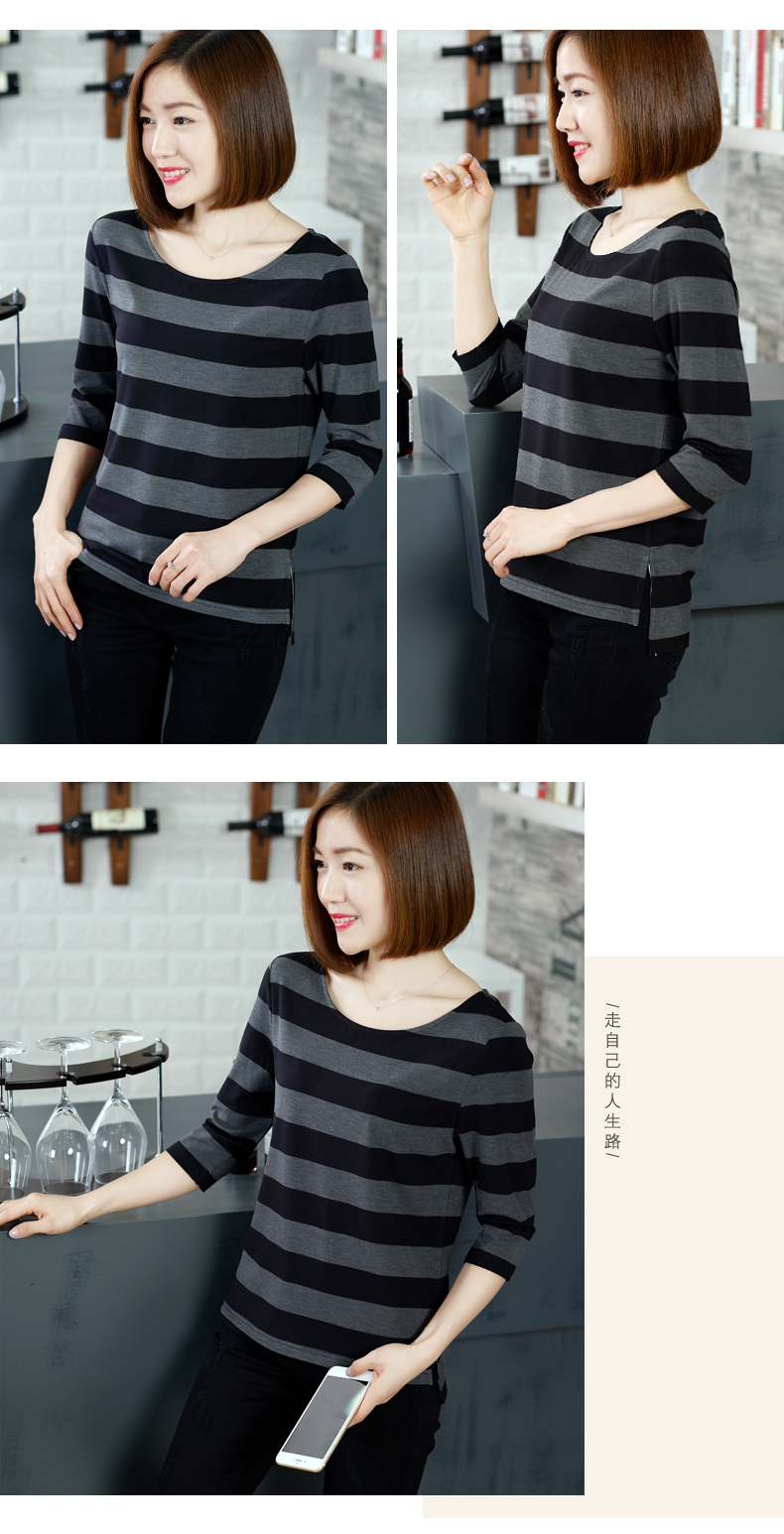 2019秋季七分袖條紋t恤大碼女裝寬松圓領打底衫中袖上衣服秋裝1入