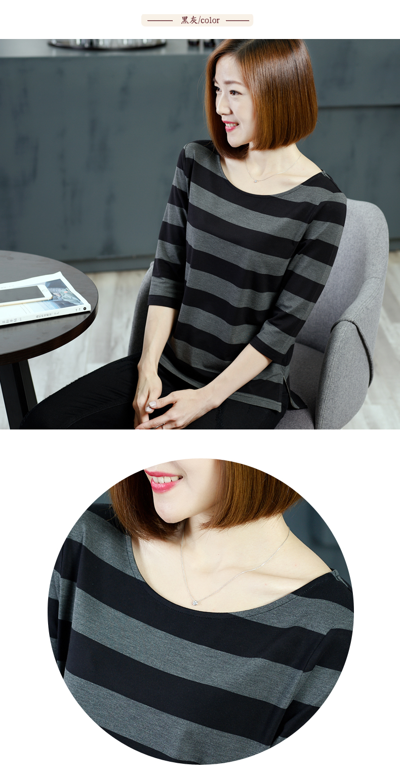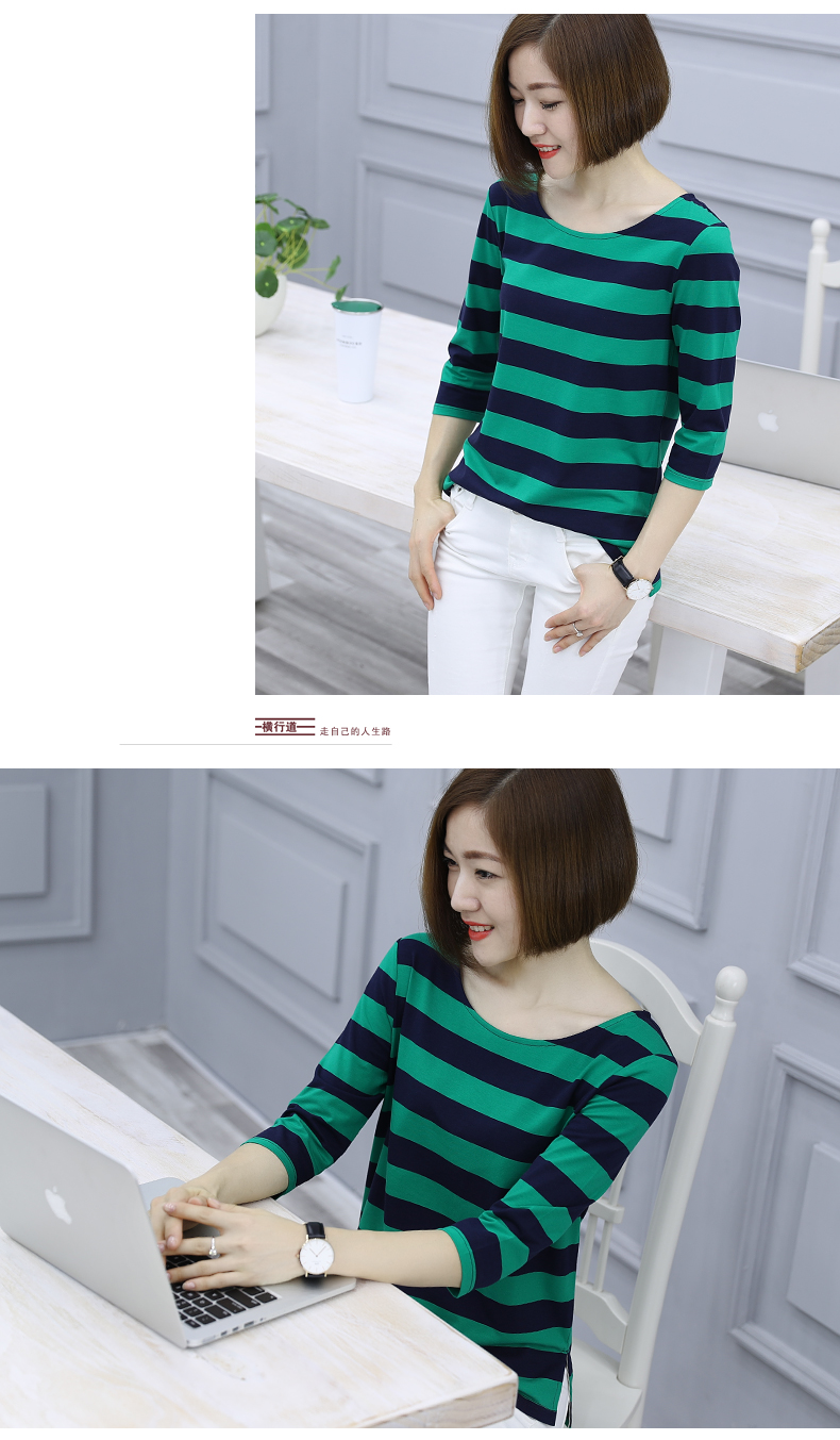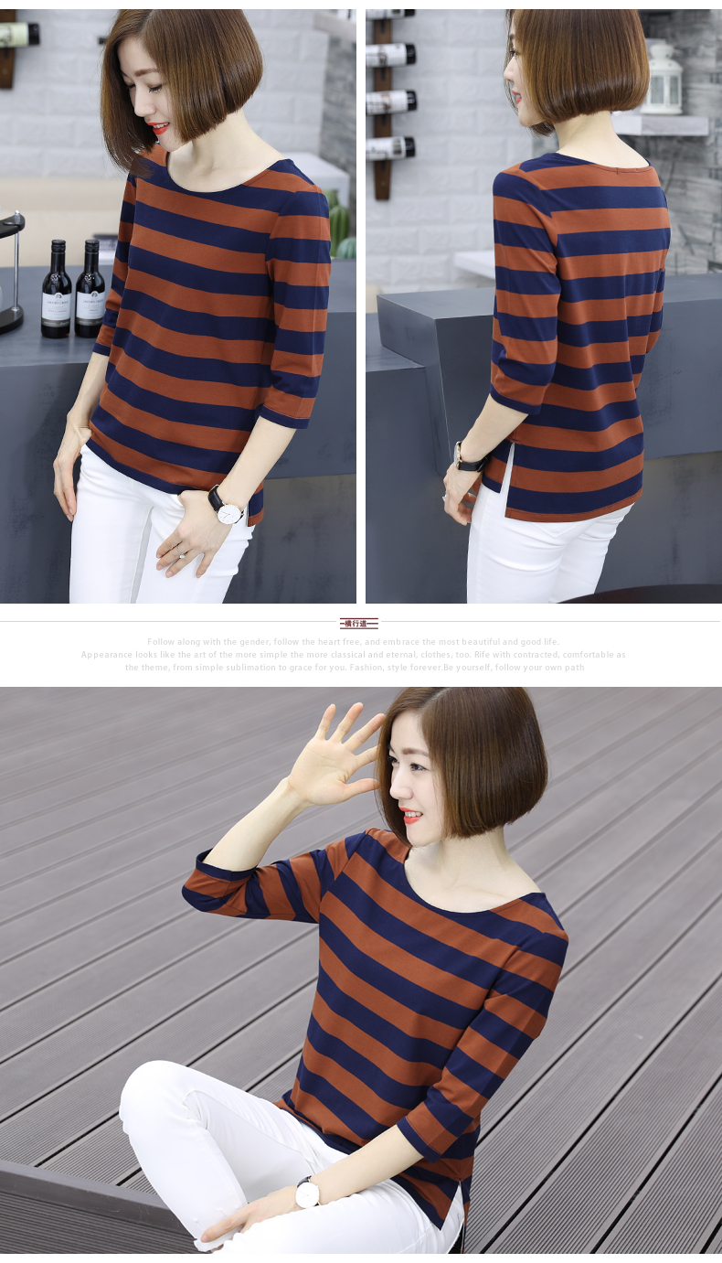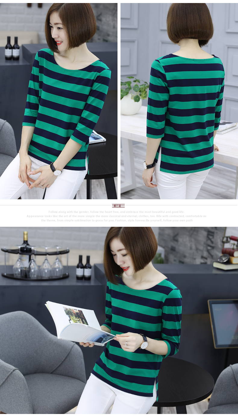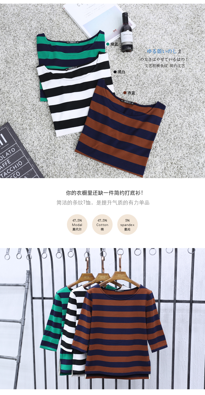 2019秋季七分袖條紋t恤大碼女裝寬松圓領打底衫中袖上衣服秋裝1入