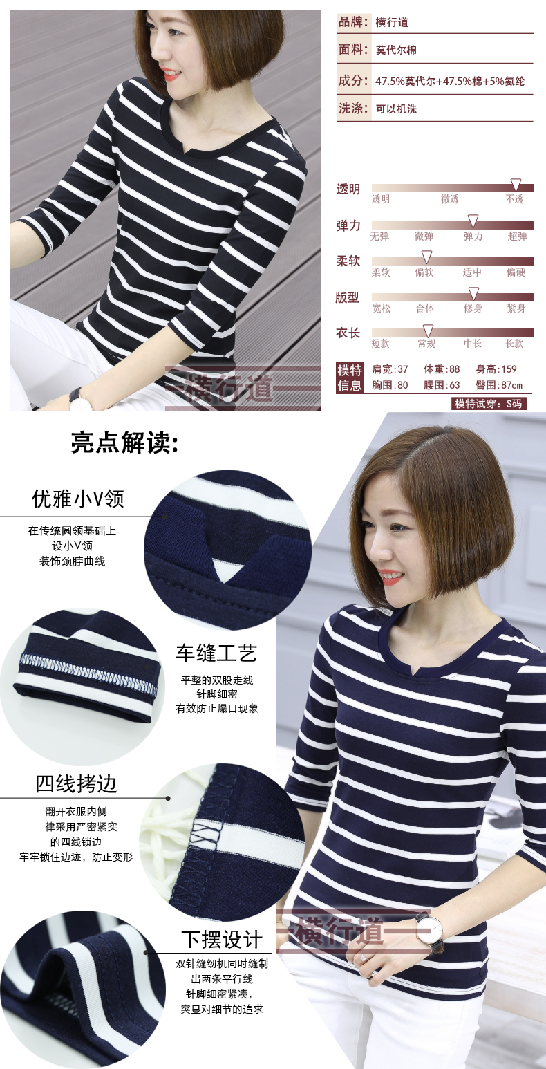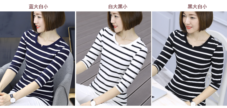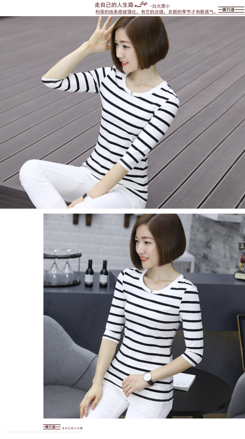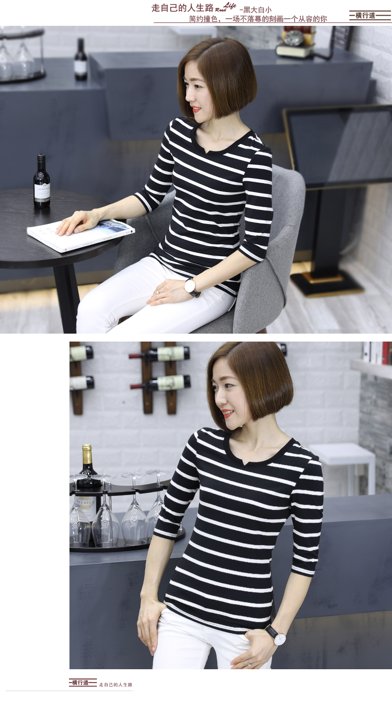 2019秋季新款衣服中袖黑白條紋t恤七分袖女士上衣打底衫女裝外穿1入