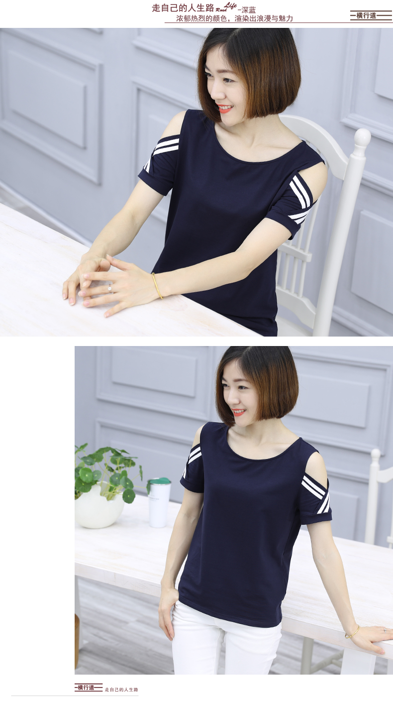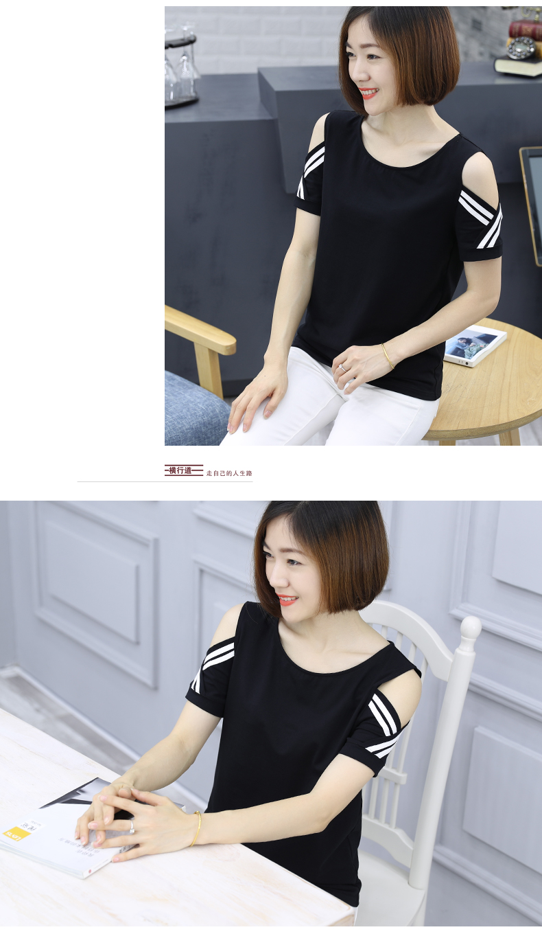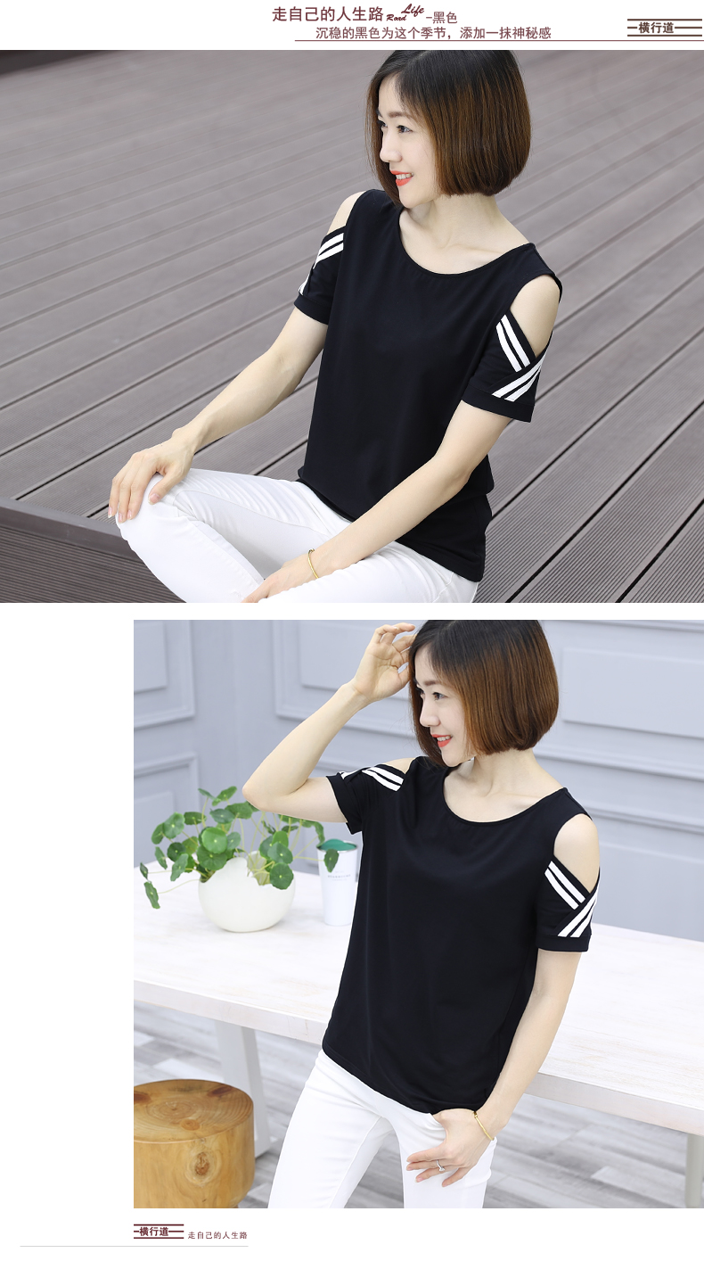 2019夏裝新款t恤黑色短袖圓領寬松露肩半袖夏季大碼女士漏肩上衣1入