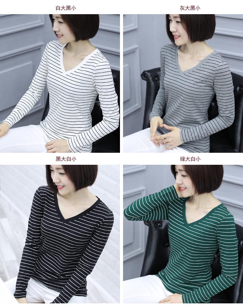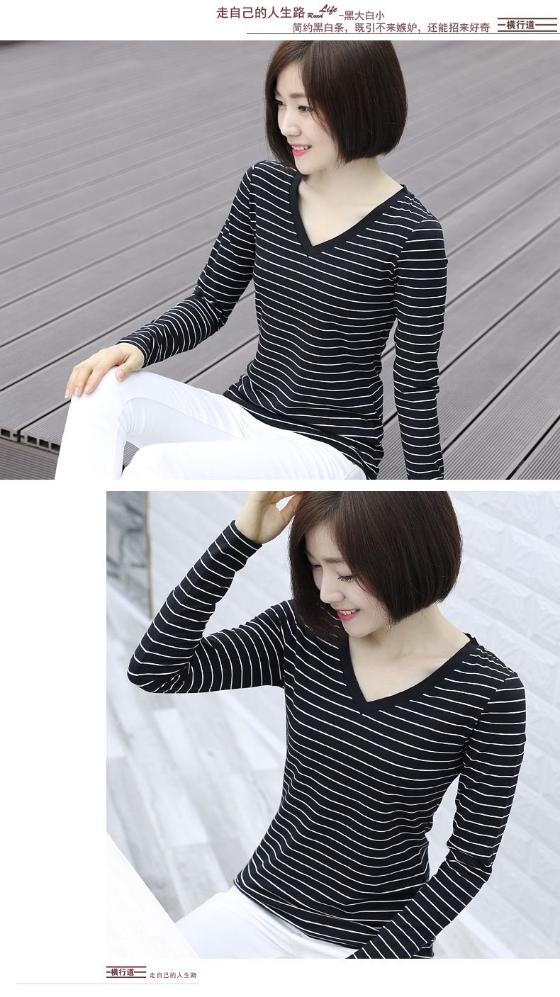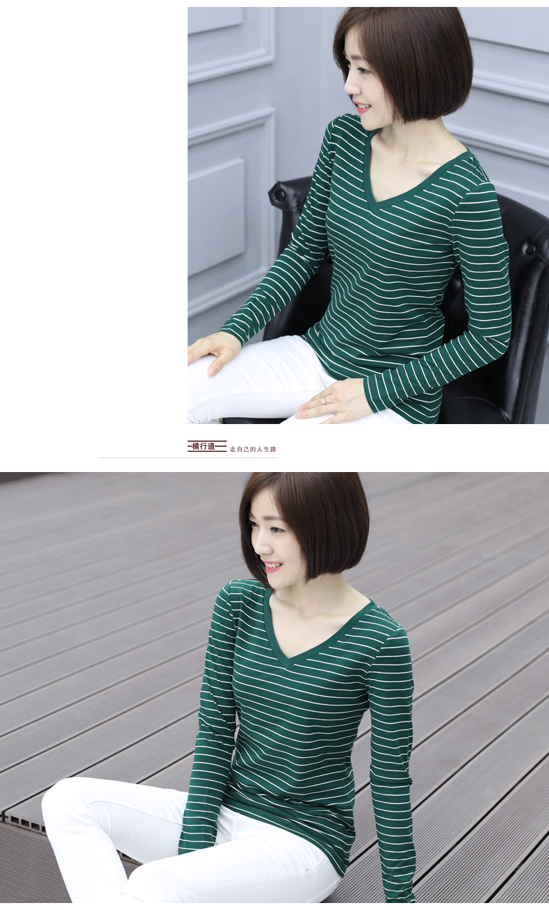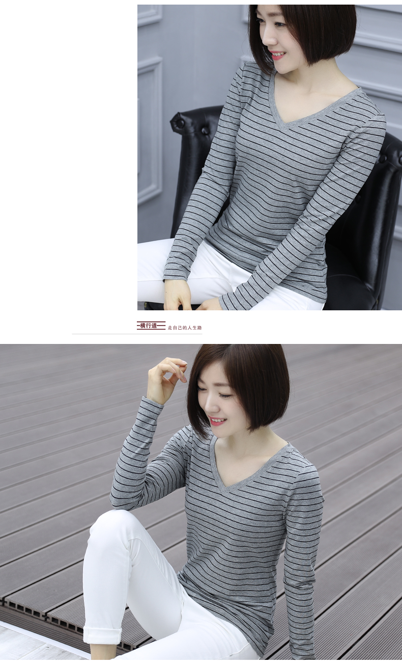 2019秋裝韓版上衣莫代爾棉條紋v領大碼秋款女裝打底衫女士長袖t恤1入
