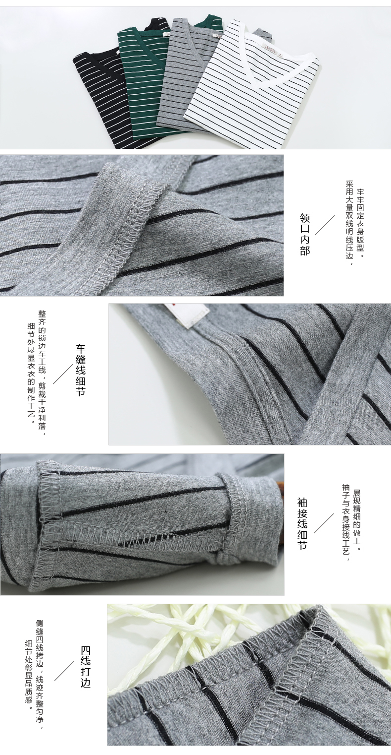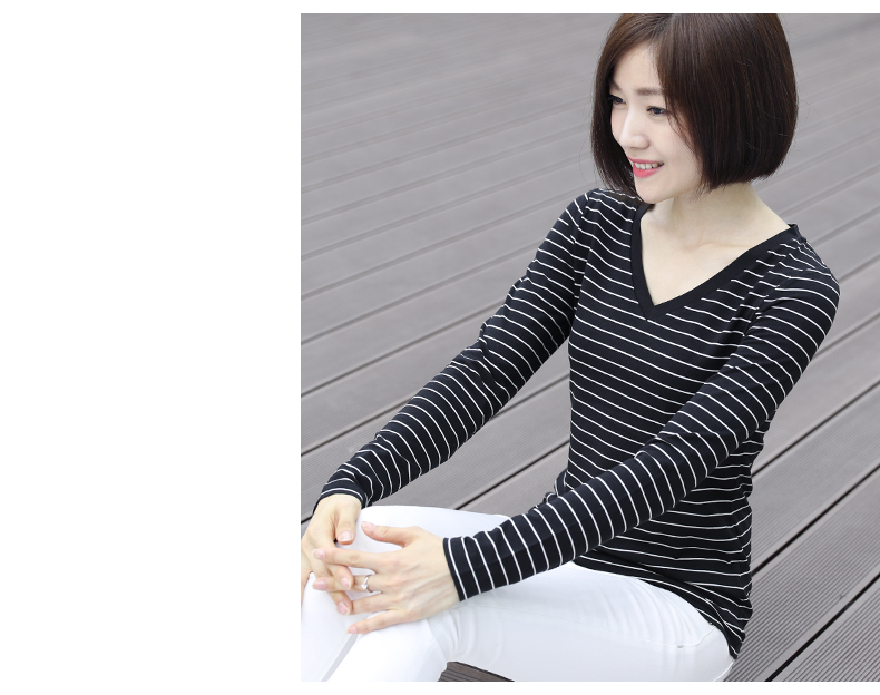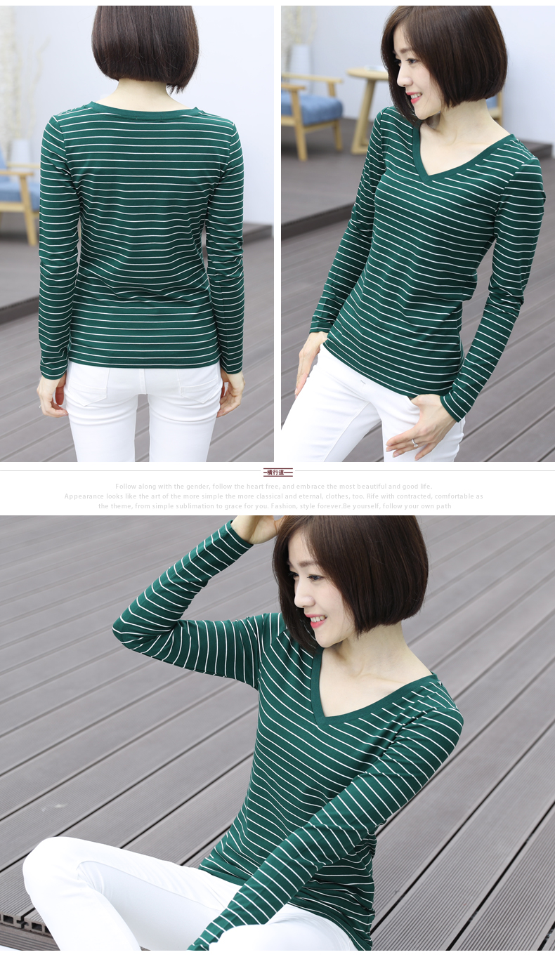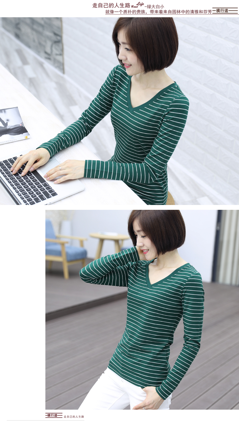 2019秋裝韓版上衣莫代爾棉條紋v領大碼秋款女裝打底衫女士長袖t恤1入