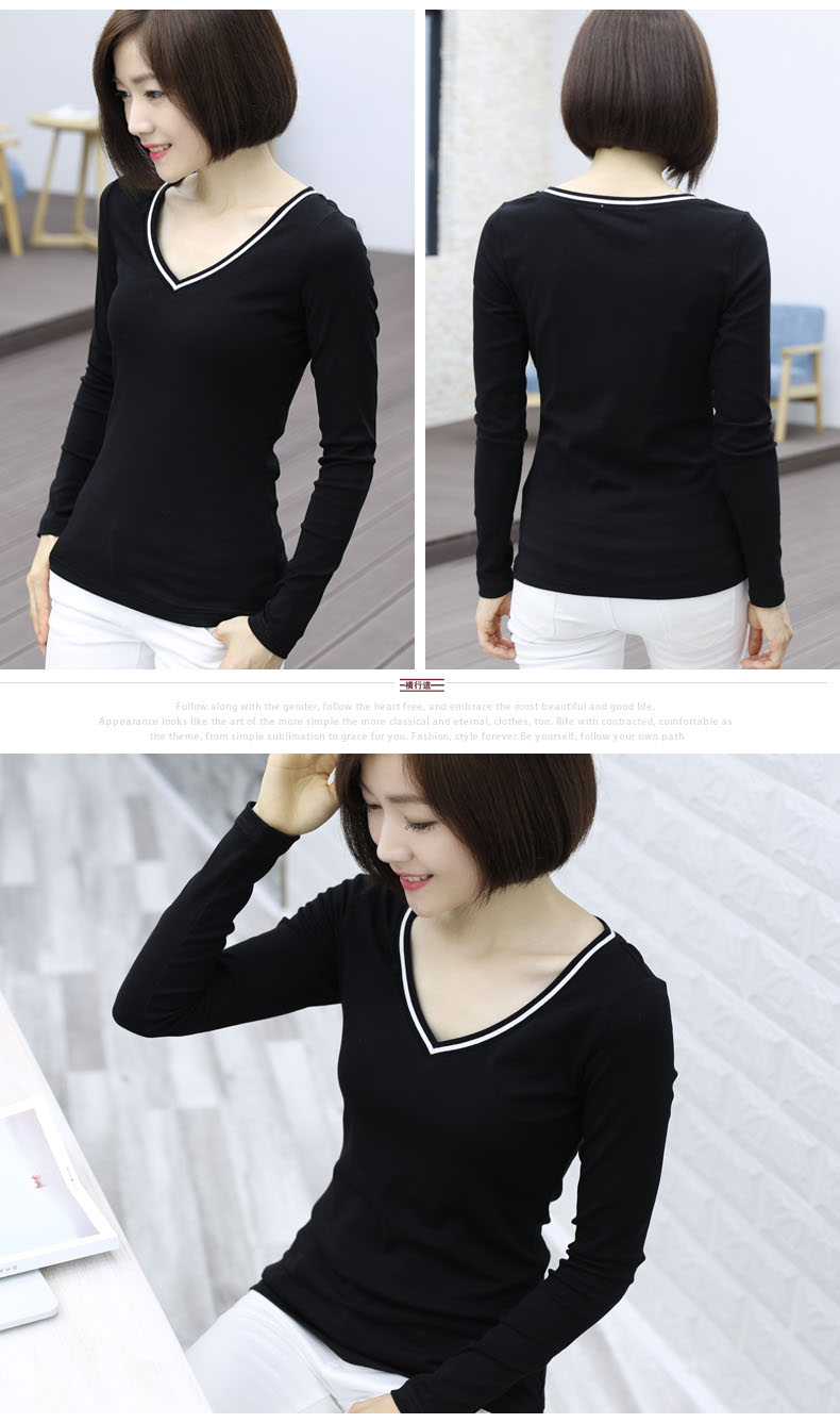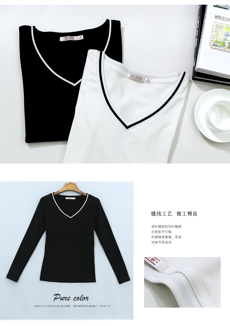 韓版女裝大碼長袖女士上衣服v領純色打底衫體恤胖mm秋裝棉t恤小衫1入