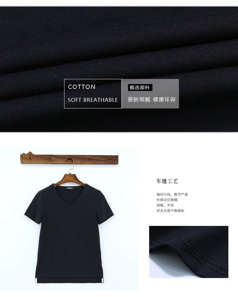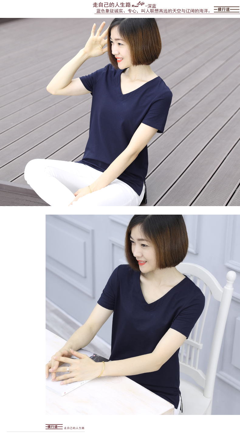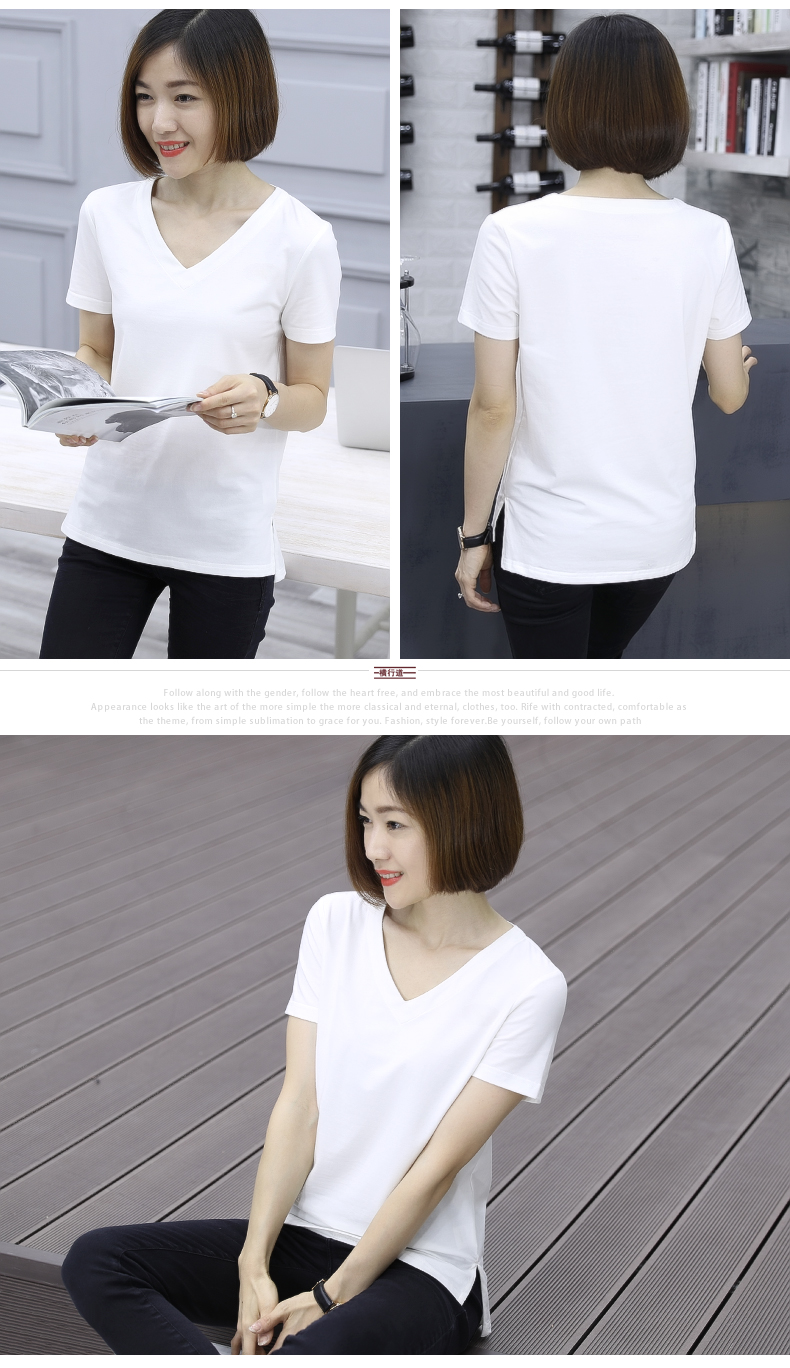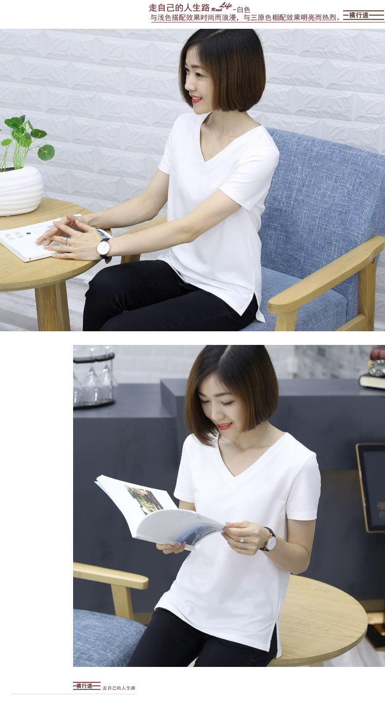 2019夏裝新款黑色短袖女裝白色v領t恤女士寬松打底衫上衣大碼半袖1入