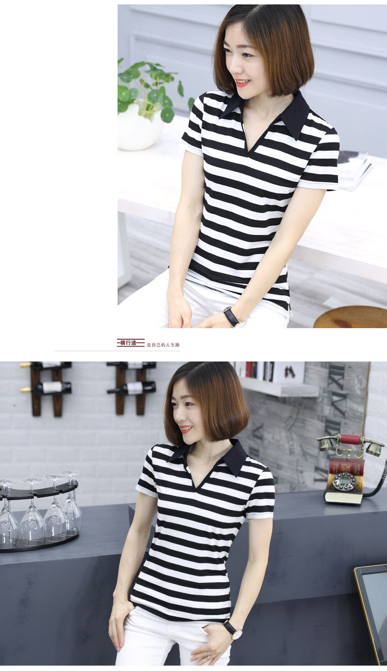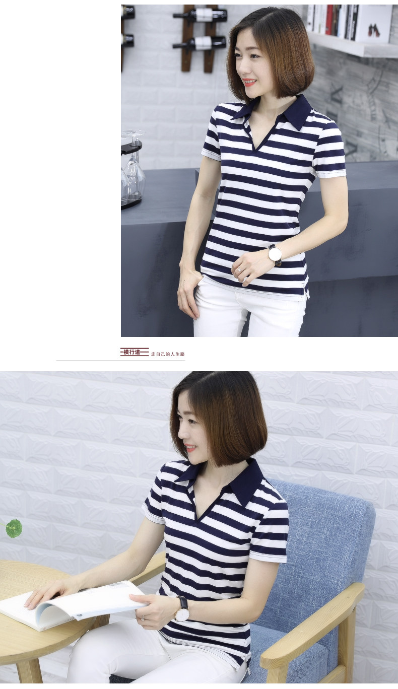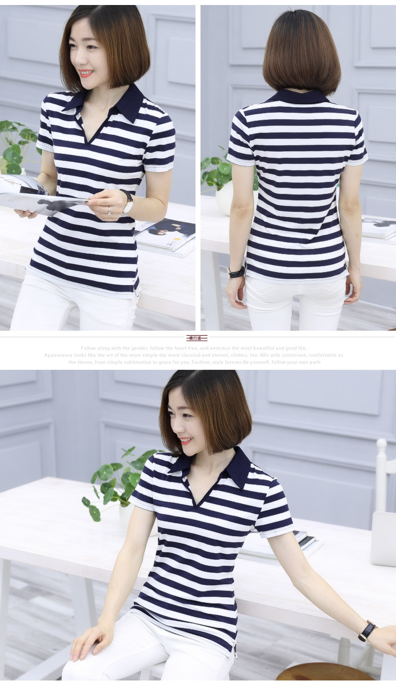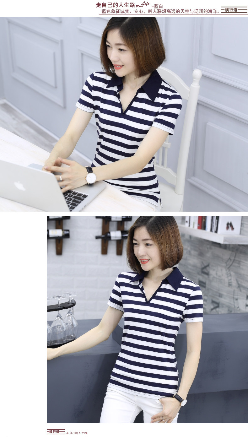 橫行道海軍風條紋短袖t恤女襯衫領半袖v領上衣翻領打底衫下擺開叉1入