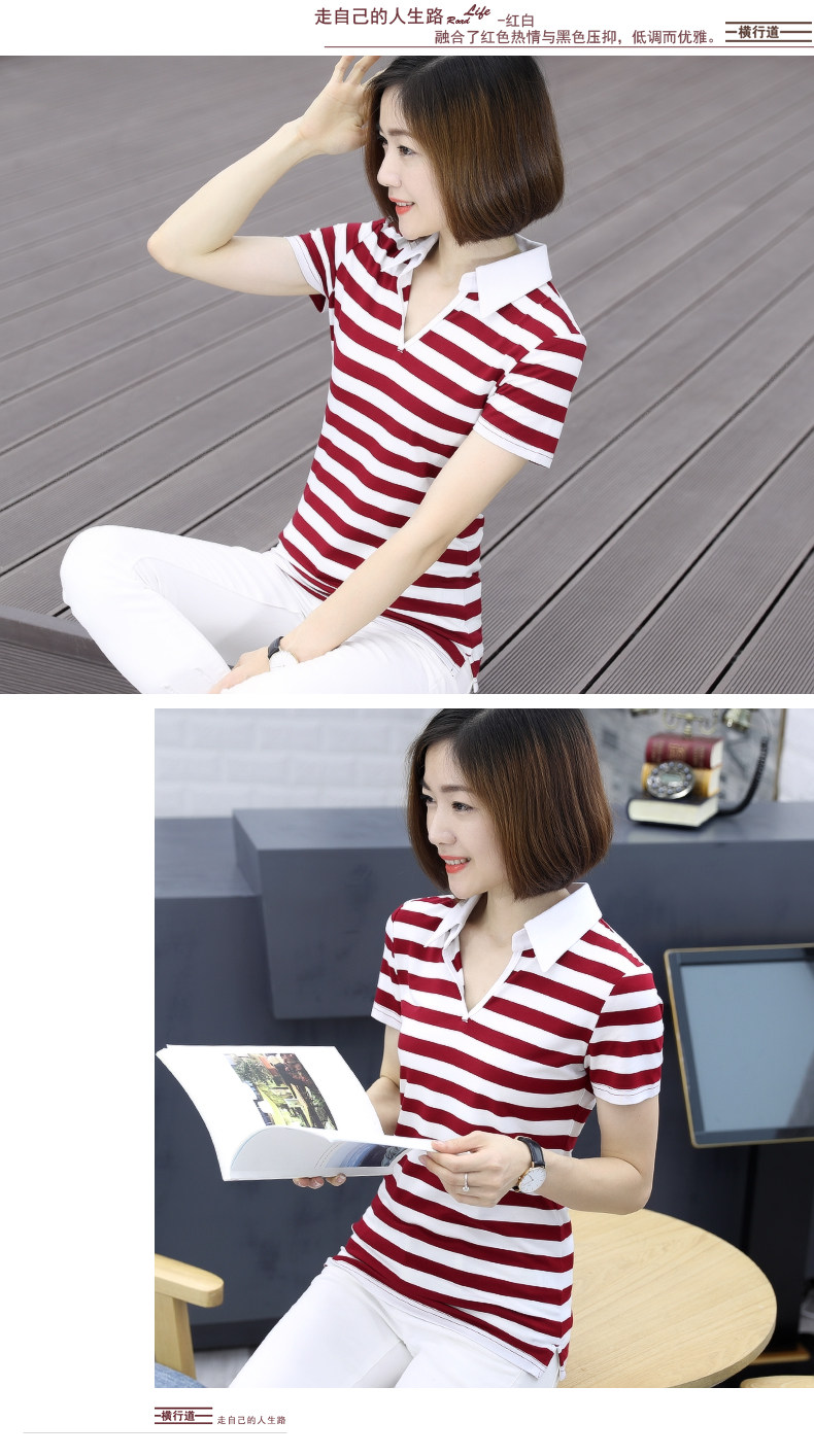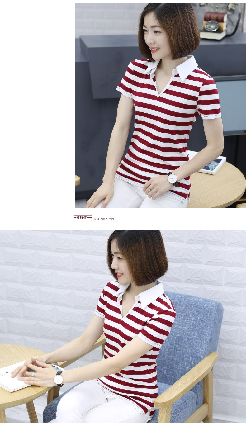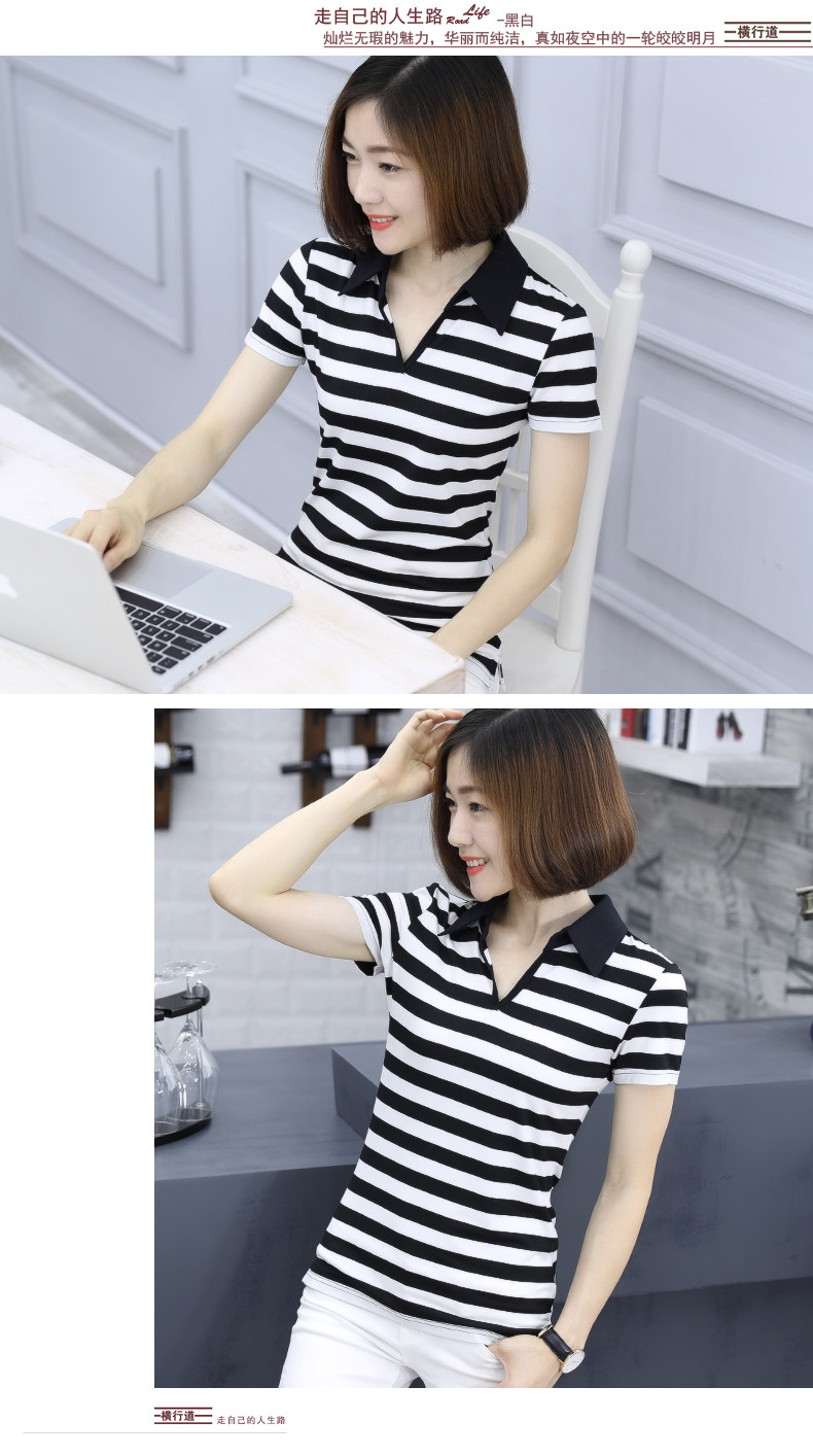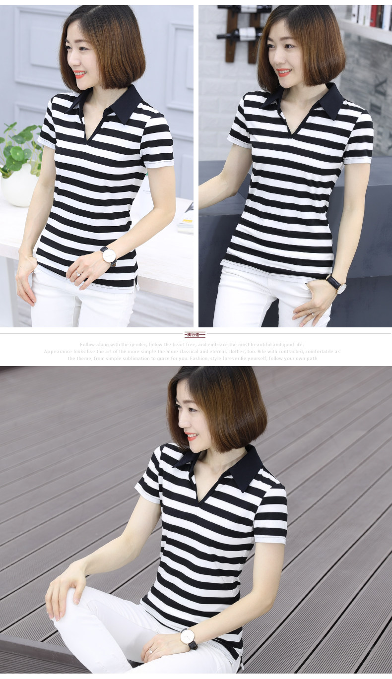 橫行道海軍風條紋短袖t恤女襯衫領半袖v領上衣翻領打底衫下擺開叉1入