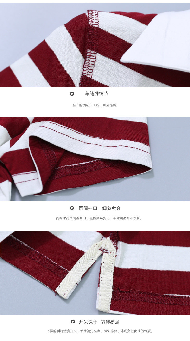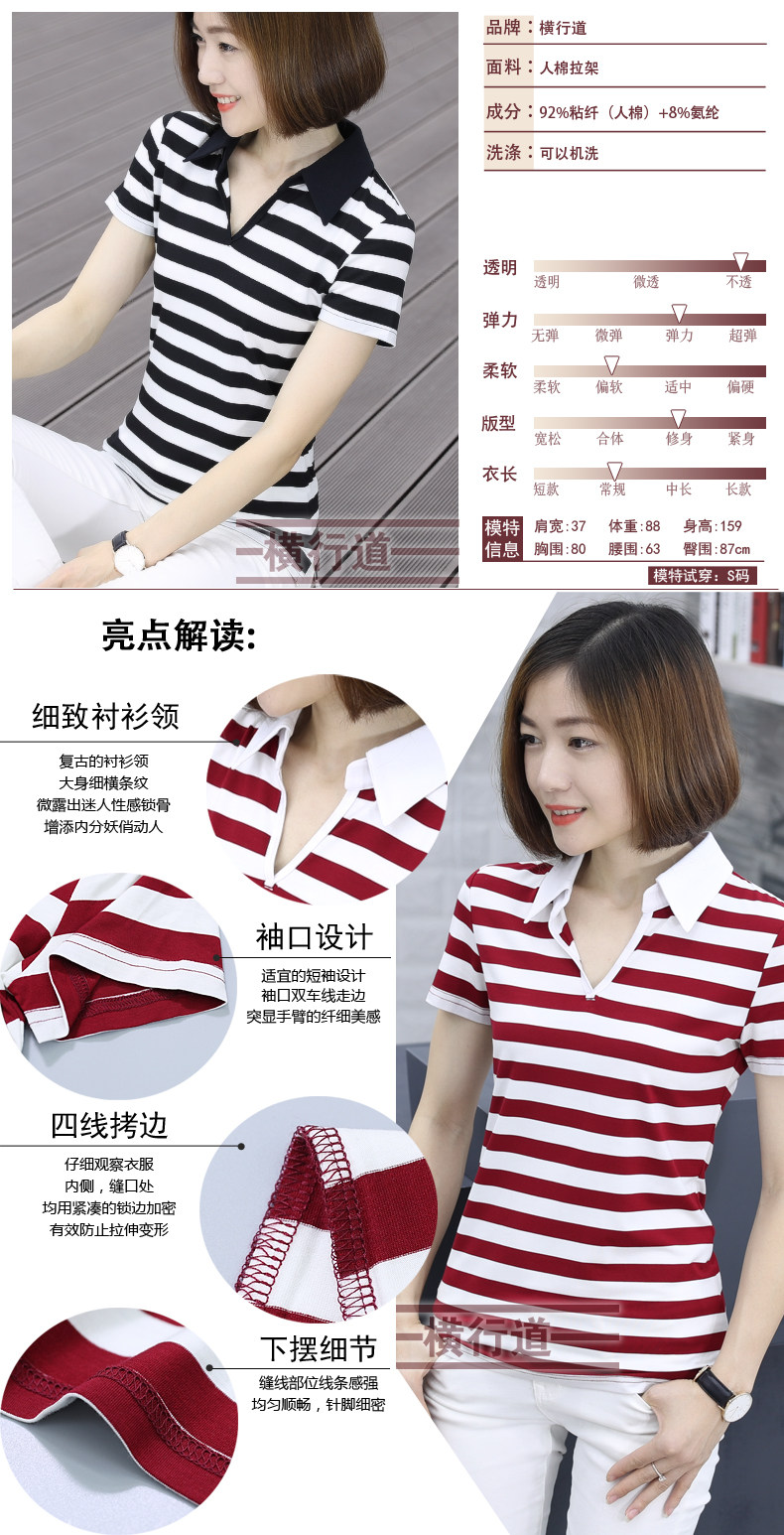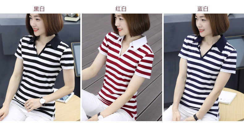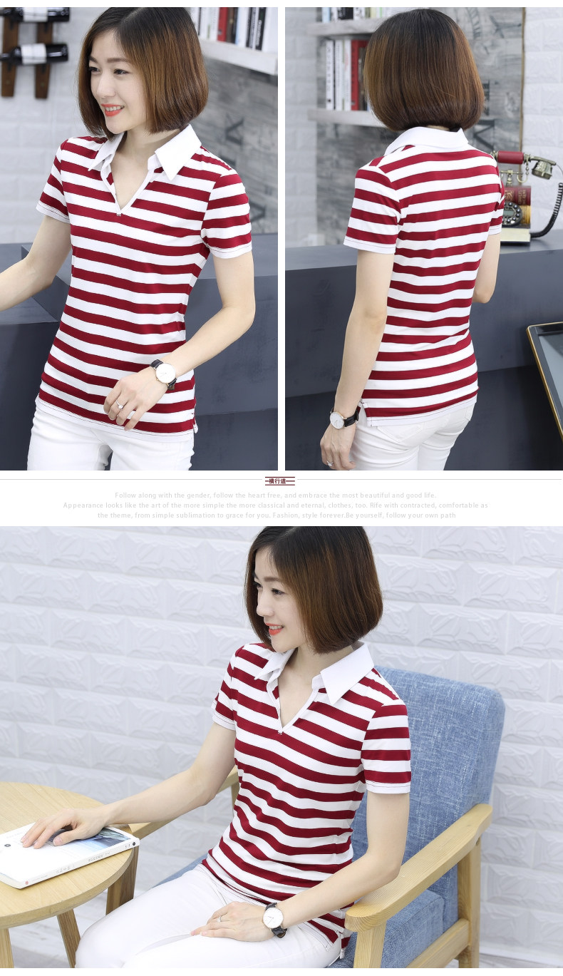 橫行道海軍風條紋短袖t恤女襯衫領半袖v領上衣翻領打底衫下擺開叉1入