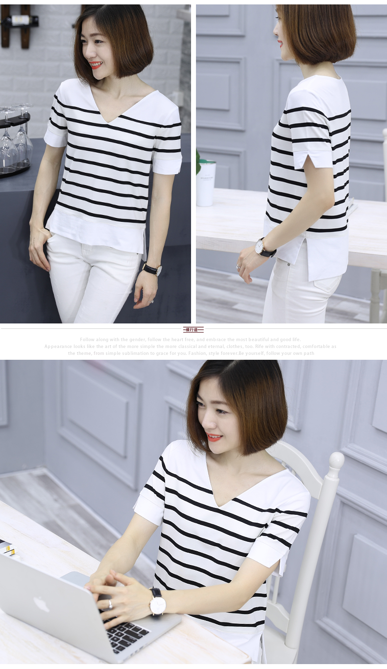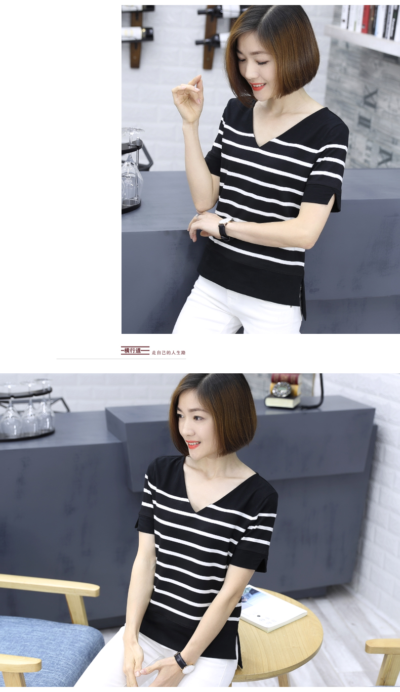 2019夏裝黑白條紋v領半袖休閑寬松開叉t恤女上衣莫代爾短袖打底衫1入