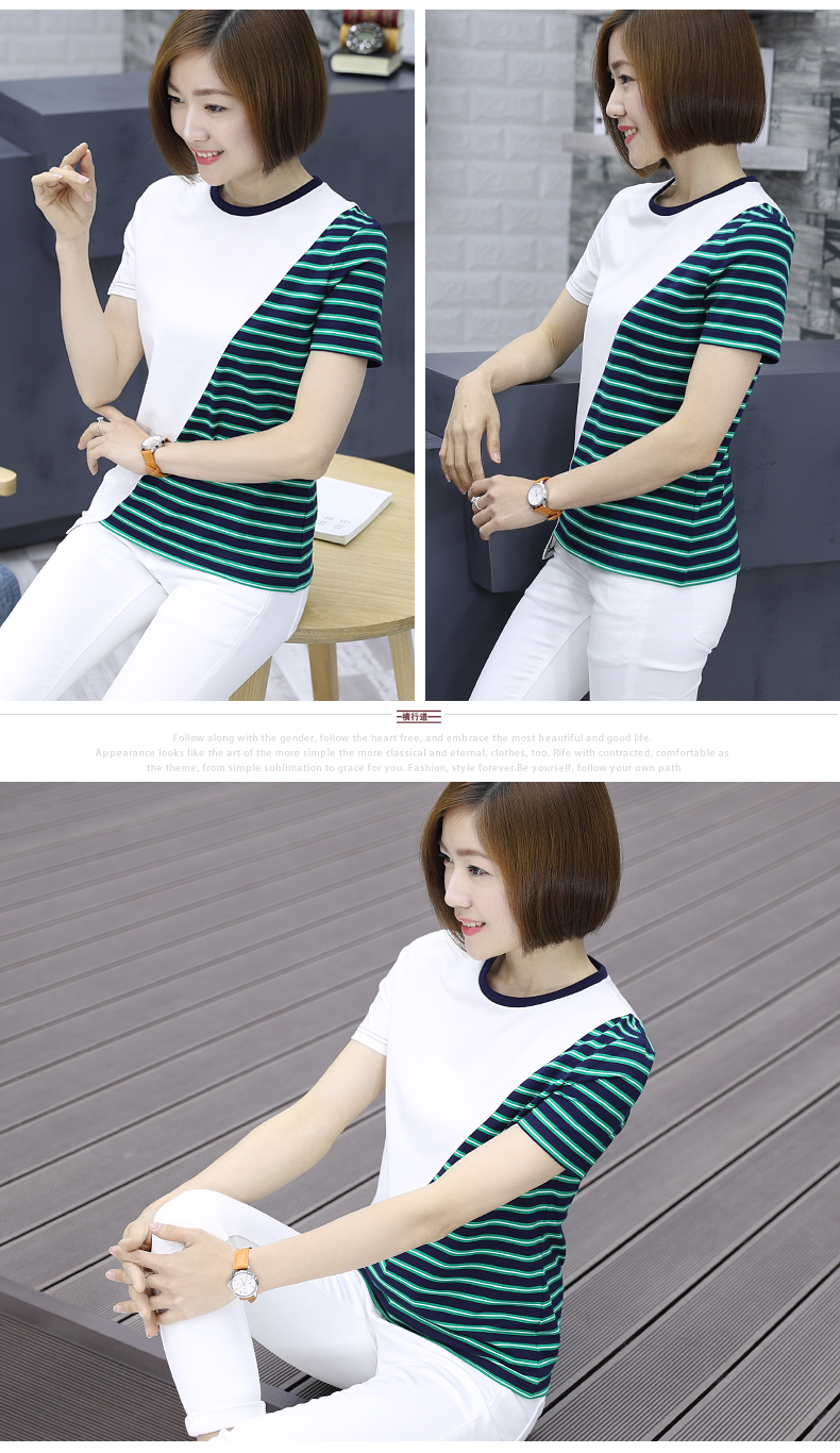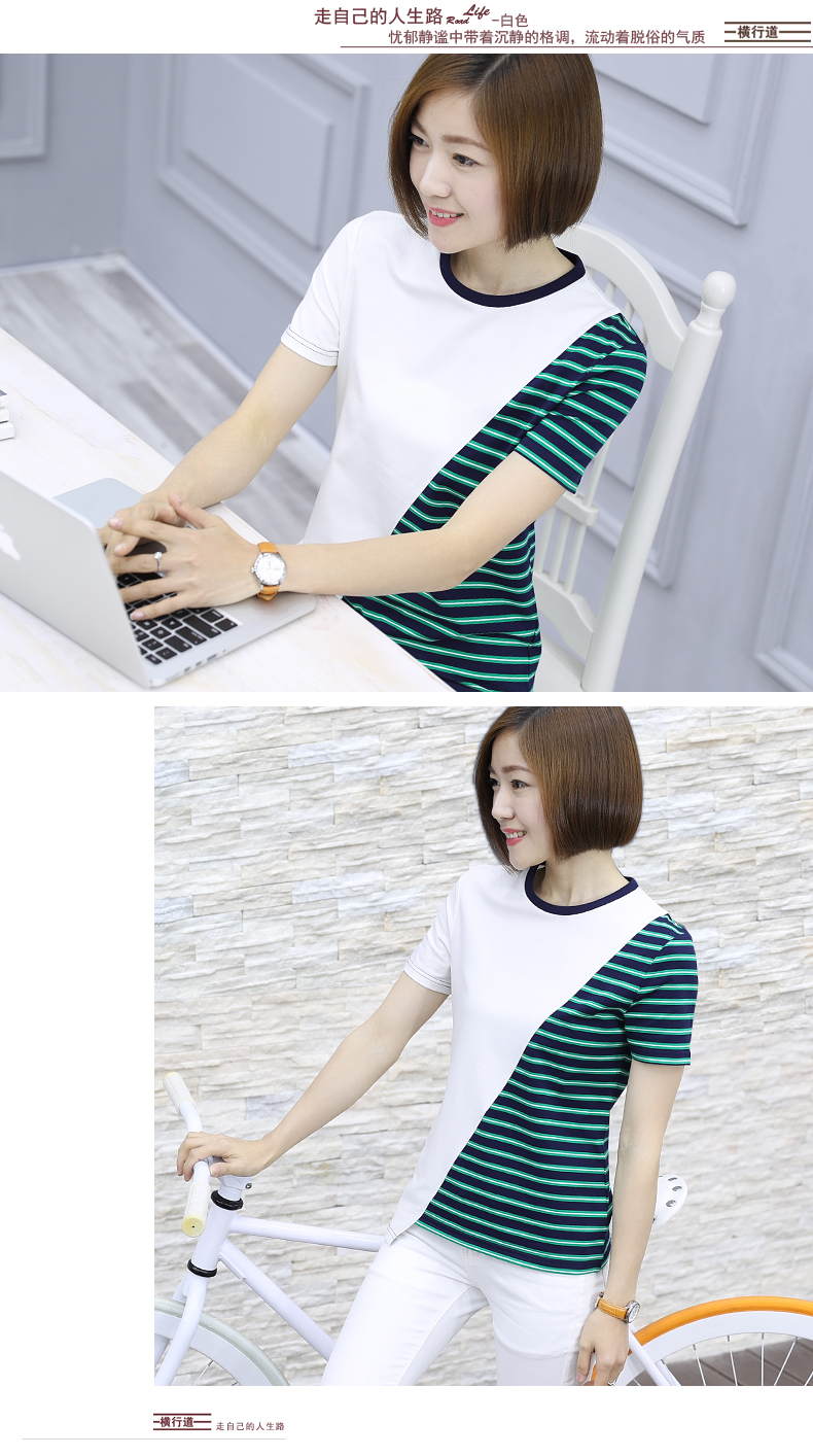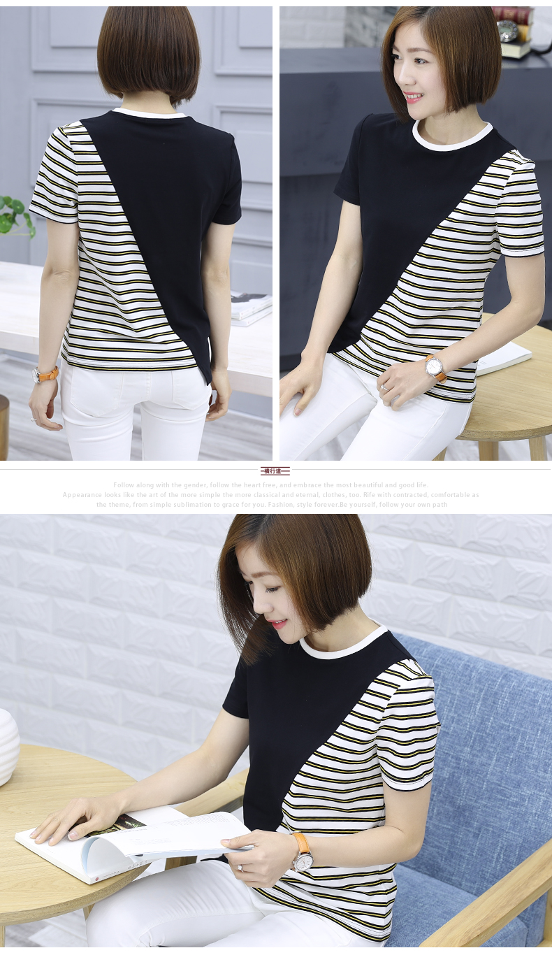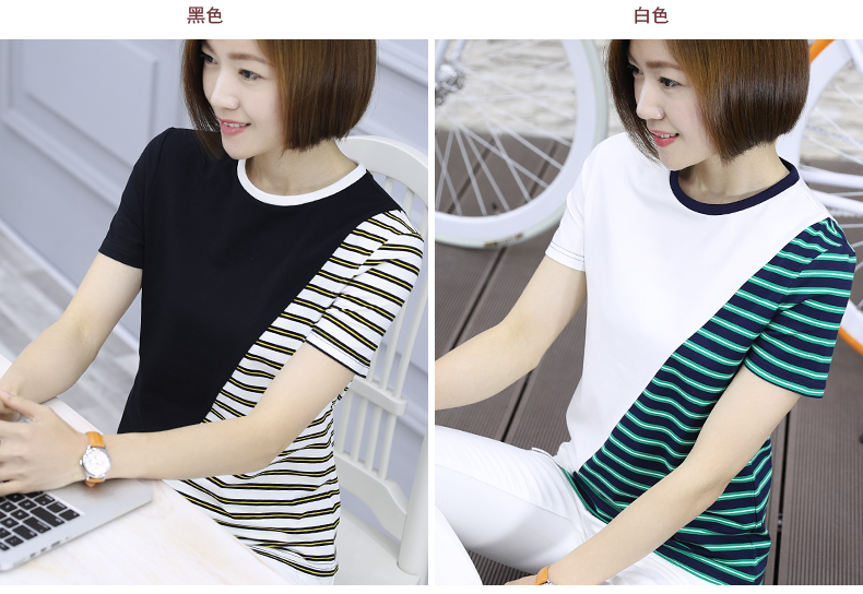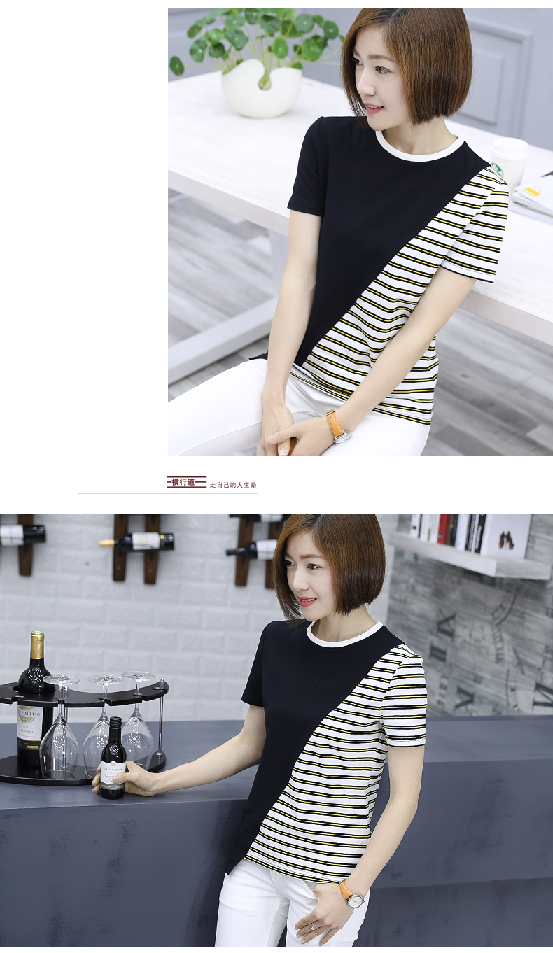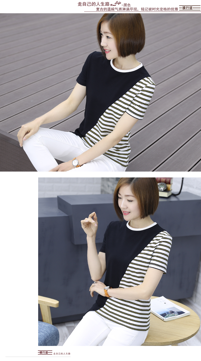 韓版女裝寬松短袖條紋t恤小圓領棉質打底衫拼接上衣服半袖體恤夏1入