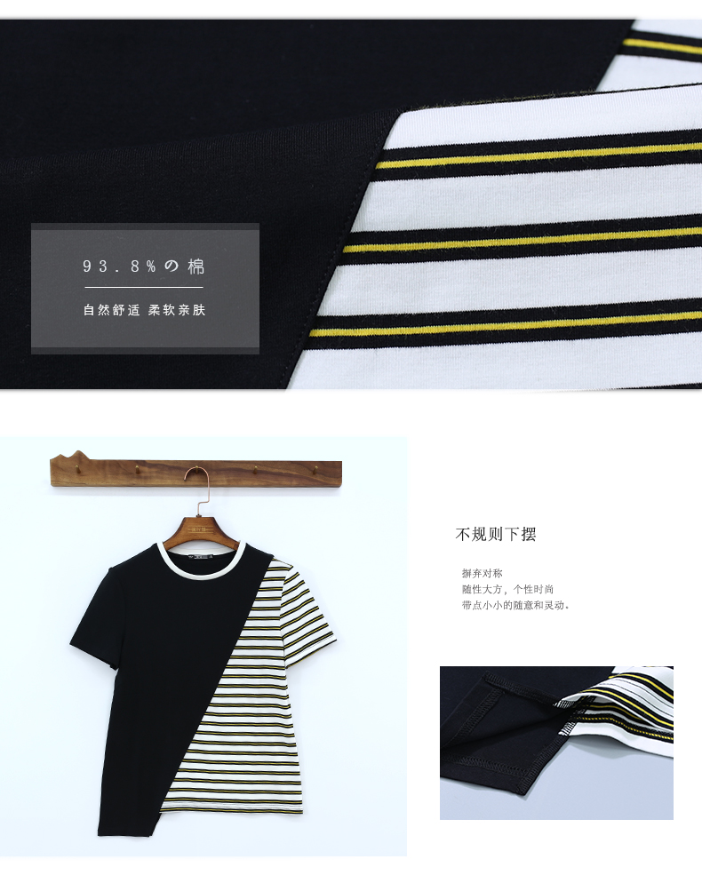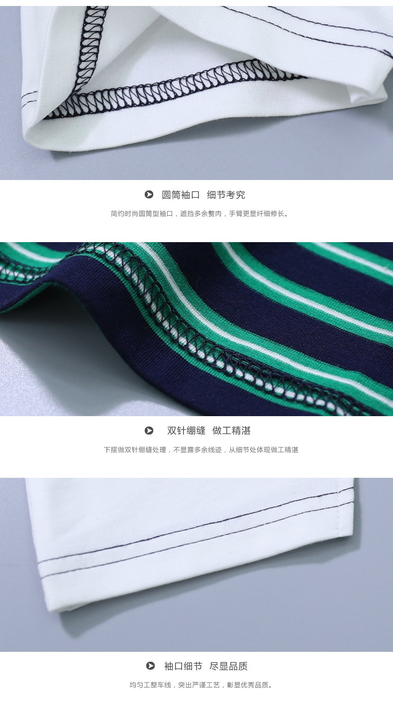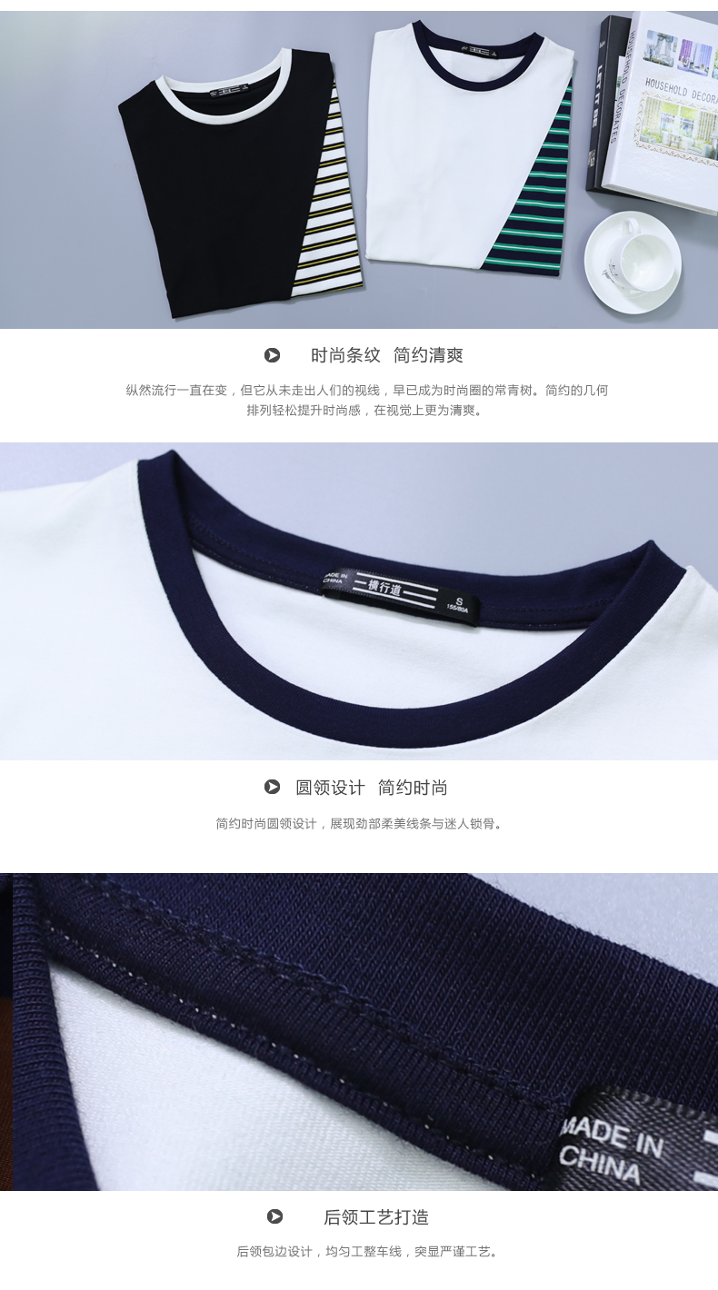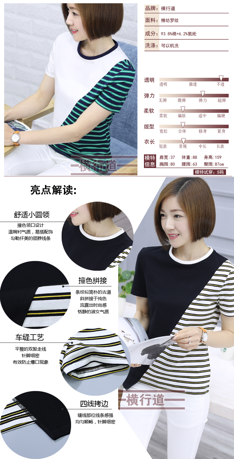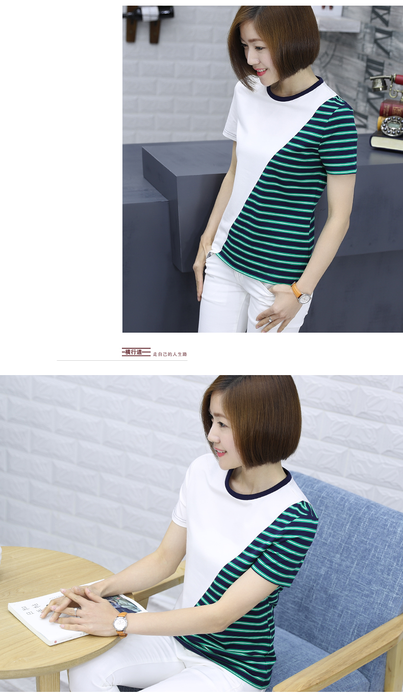 韓版女裝寬松短袖條紋t恤小圓領棉質打底衫拼接上衣服半袖體恤夏1入