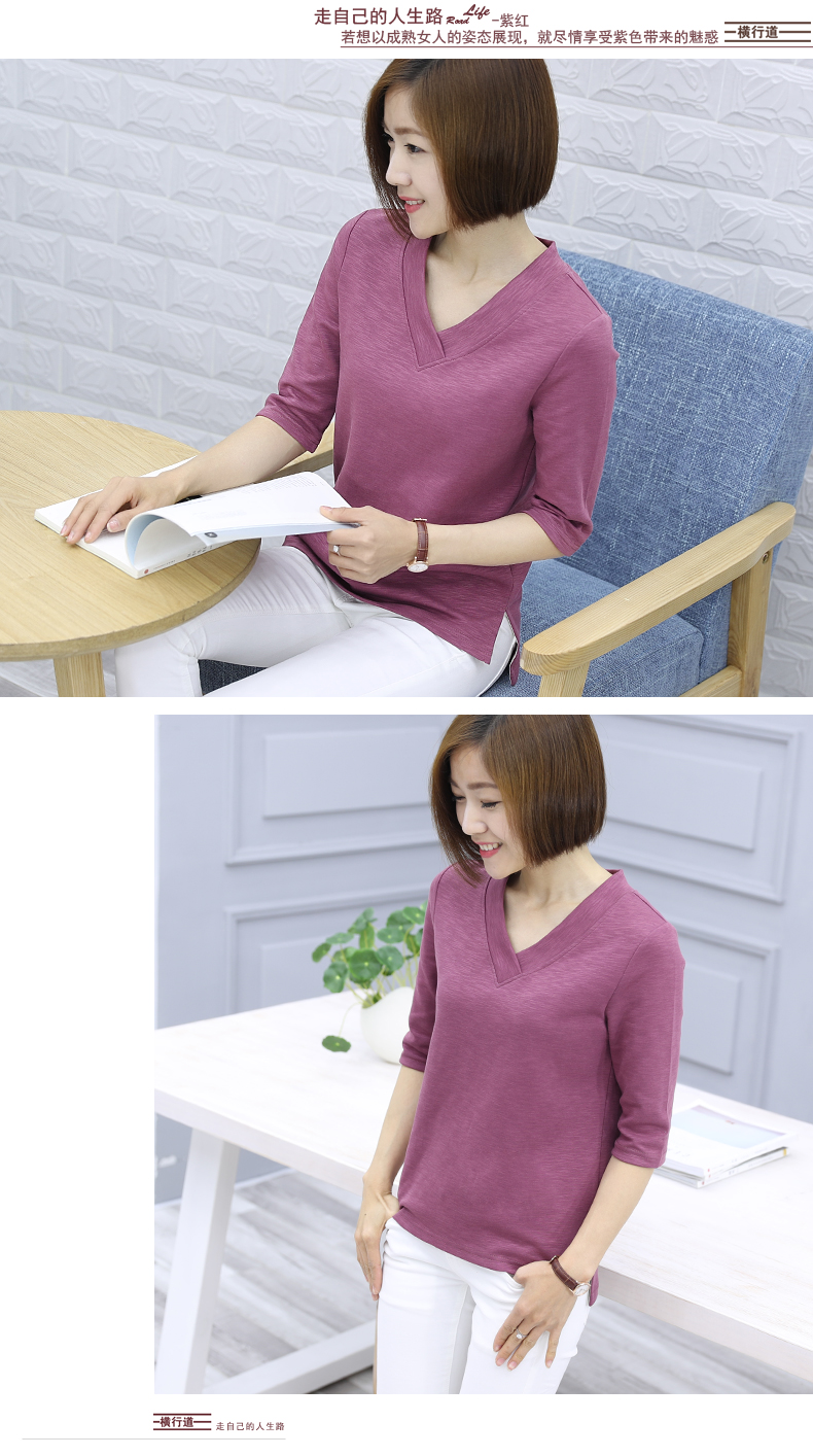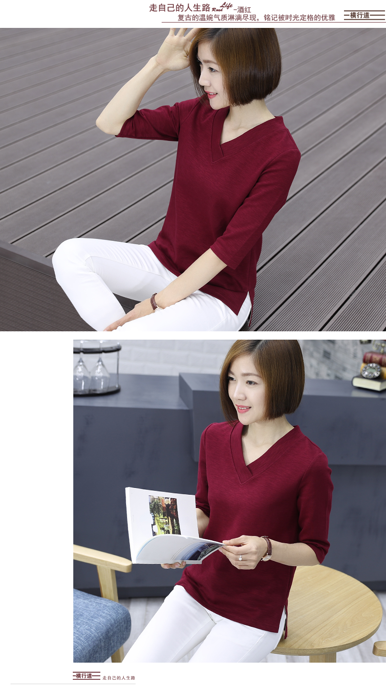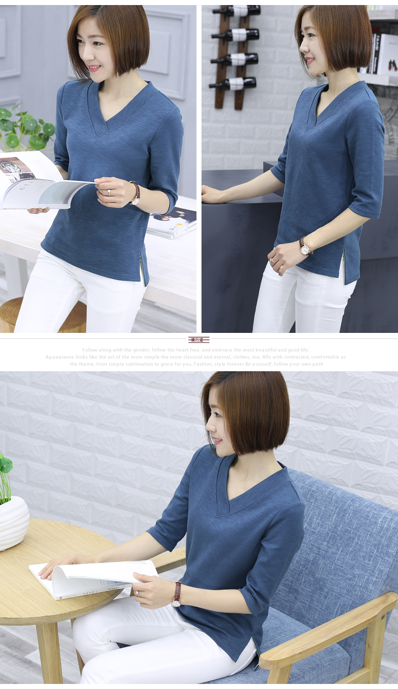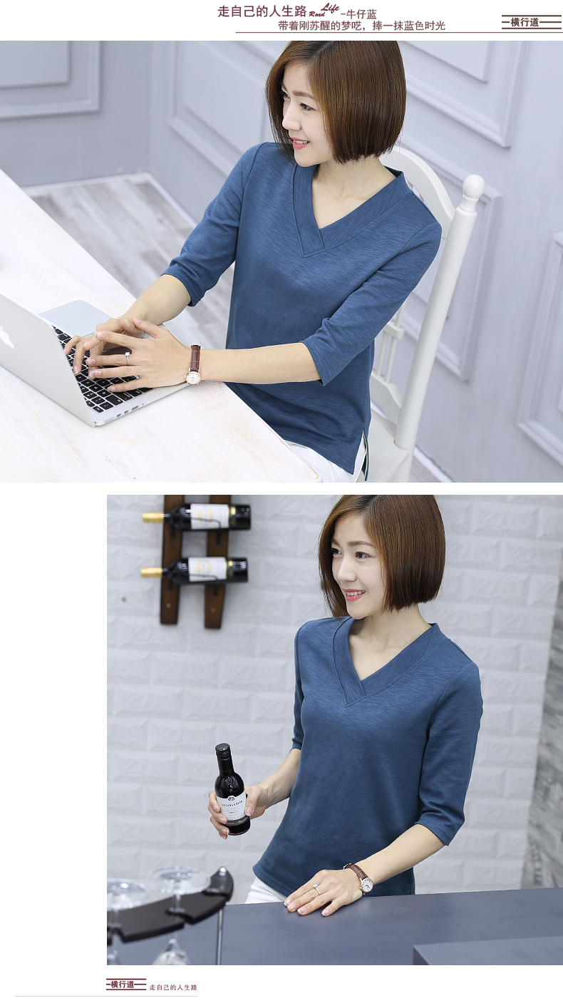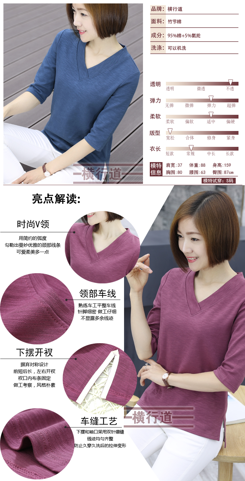 2019秋裝新款女裝竹節棉寬松上衣服七分袖打底衫中袖v領t恤大碼1入