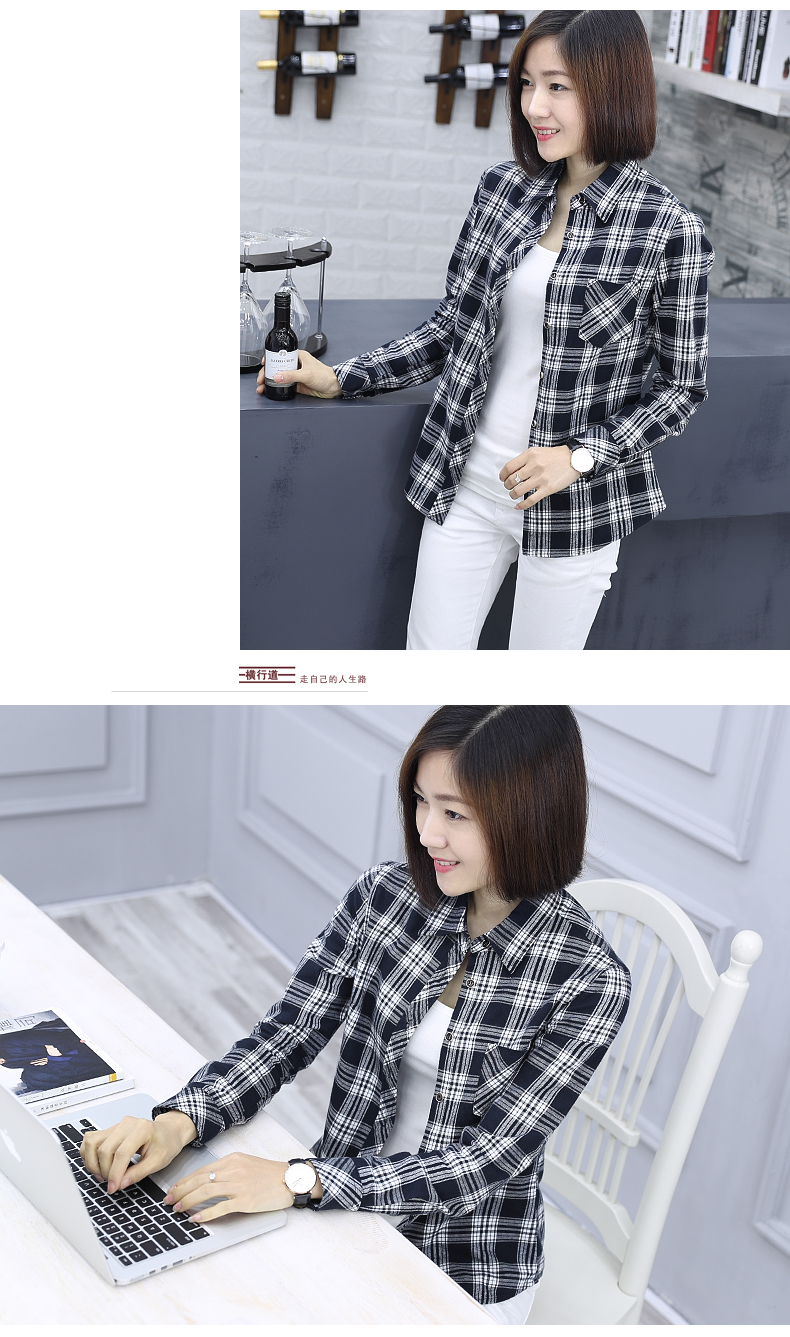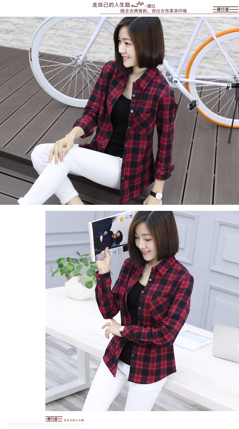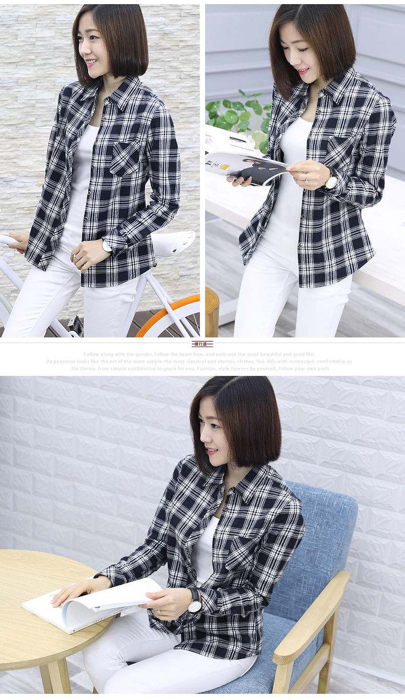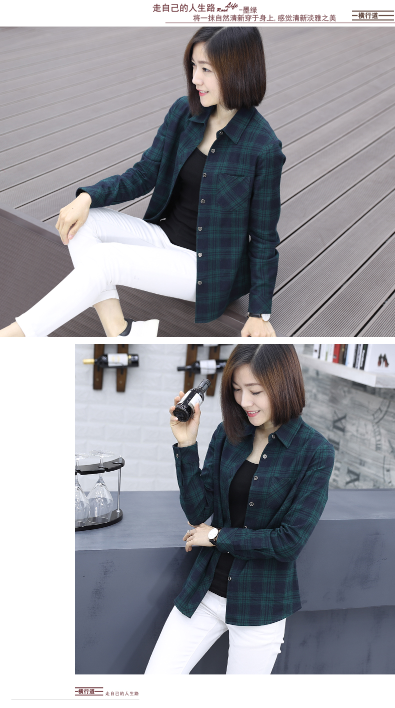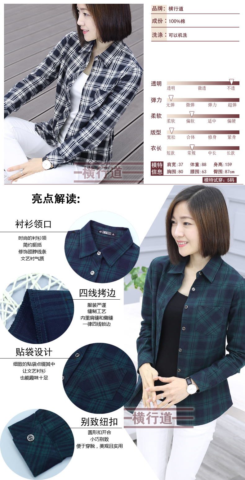 2019秋裝新款大碼純棉格子襯衫寬松上衣服外穿打底衫女裝休閑長袖1入