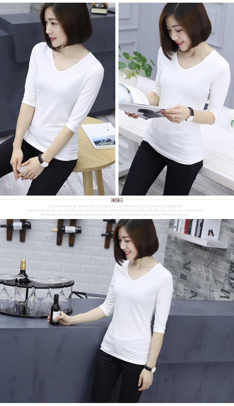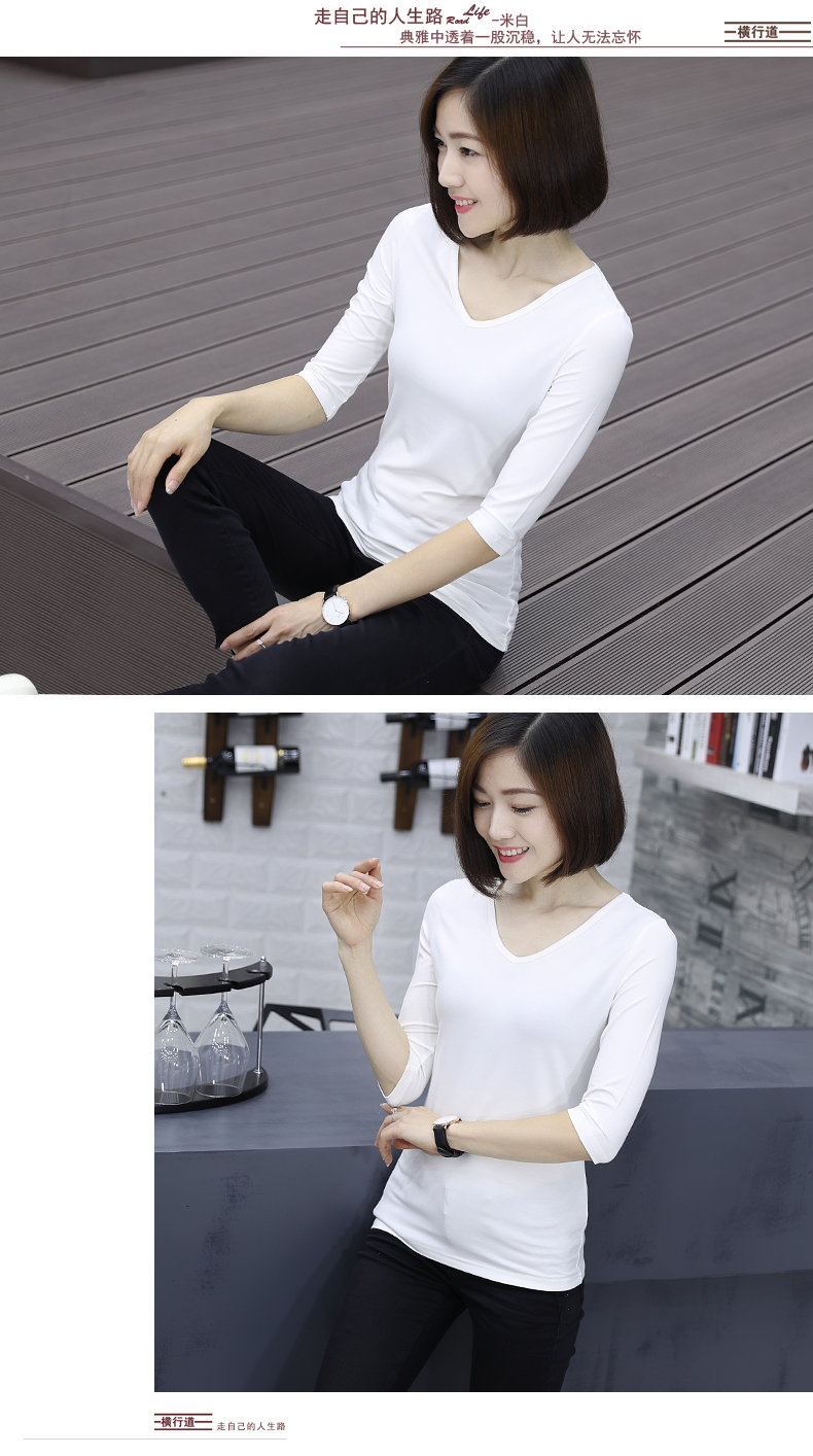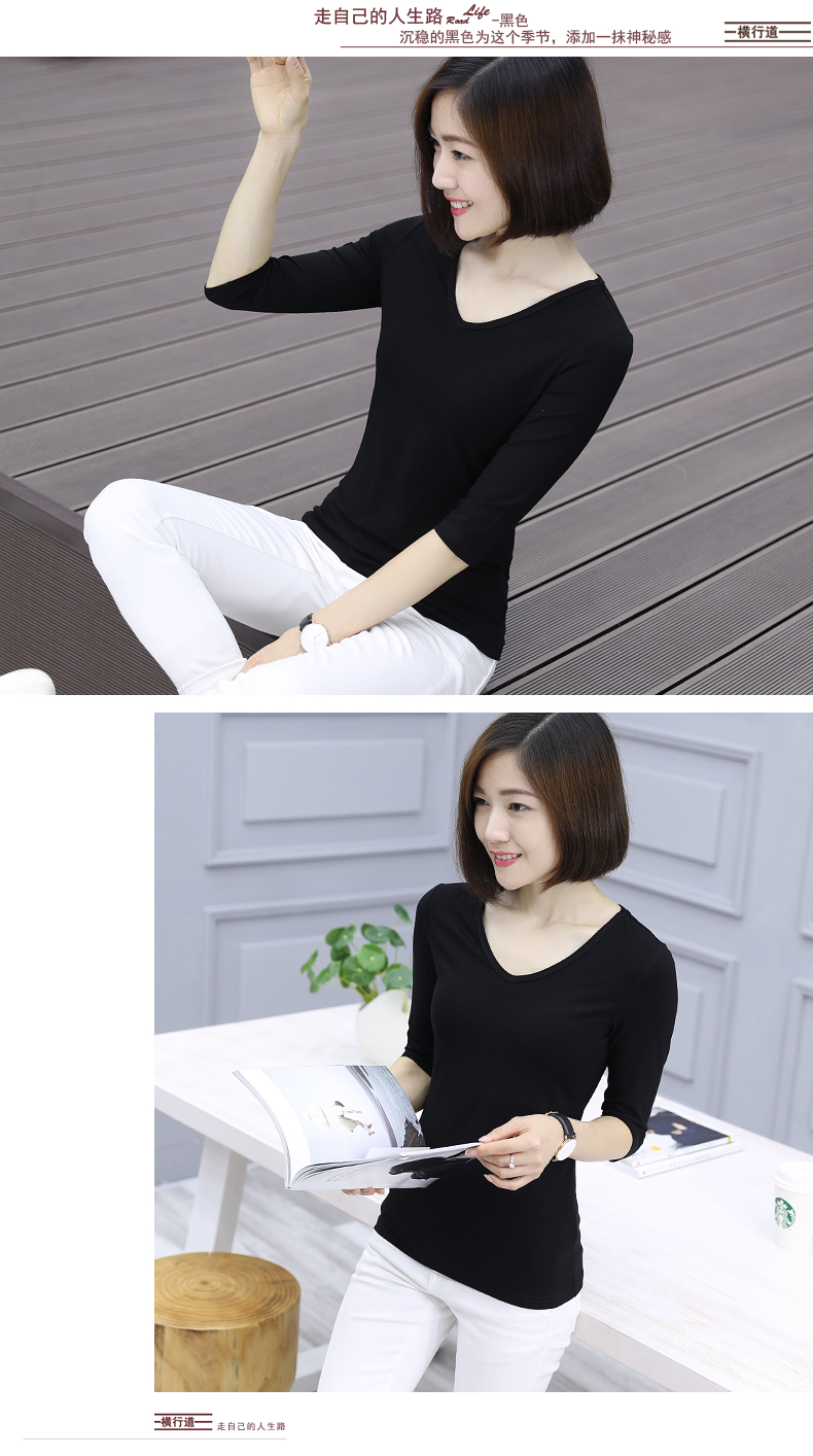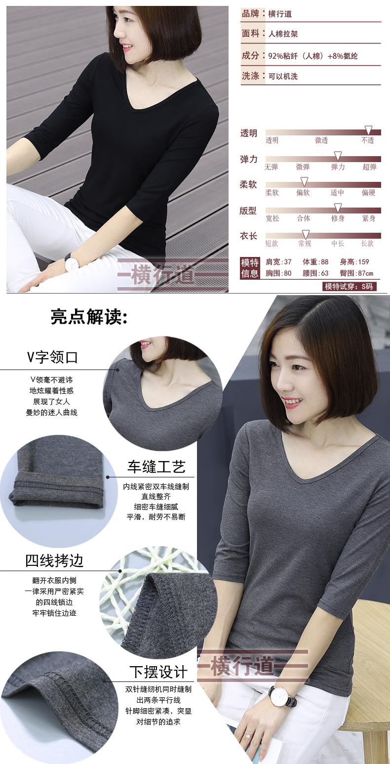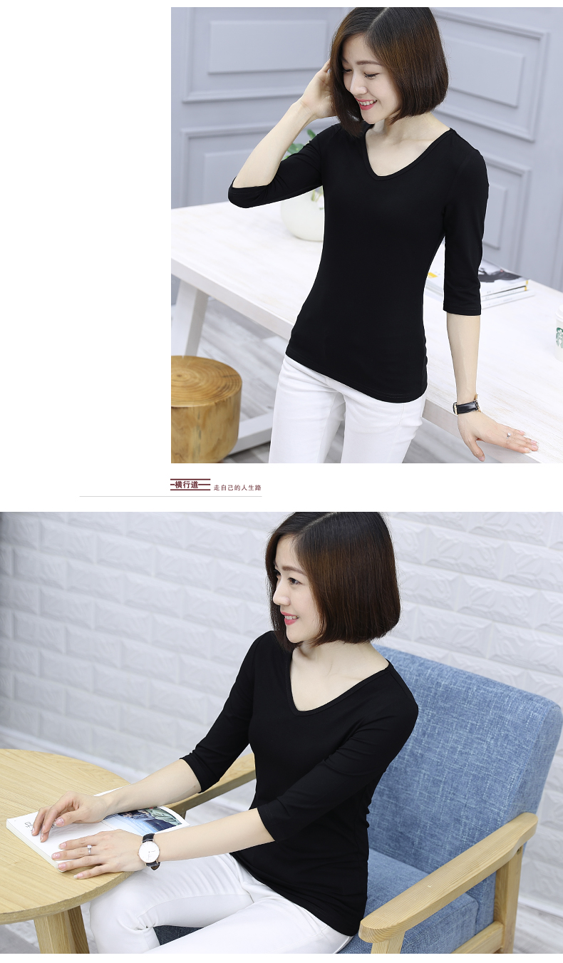 2019秋季五分中袖打底衫女修身七分袖v領t恤黑色秋裝韓版體恤女裝1入