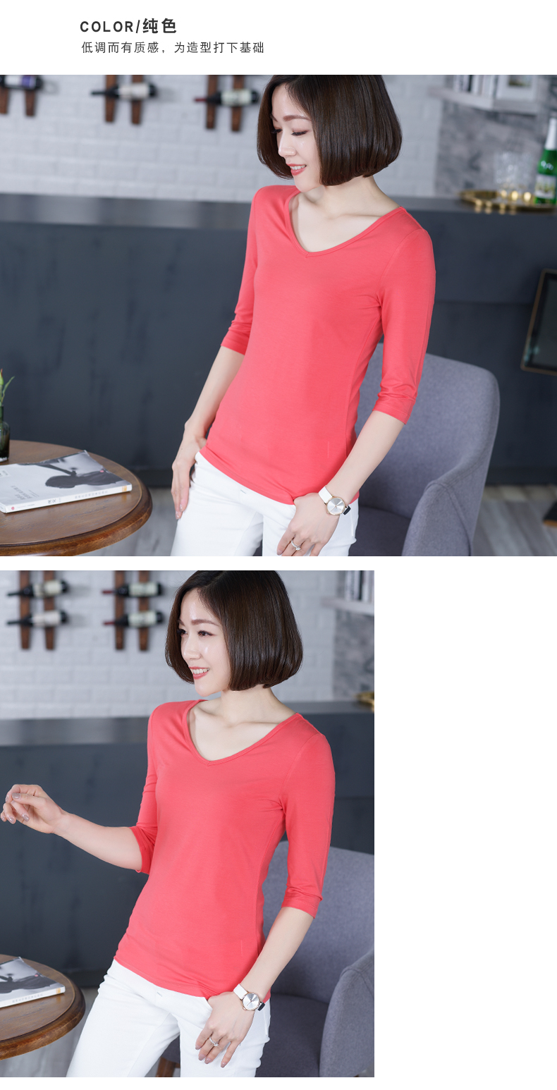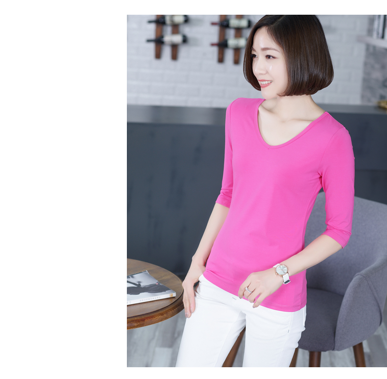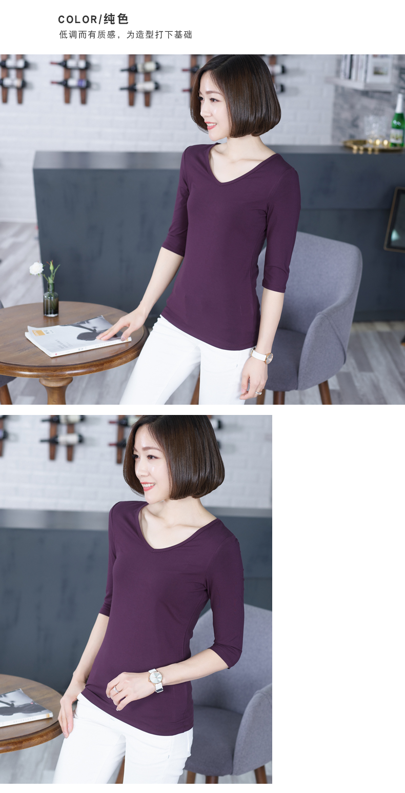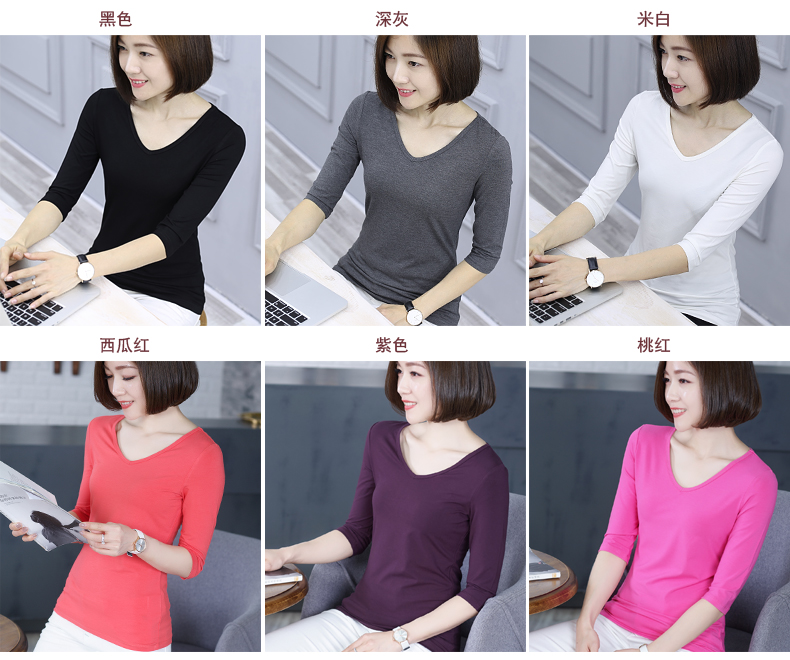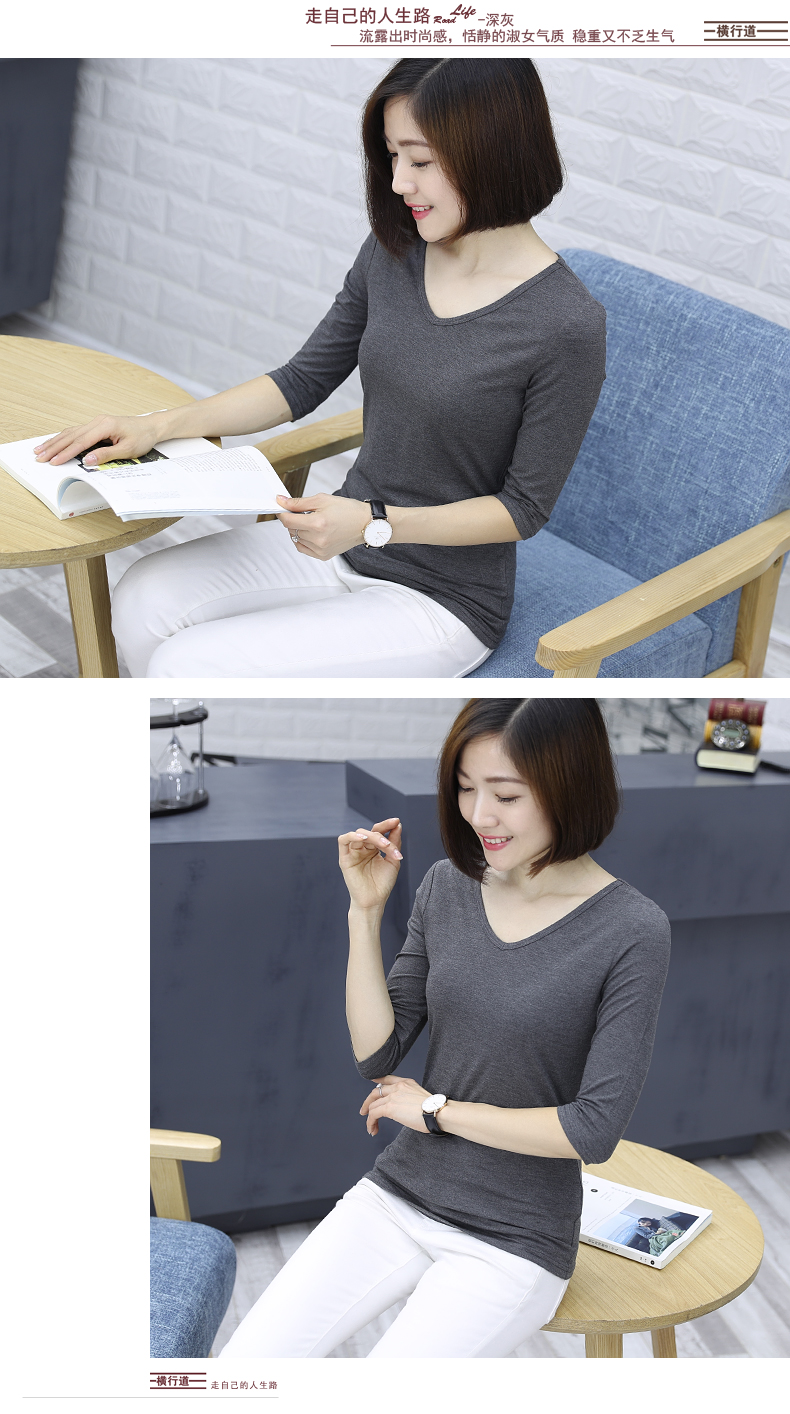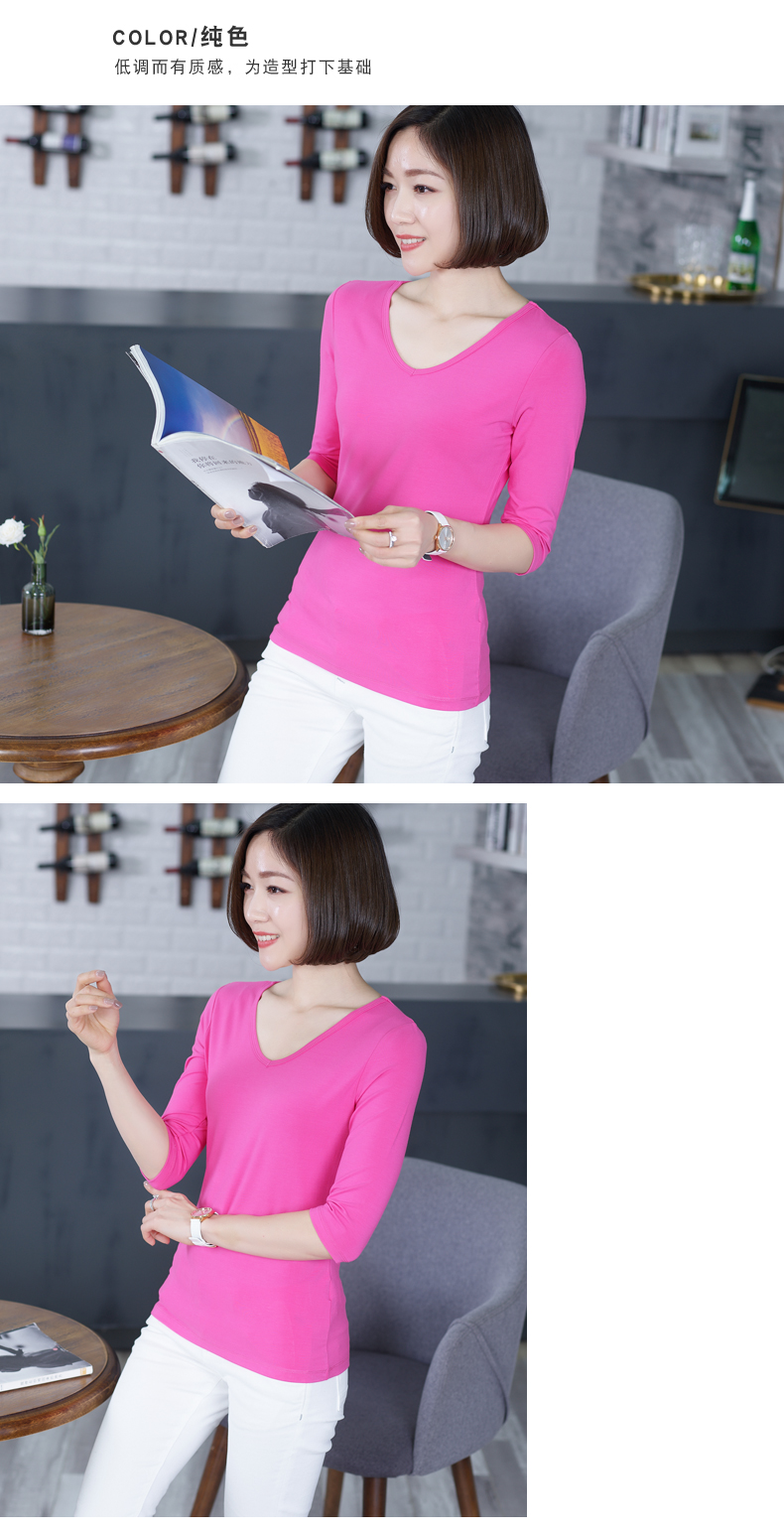 2019秋季五分中袖打底衫女修身七分袖v領t恤黑色秋裝韓版體恤女裝1入