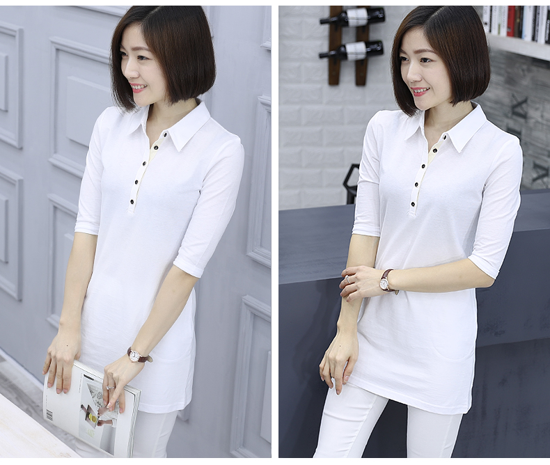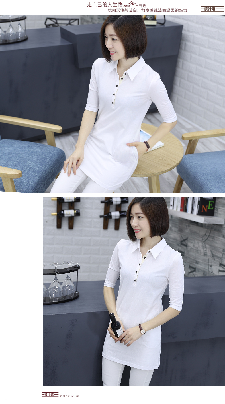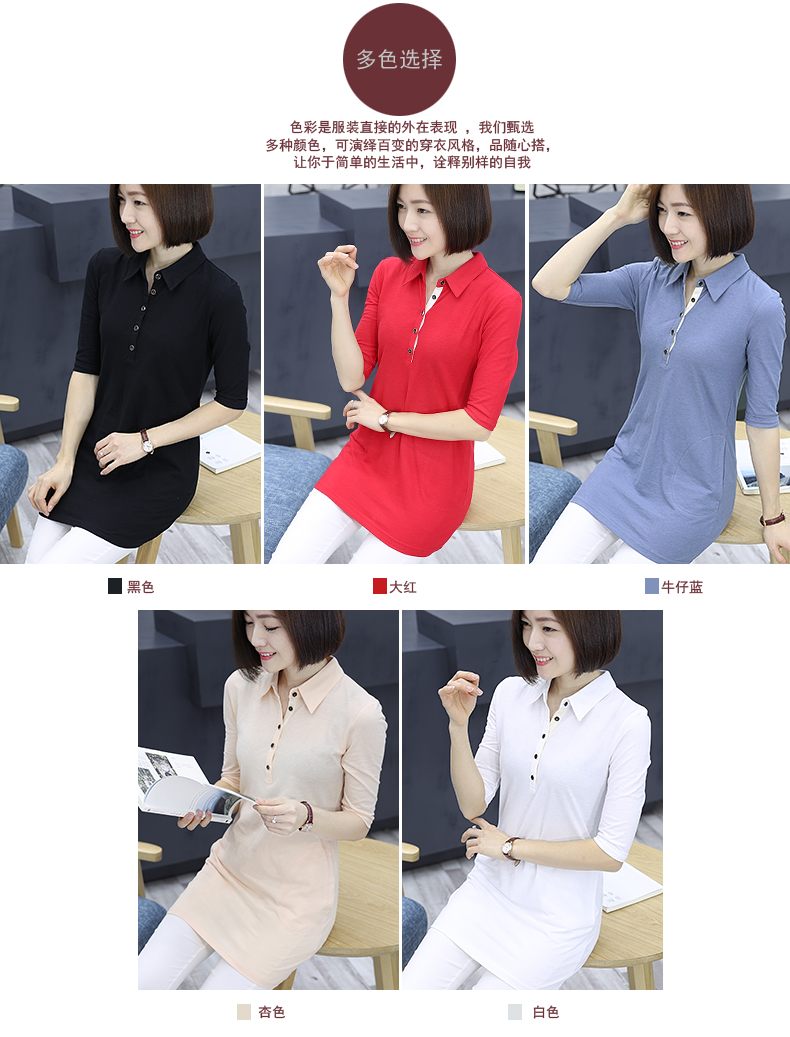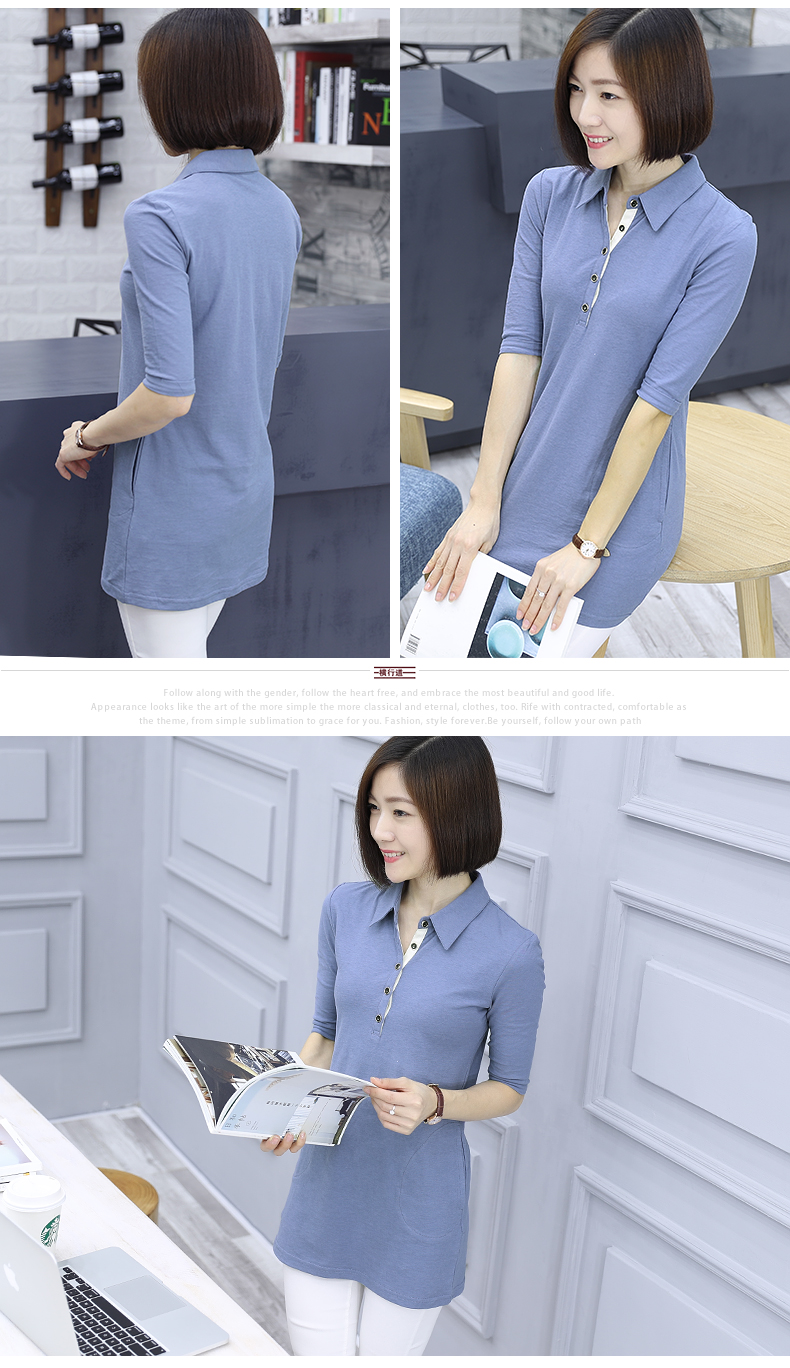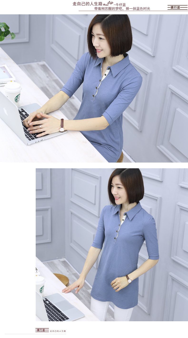 襯衫領全棉包臀打底衫棉麻七分袖t恤翻領純色中長款寬松大碼女裝1入