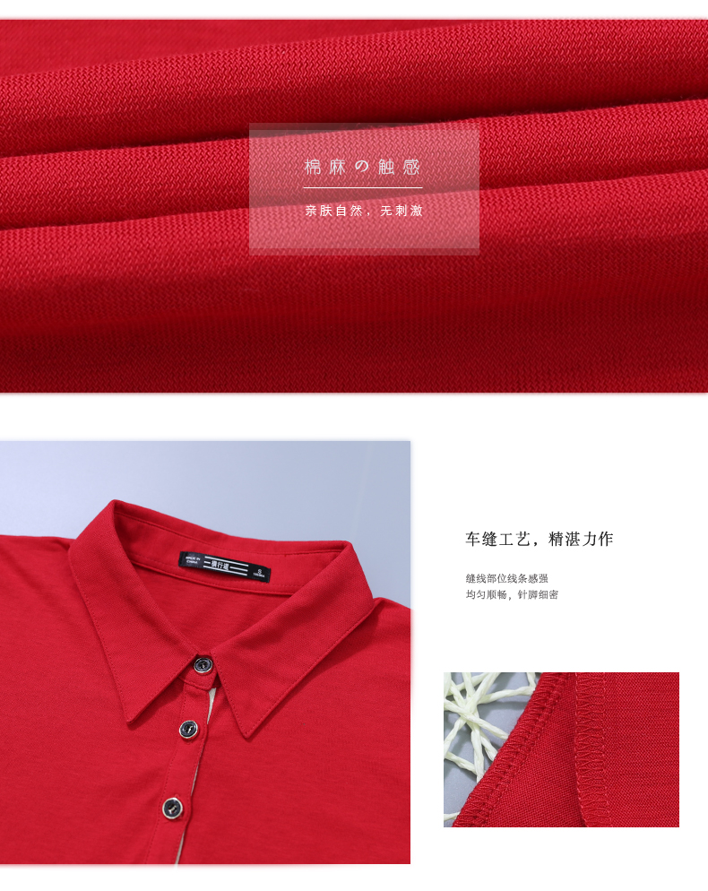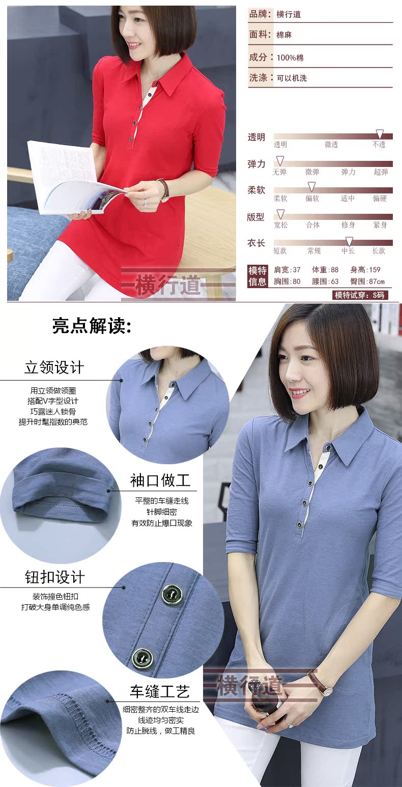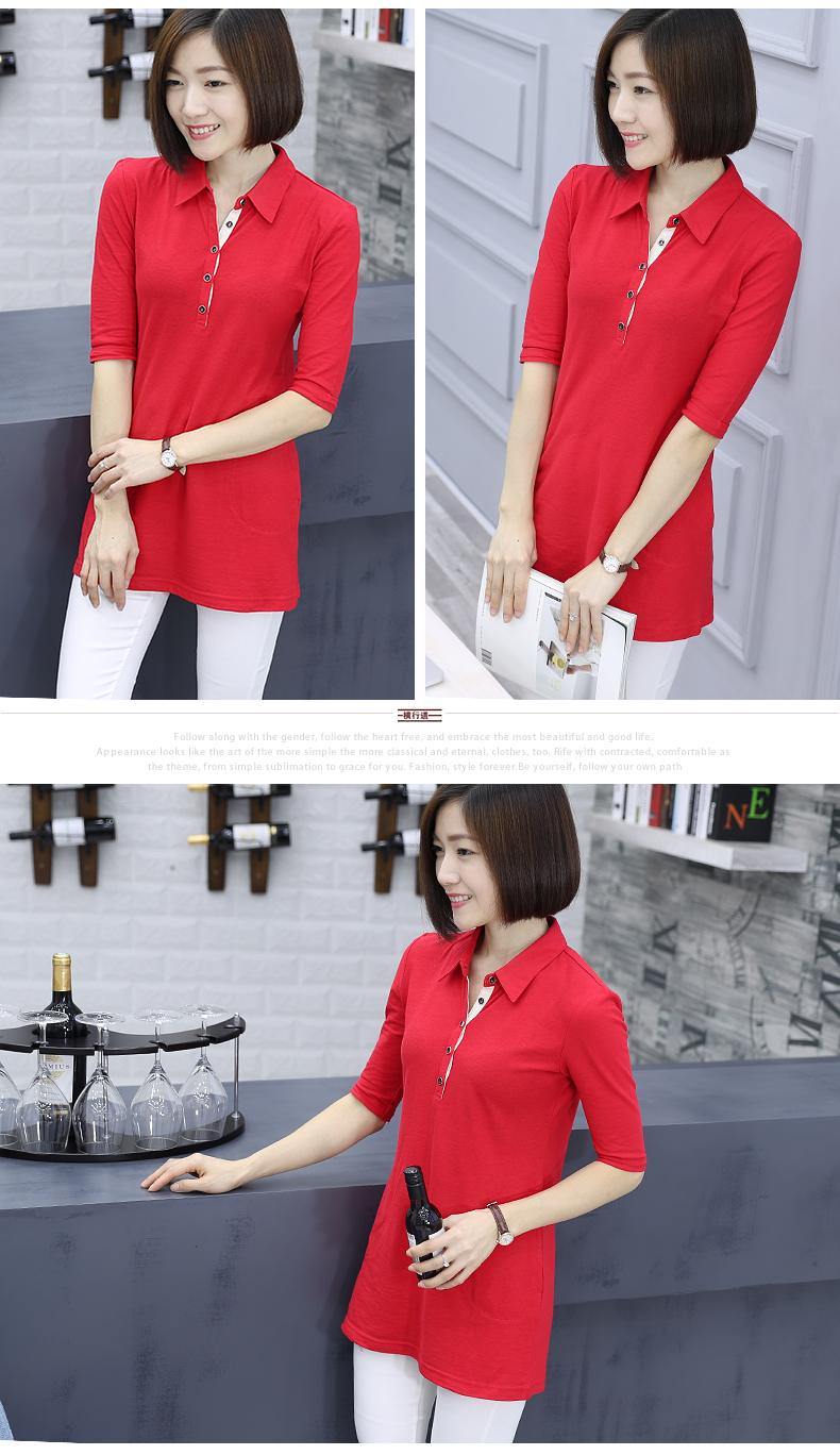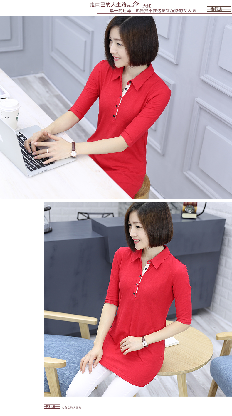 襯衫領全棉包臀打底衫棉麻七分袖t恤翻領純色中長款寬松大碼女裝1入