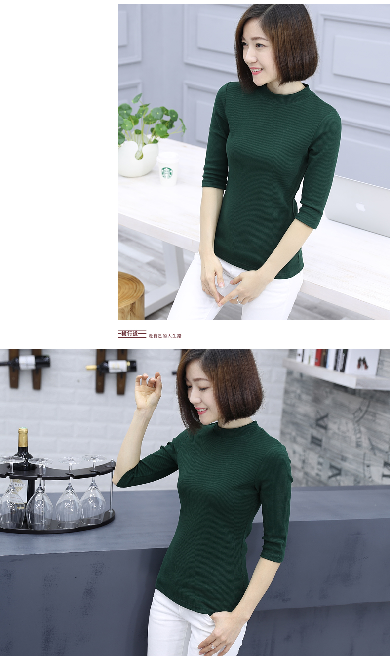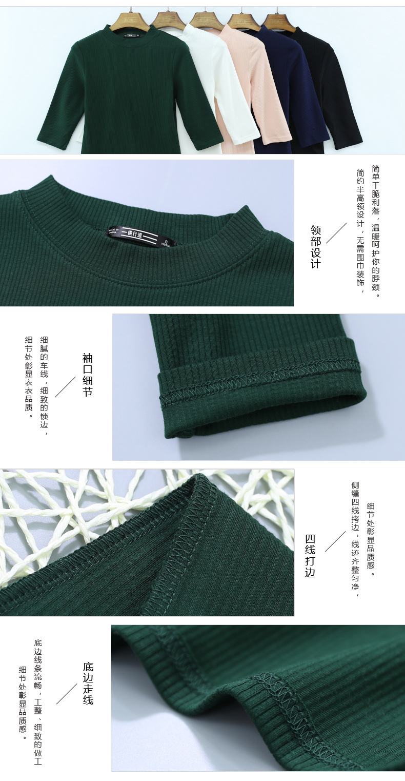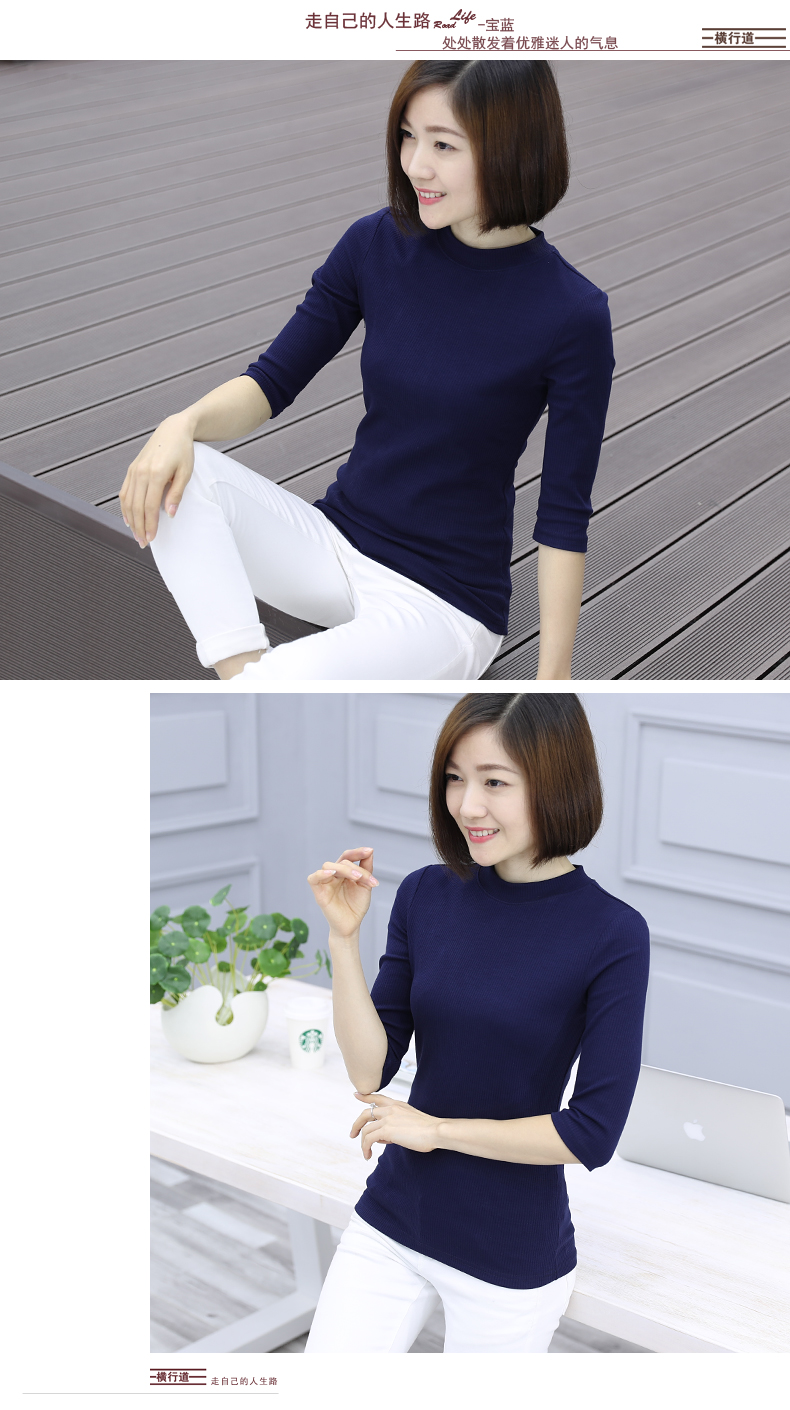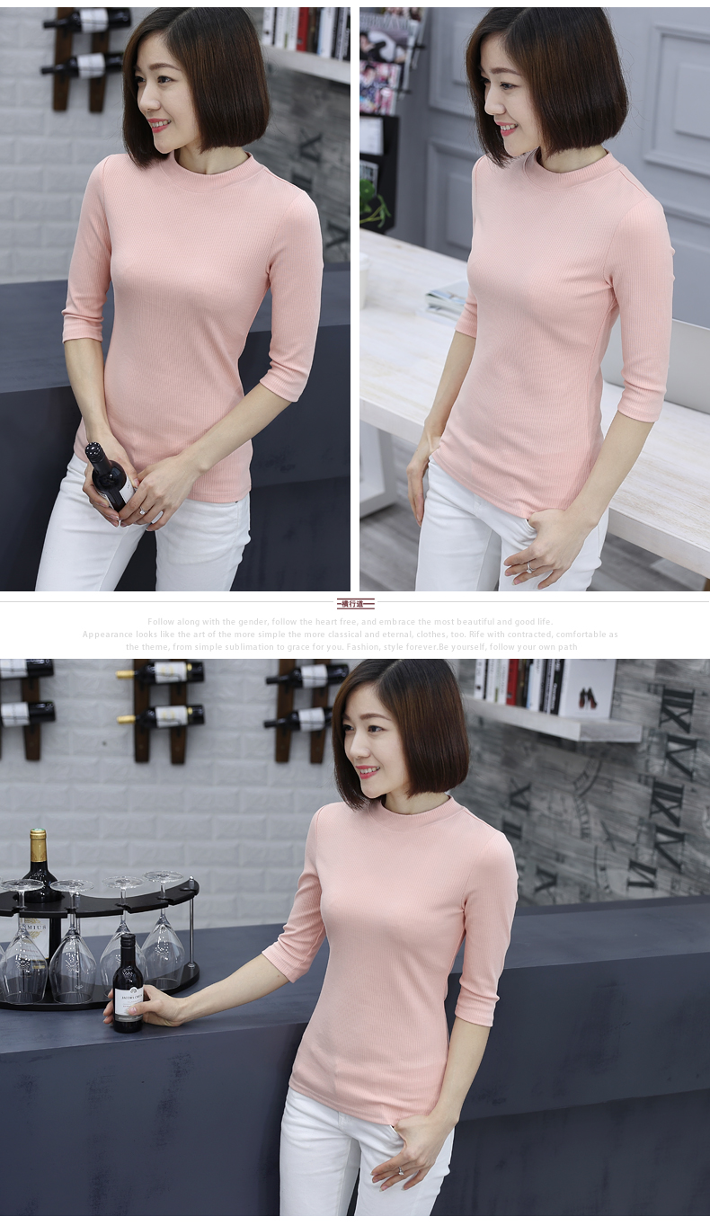 2019秋裝新款女裝半高領上衣服打底衫秋款七分袖中袖女士T恤純色1入