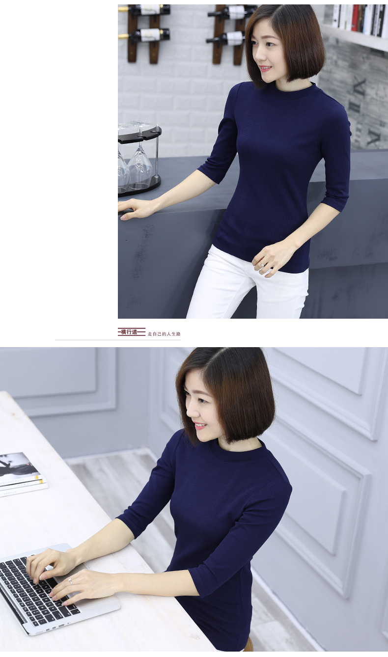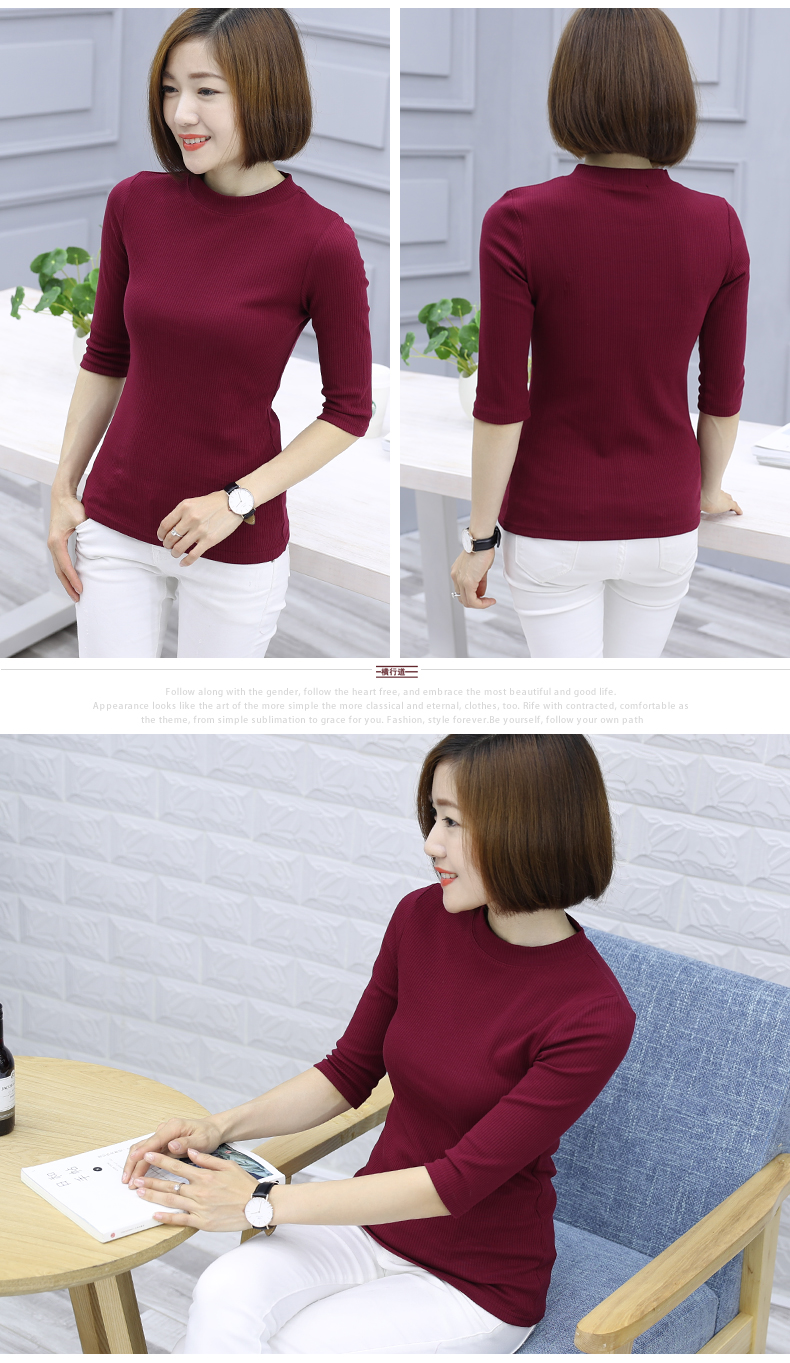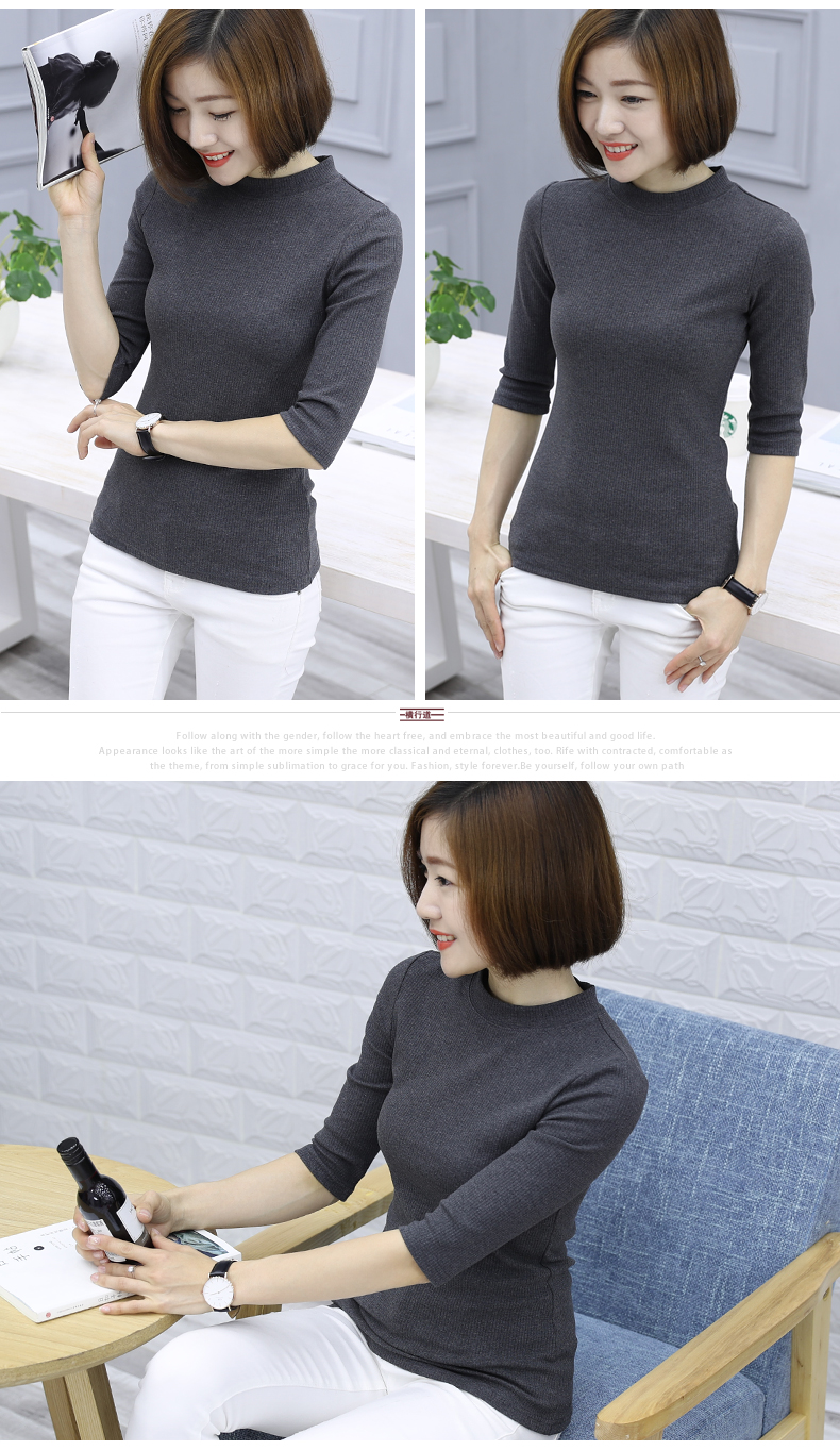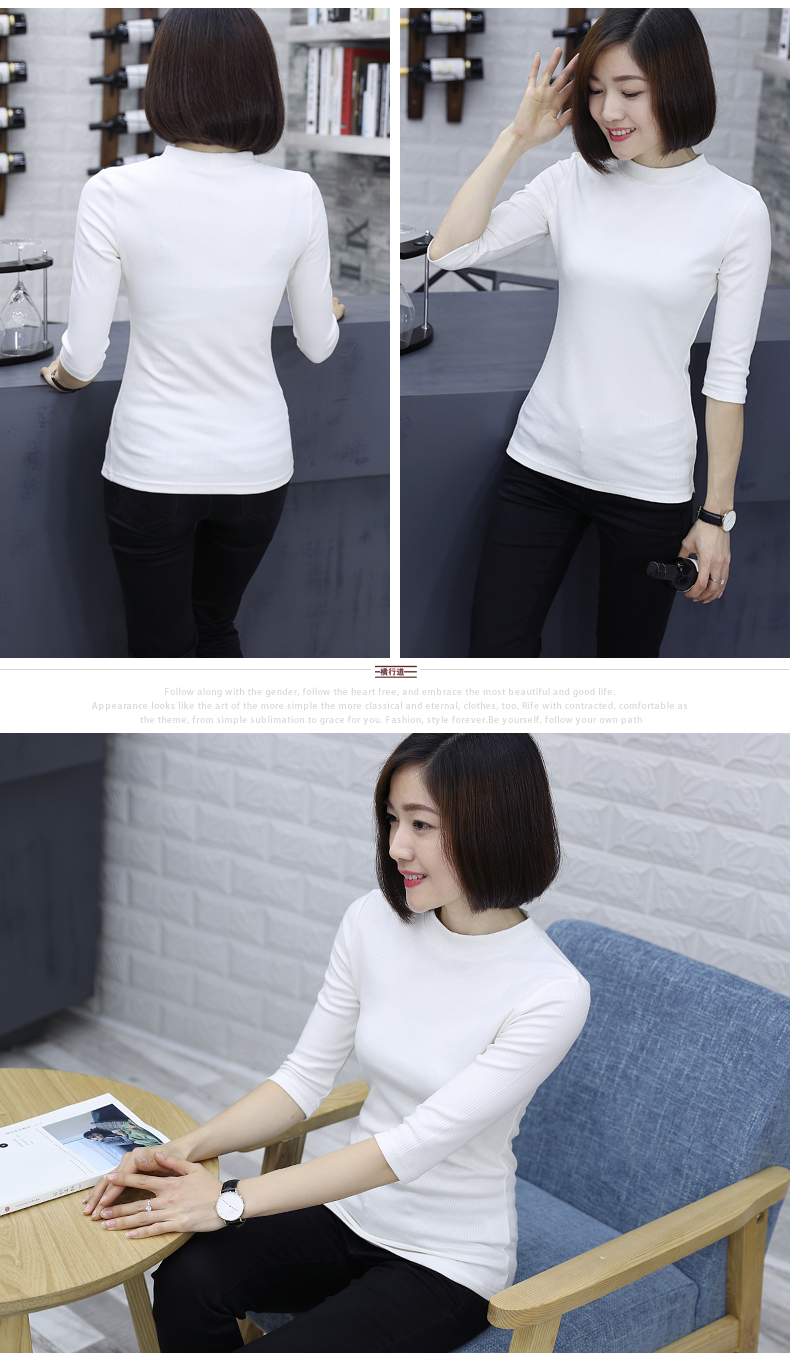 2019秋裝新款女裝半高領上衣服打底衫秋款七分袖中袖女士T恤純色1入