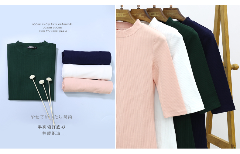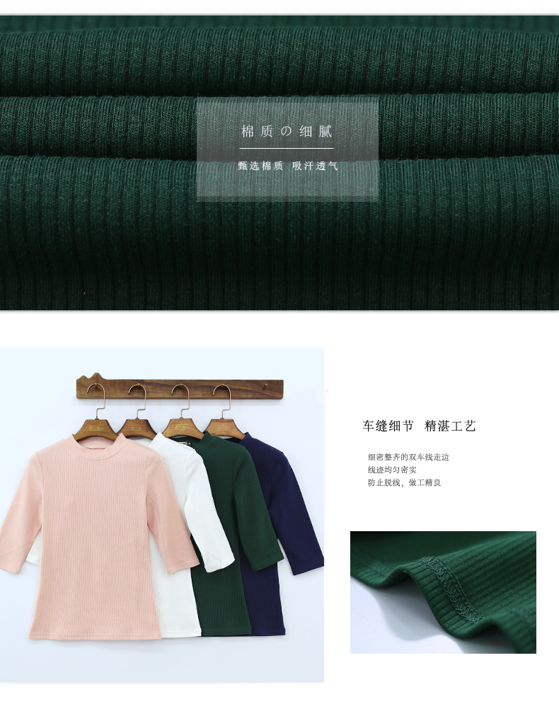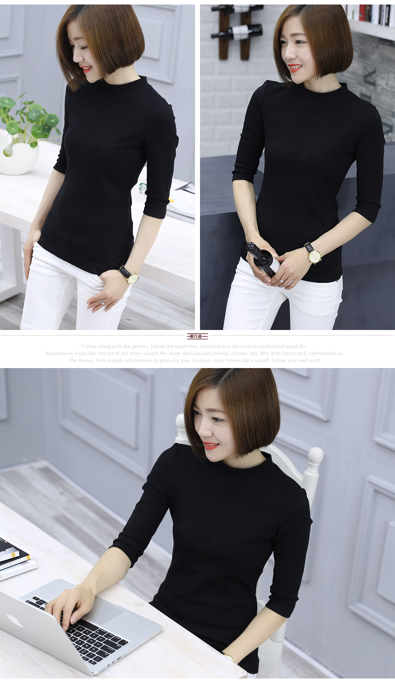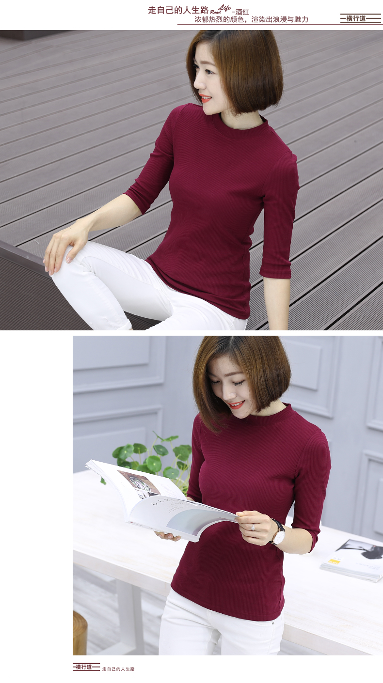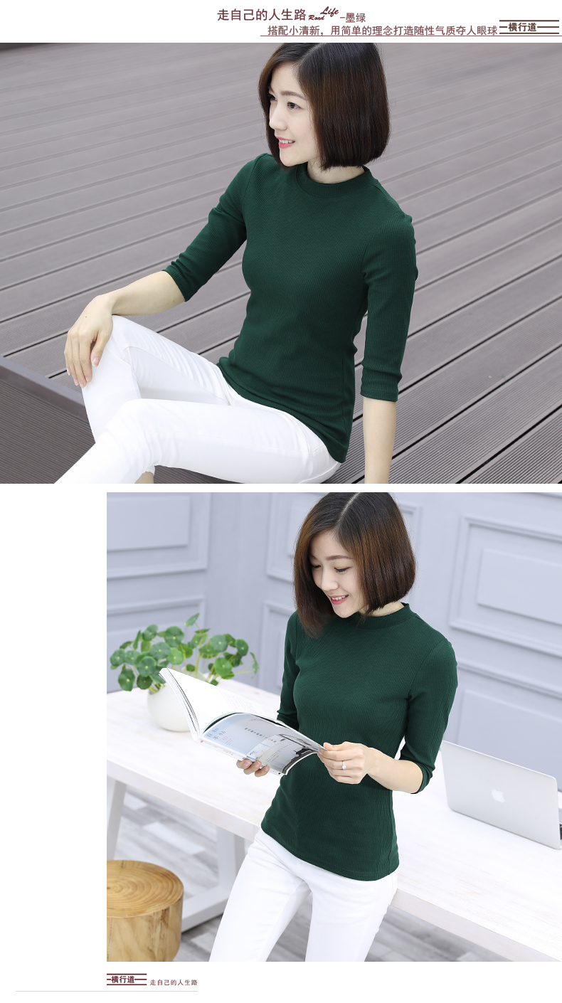 2019秋裝新款女裝半高領上衣服打底衫秋款七分袖中袖女士T恤純色1入