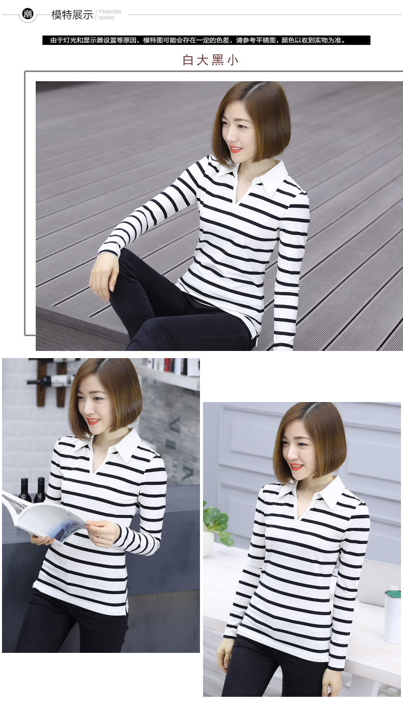 韓版黑白條紋長袖女t恤翻領打底衫襯衫領V領有領秋裝大碼女裝新款1入