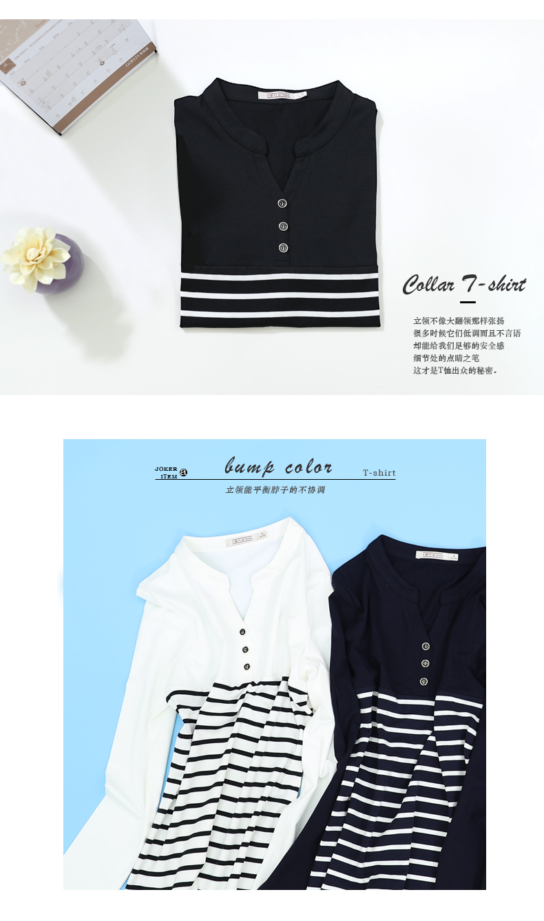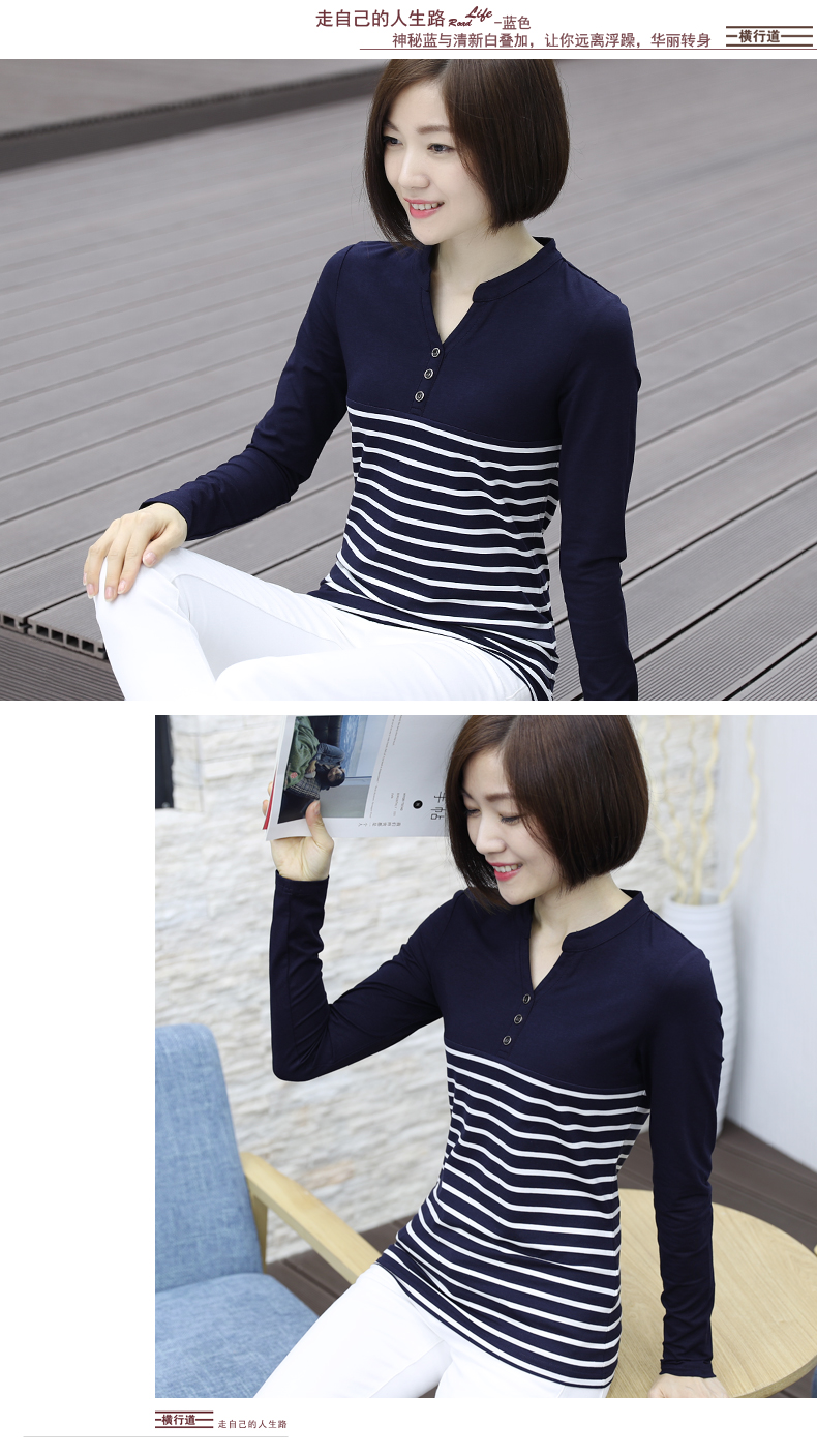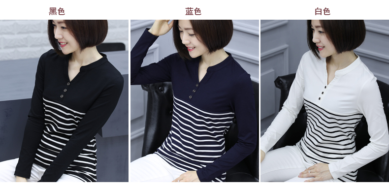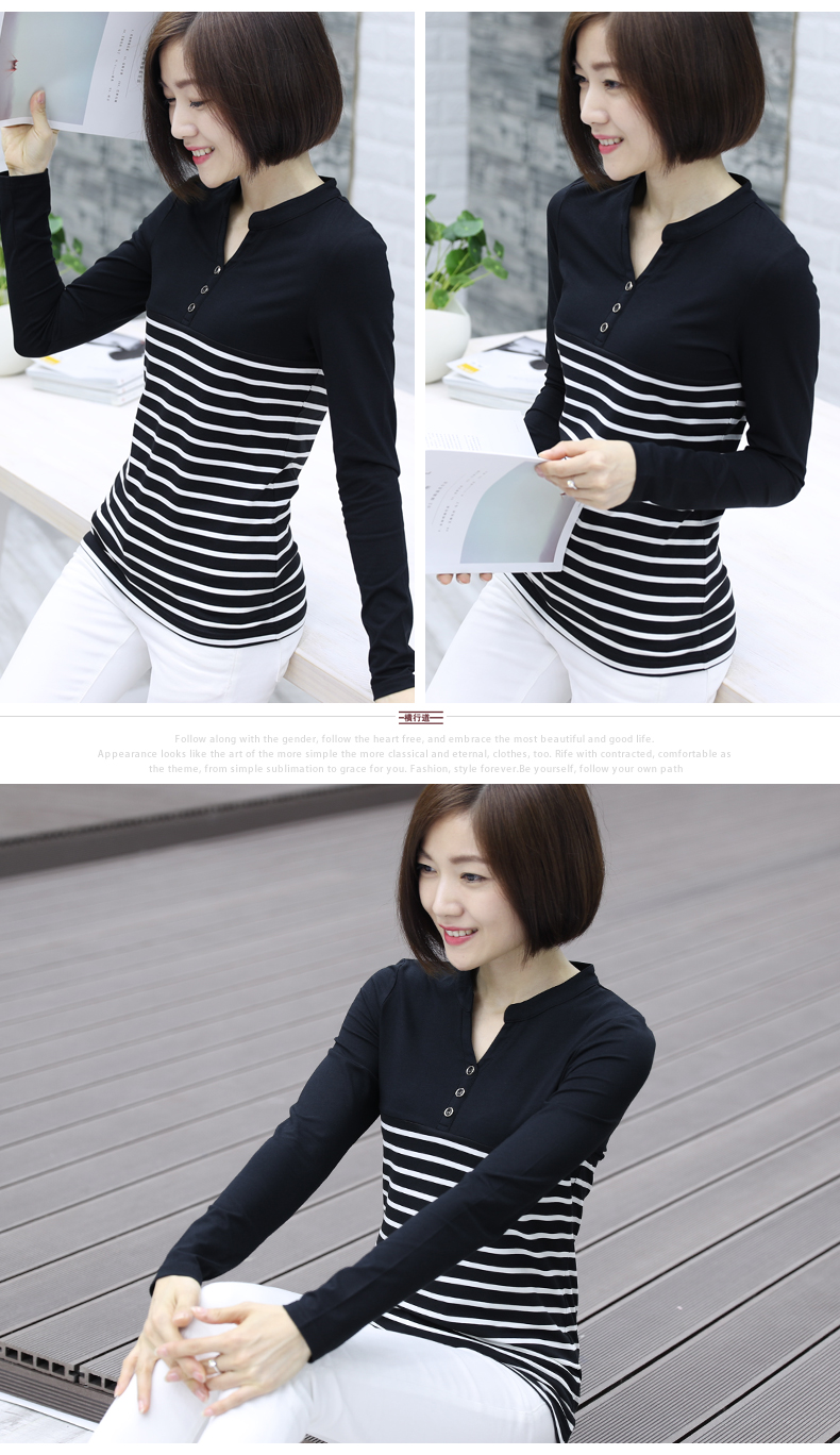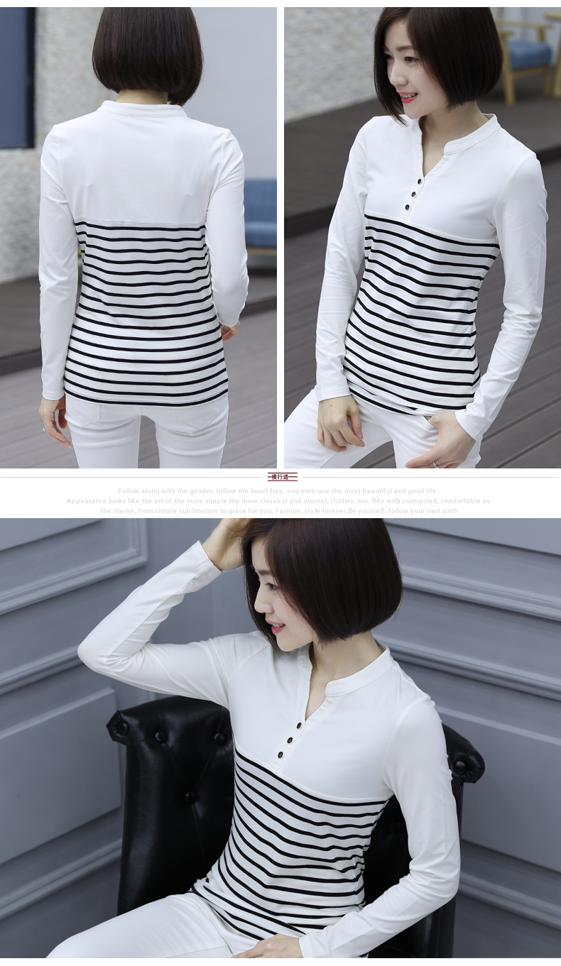 2019秋裝職業裝莫代爾棉女長袖立領t恤拼接黑白條紋休閑套頭上衣1入